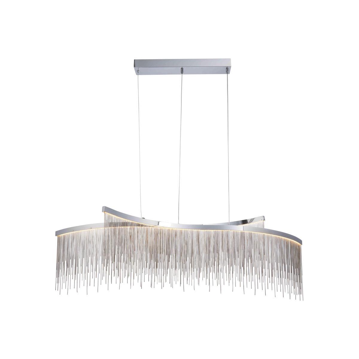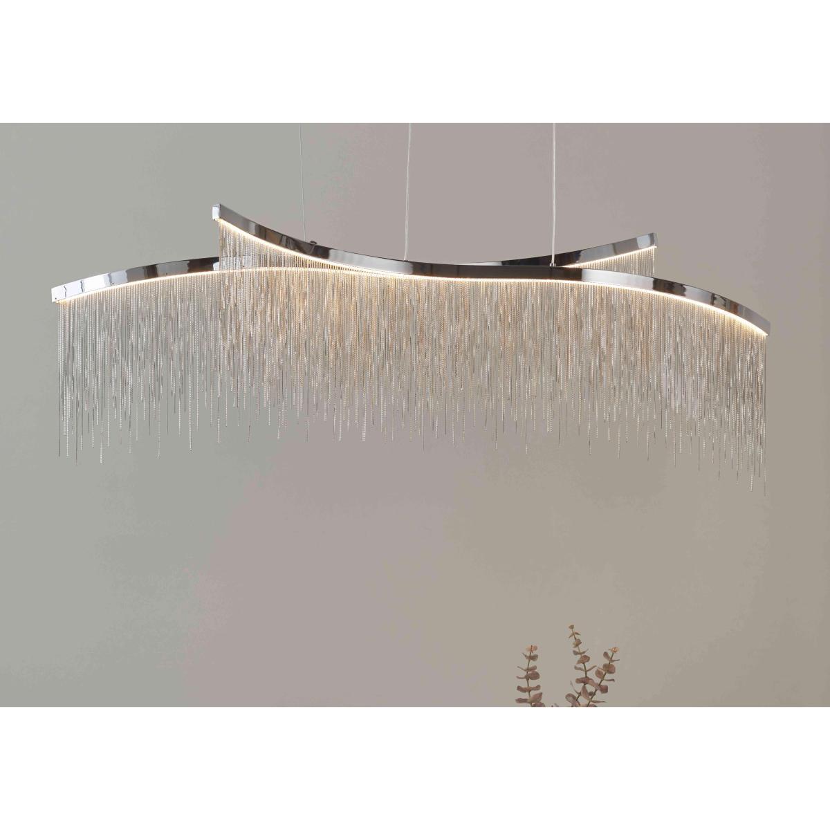 The Ophelia pendant is truly mesmerising. Its curved silhouette is elegant in every way. Why you'll love it. A stunning waterfall of fine silver chains. Contemporary design with a polished chrome finish. Creates a diffused light effect. Beautiful in bedrooms or over dining tables. Made with care for Furniture Village. What you need to know. Aluminium base. Chrome finish. Silver effect chains. SMD 2835 bulb required. Non-dimmable. Dimensions. Width: 118cm (47 inches). Depth: 25cm (10 inches). Height: 60cm (24 inches).