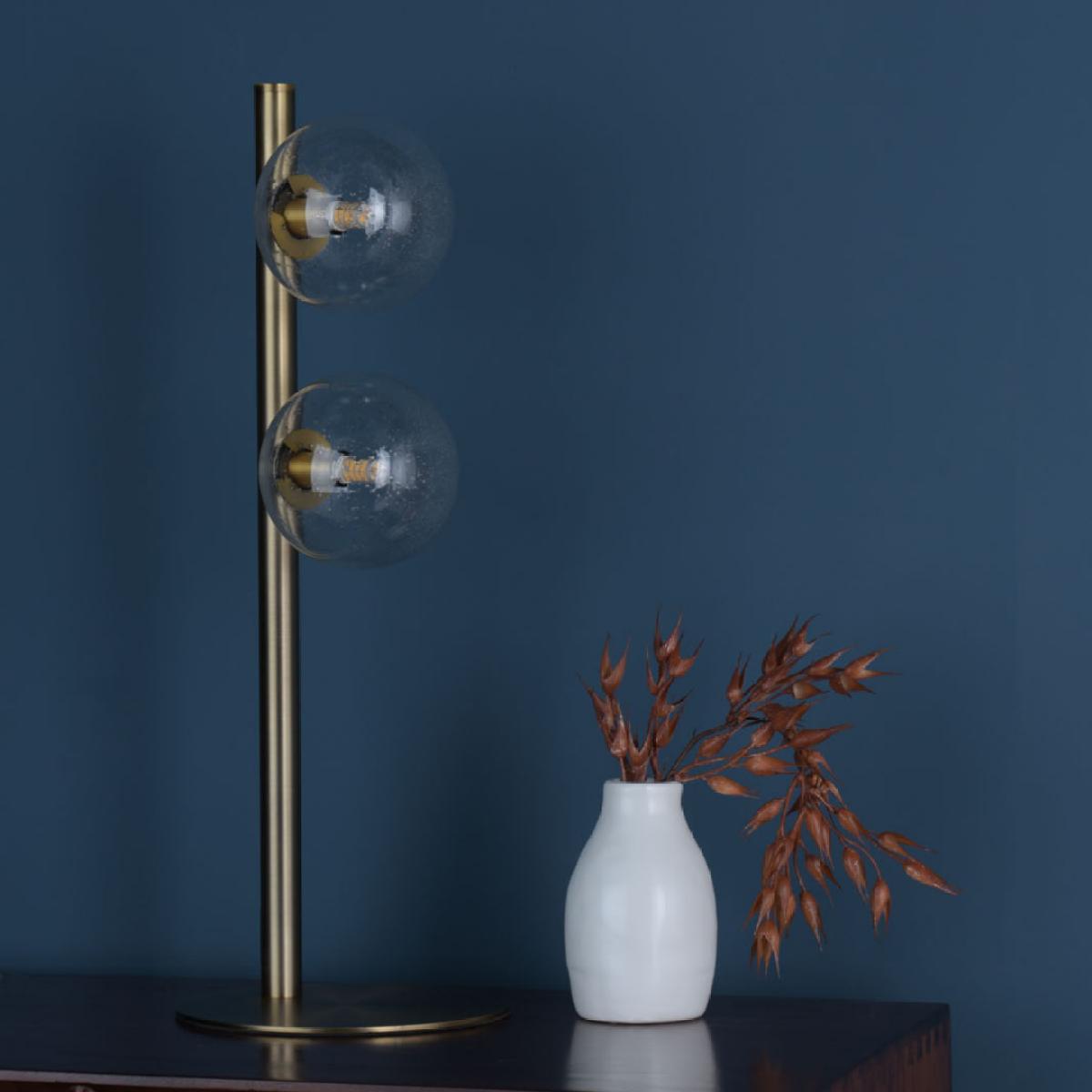 Is a stunning statement piece that blends contemporary style with timeless elegance. Finished in warm brass and paired with two clear glass globe shades, this sleek design adds a touch of luxury and sophistication to any interior. Perfect for side tables, consoles, or bedside settings, the Ophelia casts a soft, warm glow while elevating your décor with its modern sculptural form.