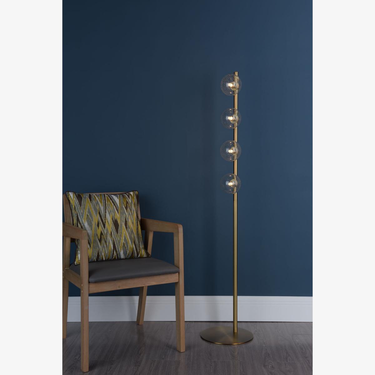 Is a striking contemporary piece that combines elegance with modern flair. Finished in warm brass and featuring four clear glass globe shades, this lamp delivers both style and sophistication, making it a stunning addition to any room. Its slim, vertical frame and minimalist design allow it to fit seamlessly into living rooms, bedrooms, or reading corners, while the multi-light feature provides a beautiful, even glow.