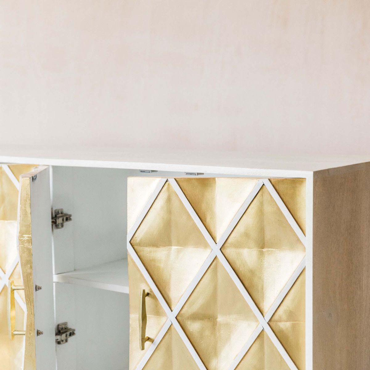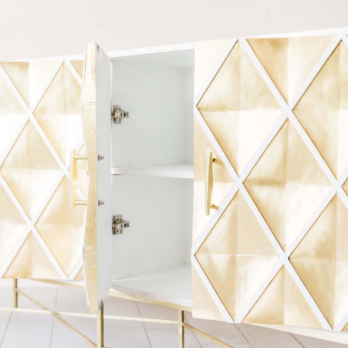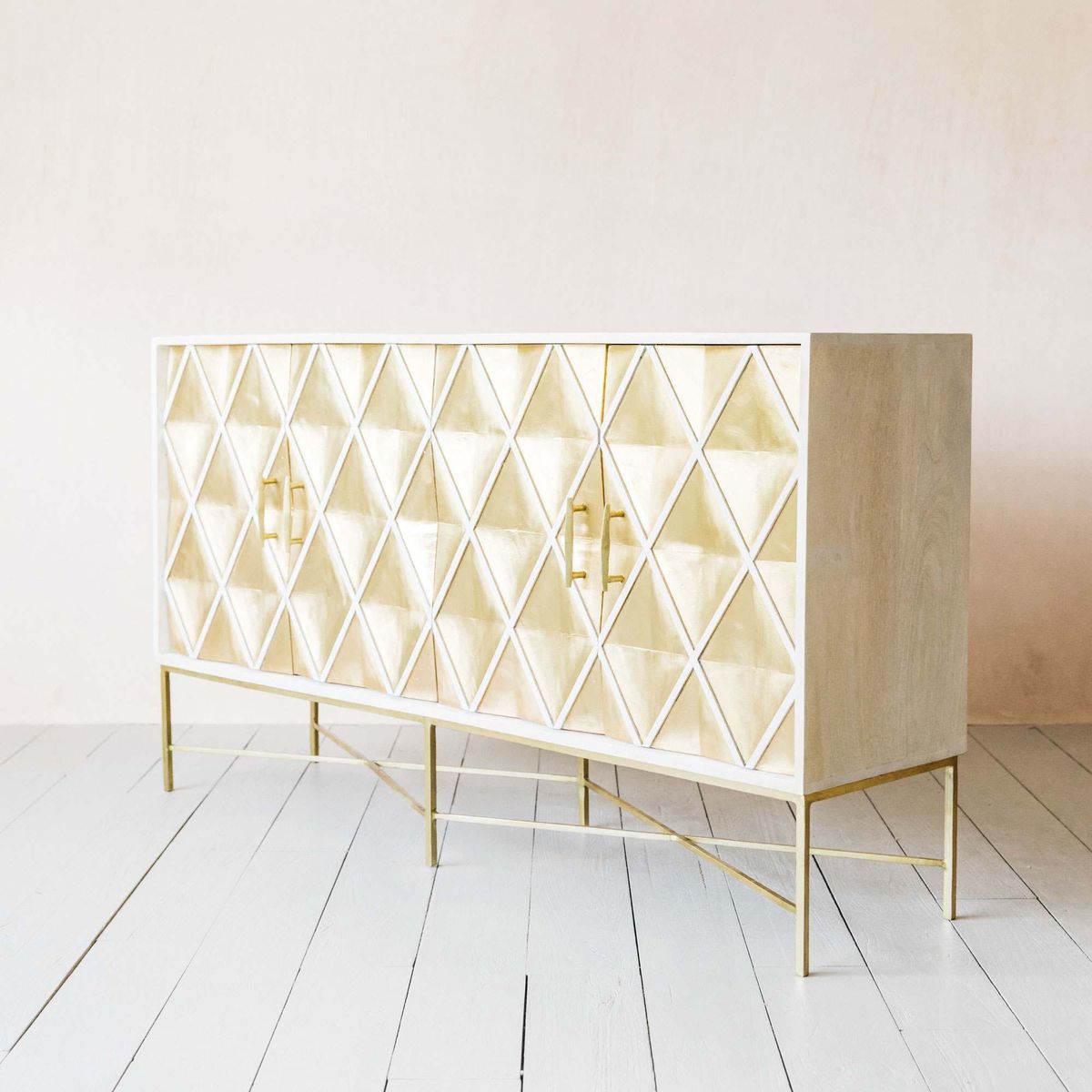 Handcrafted by talented artisans, our Ophelia sideboard is made of mango wood with a whitewashed finish and brass sheet wrap. Featuring four doors with a textured diamond design and sleek cross-style legs, this oversized sideboard is an opulent storage solution. H85 x W152 x D38cm. Made of mango wood and brass. Features four doors. Brass naturally changes colour when exposed to air and oils in skin. To restore sheen, polish with a brass cleaner or homemade paste, then buff. Due to the handmade nature of this product, size and colour may vary.