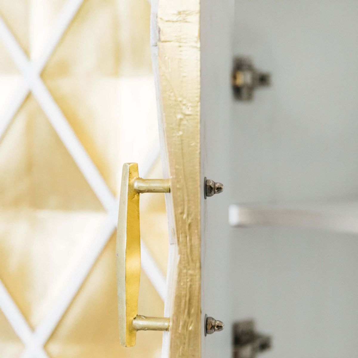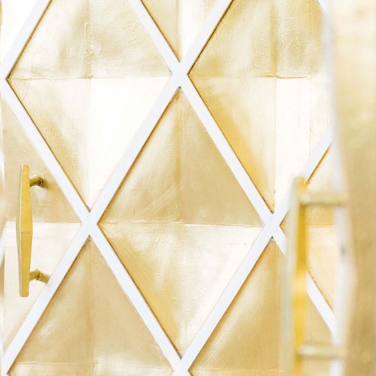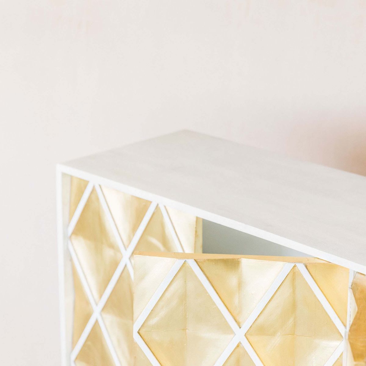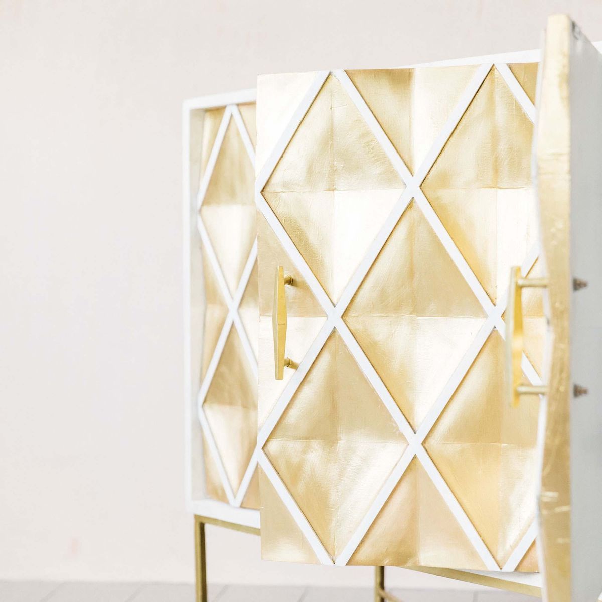 Handcrafted by talented artisans, our Ophelia sideboard is made of mango wood with a whitewashed finish and brass sheet wrap. Featuring four doors with a textured diamond design and sleek cross-style legs, this oversized sideboard is an opulent storage solution. H85 x W152 x D38cm. Made of mango wood and brass. Features four doors. Brass naturally changes colour when exposed to air and oils in skin. To restore sheen, polish with a brass cleaner or homemade paste, then buff. Due to the handmade nature of this product, size and colour may vary.