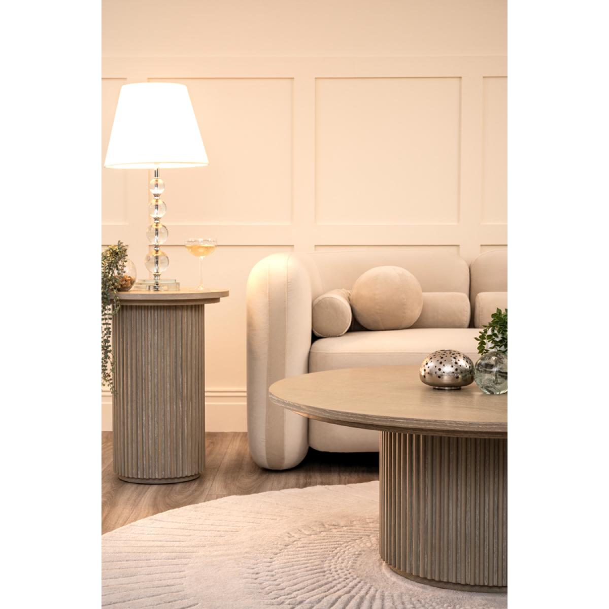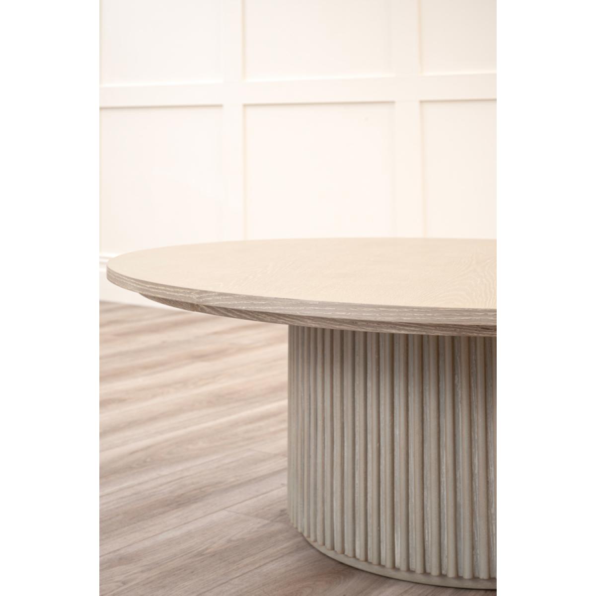 A stylish, contemporary coffee table inspired by the Japandi design style. Substantial weighted wooden base with elegant reeding detail. Finished in a warm grey washed oak veneer. Minimal assembly required, simply attach the top to the base.