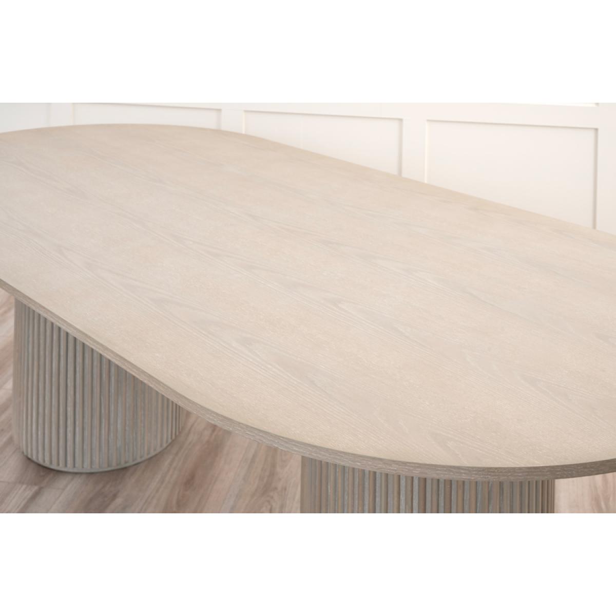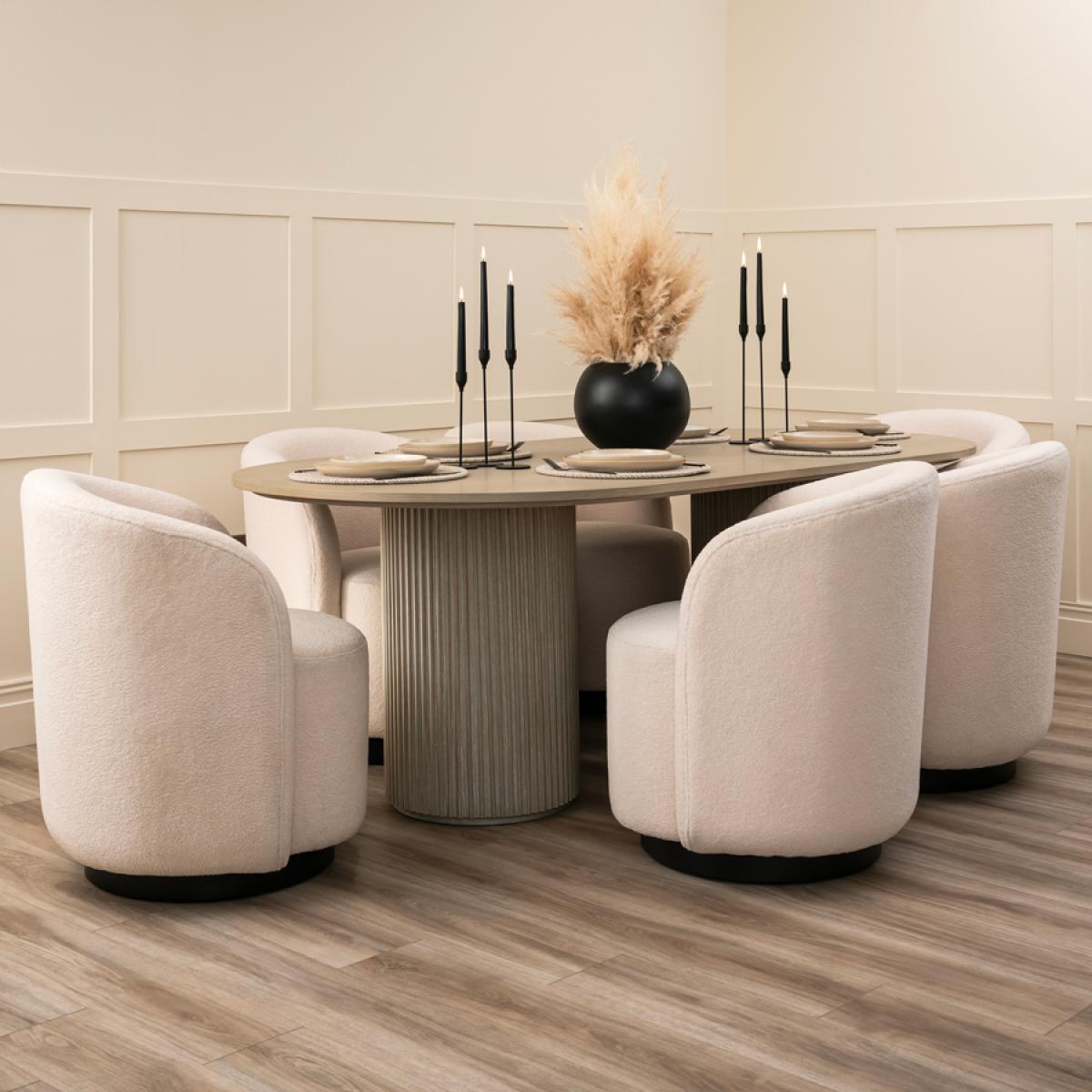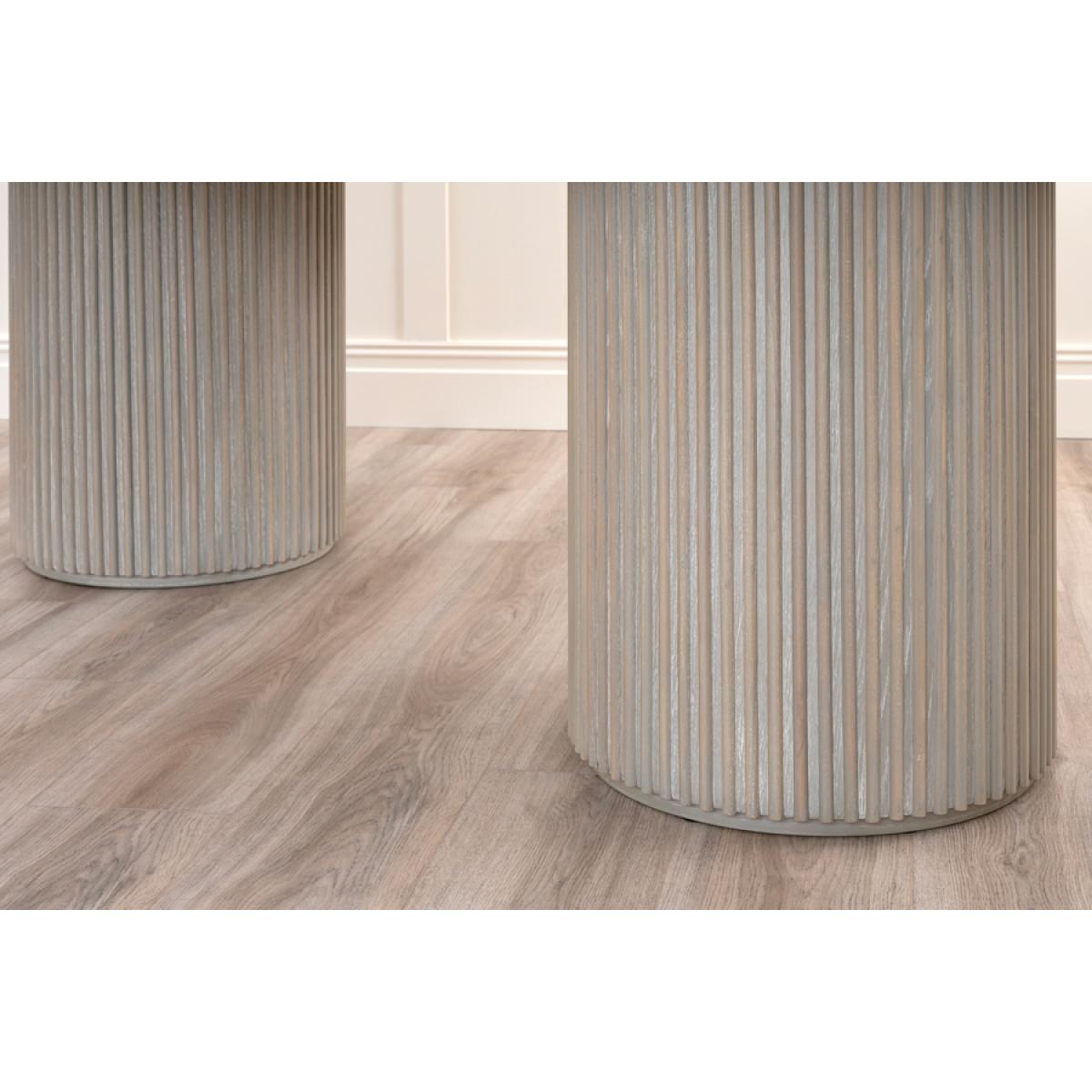 A stylish, contemporary dining table inspired by the Japandi design style. Substantial weighted wooden pedestal legs with elegant reeding detail. Finished in a warm grey washed oak veneer. Generous proportions - will comfortably seat six people. Two person assembly required.