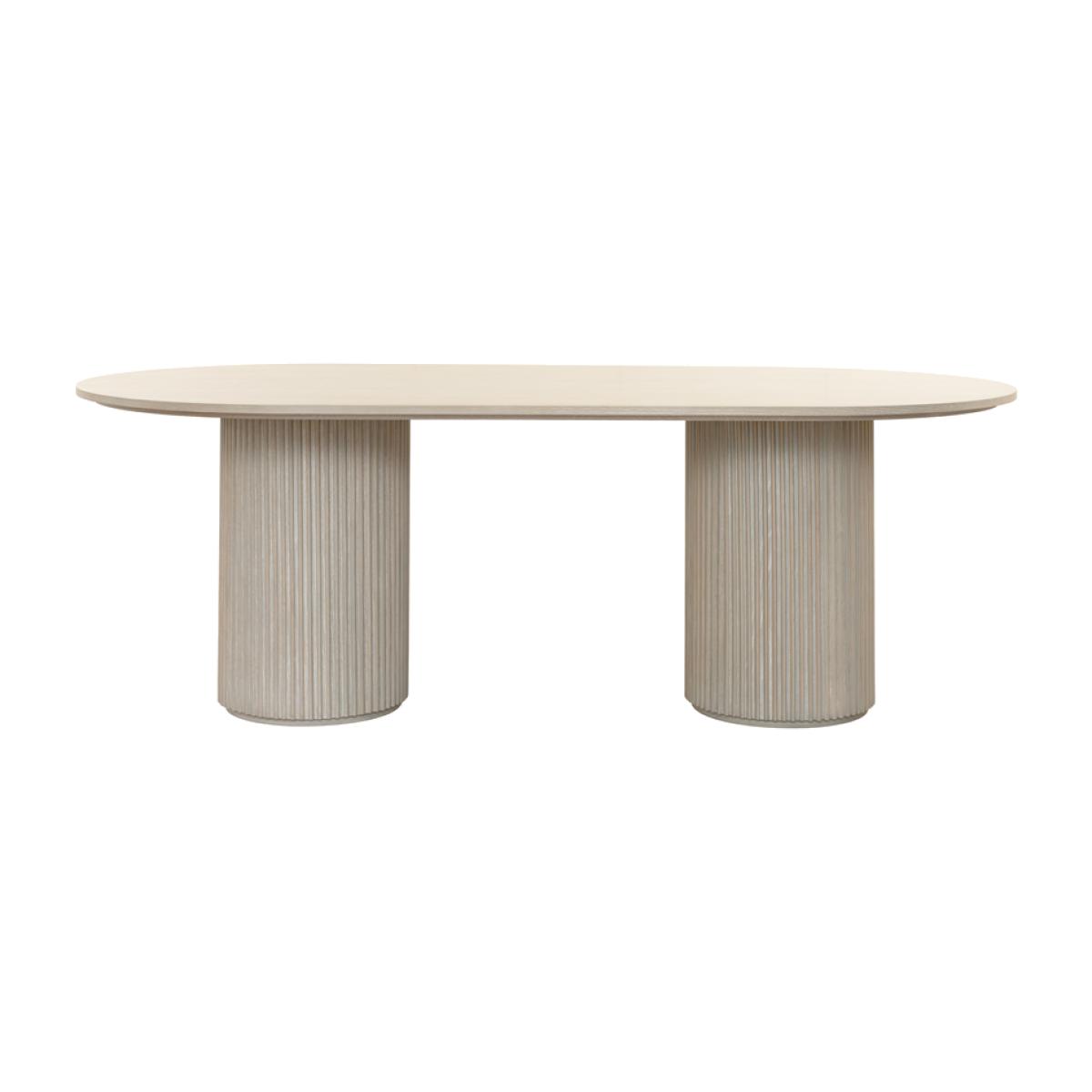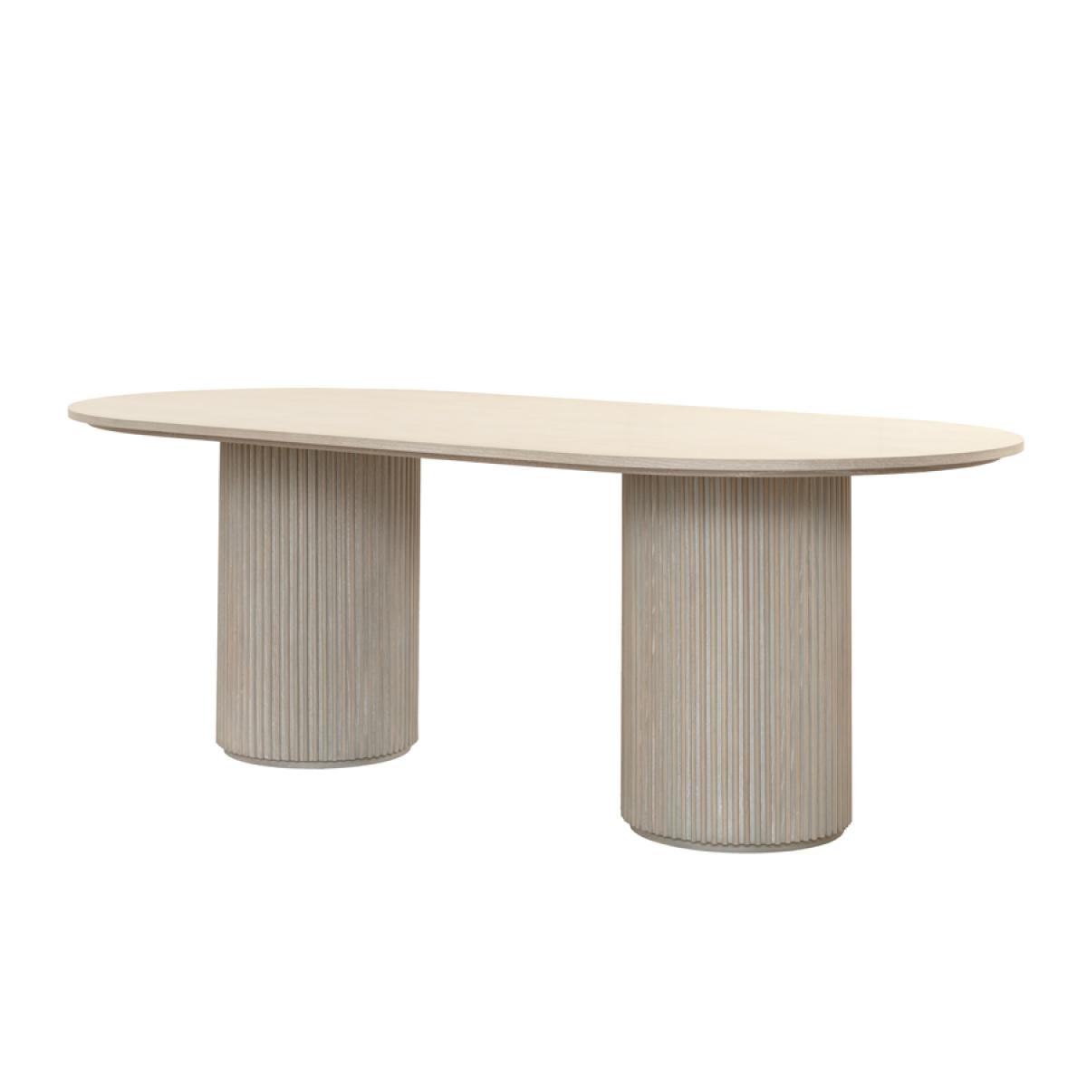I’m a fan of the Ophelia table for its clean-lined, cylindrical base and soft grey-wash finish - it brings a sculptural yet unfussy presence to a room. It sits beautifully in Scandi-inspired or modern-coastal schemes, but also works equally well in pared-back contemporary and muted industrial spaces. For styling, pair with simple upholstered or woven-seat chairs in neutral tones, and hang a single, minimalist pendant above to highlight its oval top. Keep your table décor low and textural - think a row of stoneware vases or a shallow bowl of seasonal foliage - so the table’s form remains the focal point.