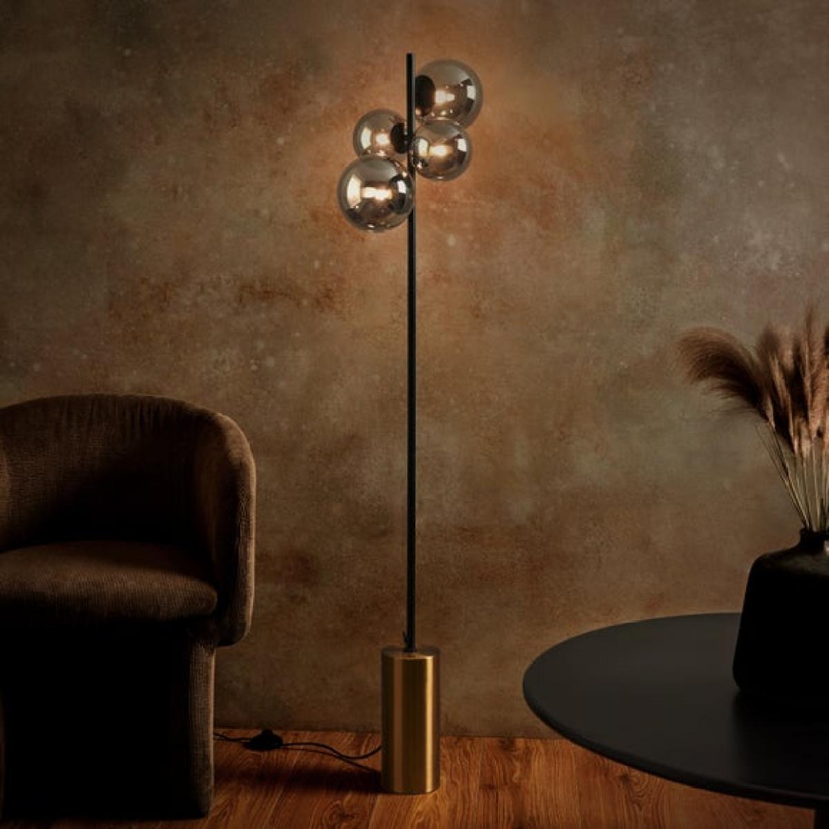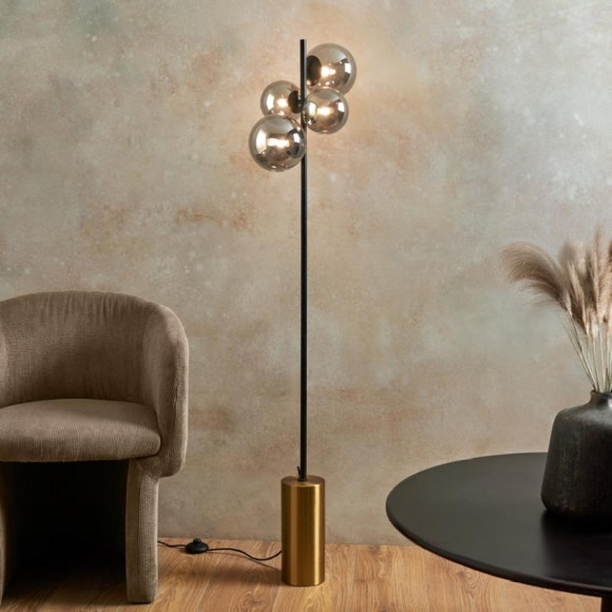 * Stylish, Modern Design * Convenient Foot Switch * Compatible with Energy Efficient G9 LED Lamps * Matching Items Available Part of the Lighting Edit Range, the Ophir 4 Light Floor Lamp blends warm brushed brass and black paint with four smoke-plated glass shades. It features a black braided cable with a foot switch and is compatible with energy-efficient G9 LED lamps. Matching items available separately.