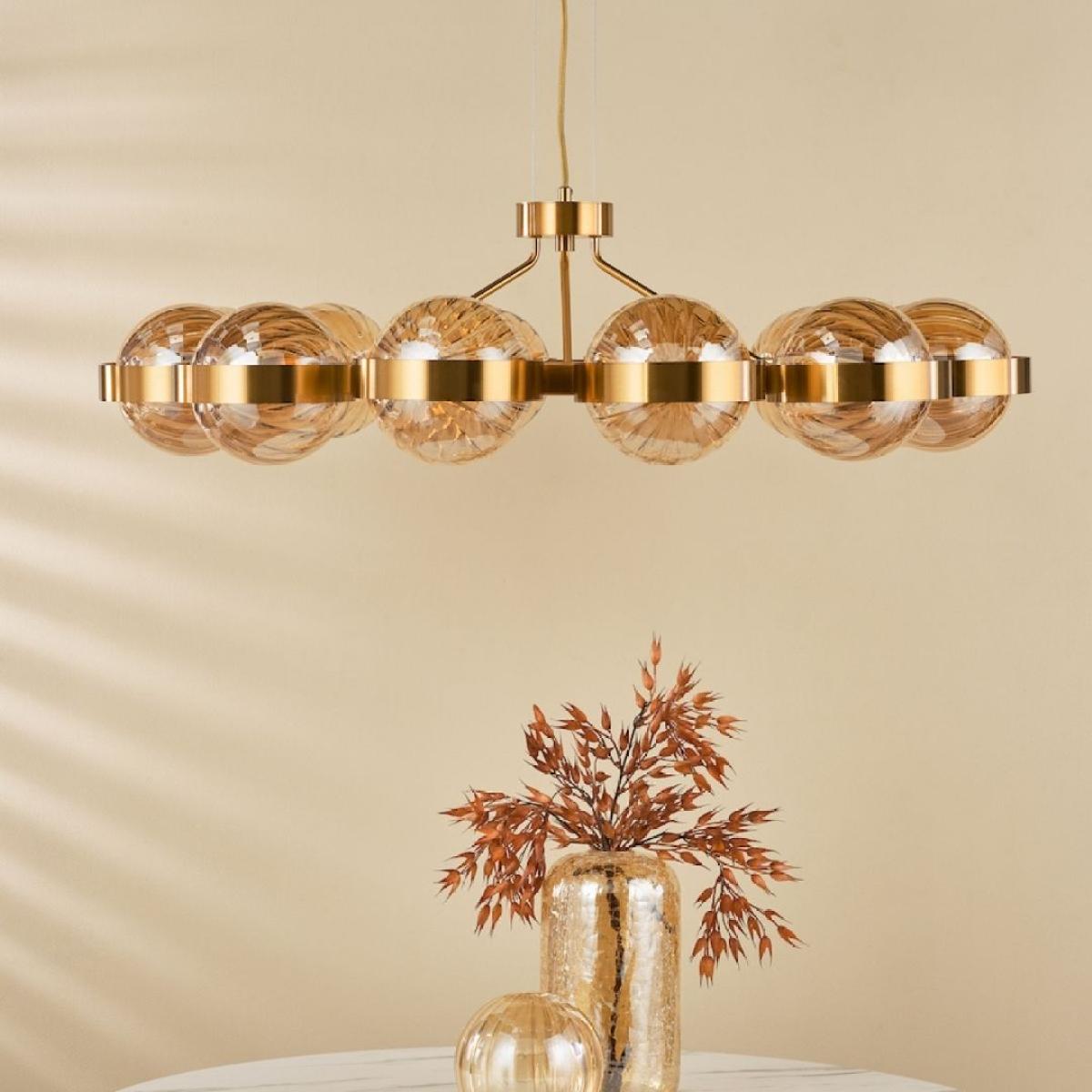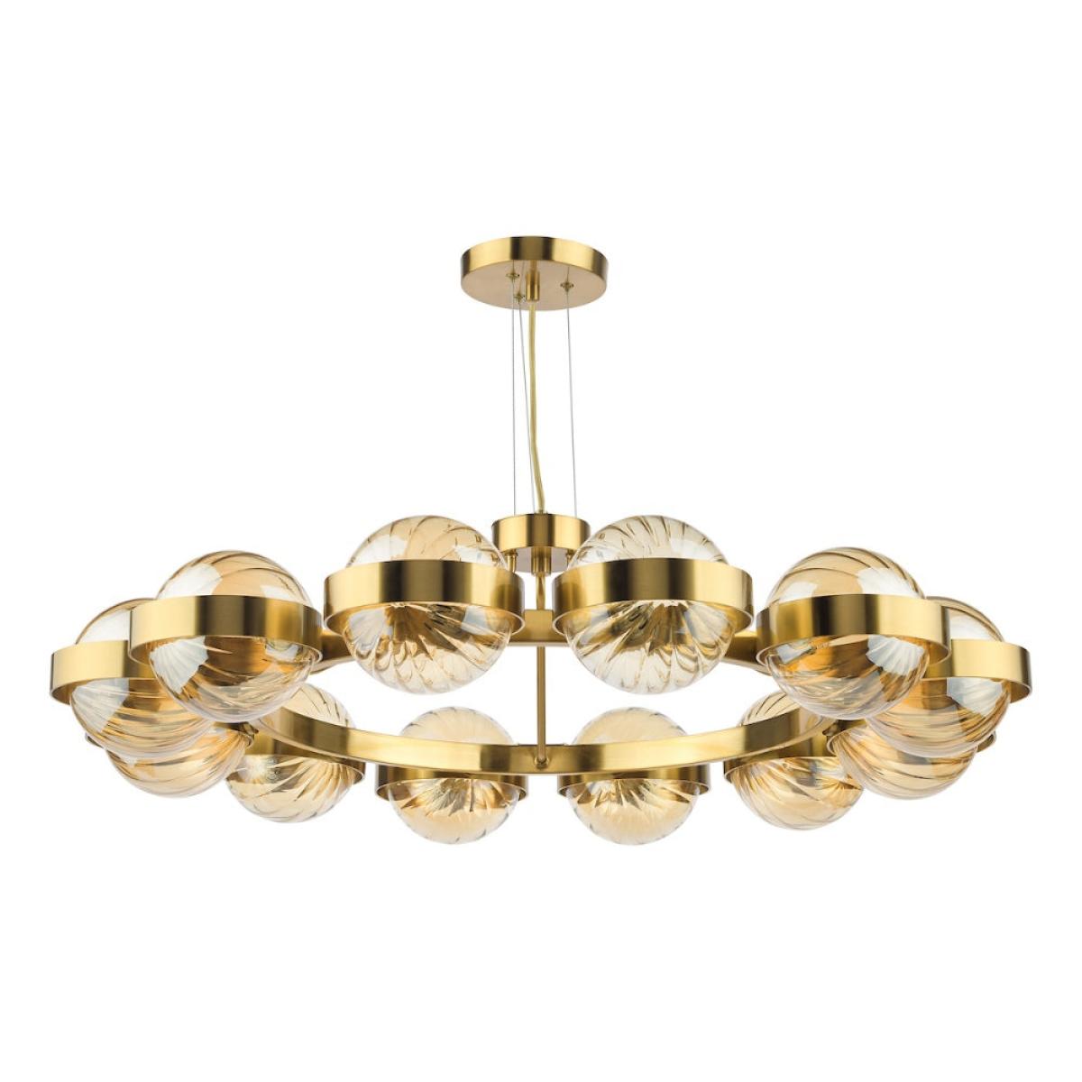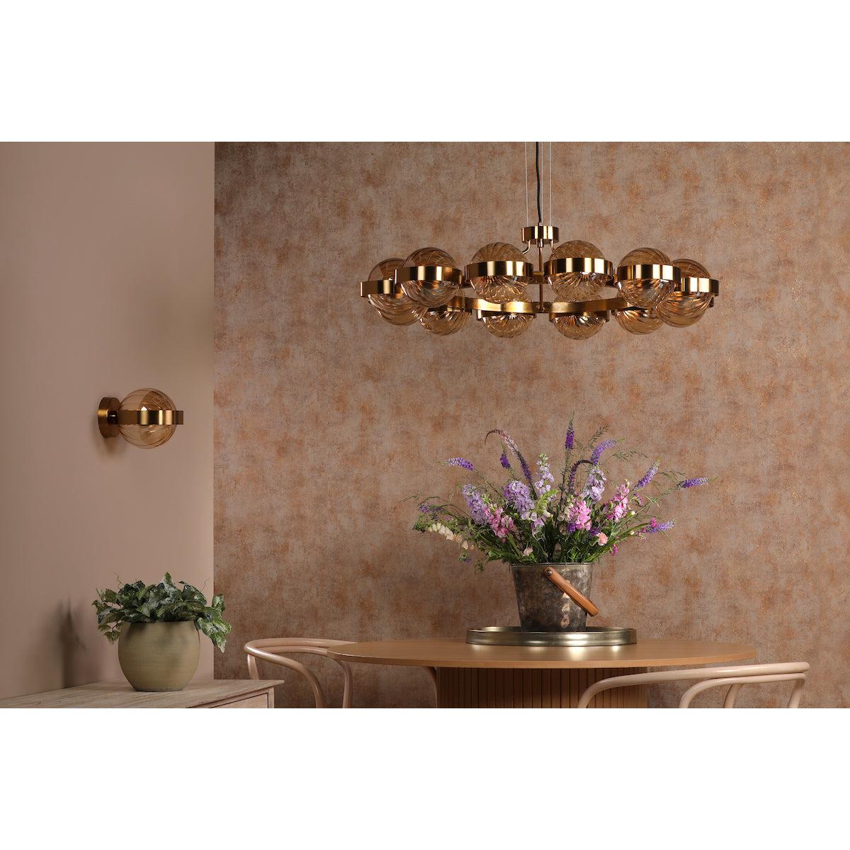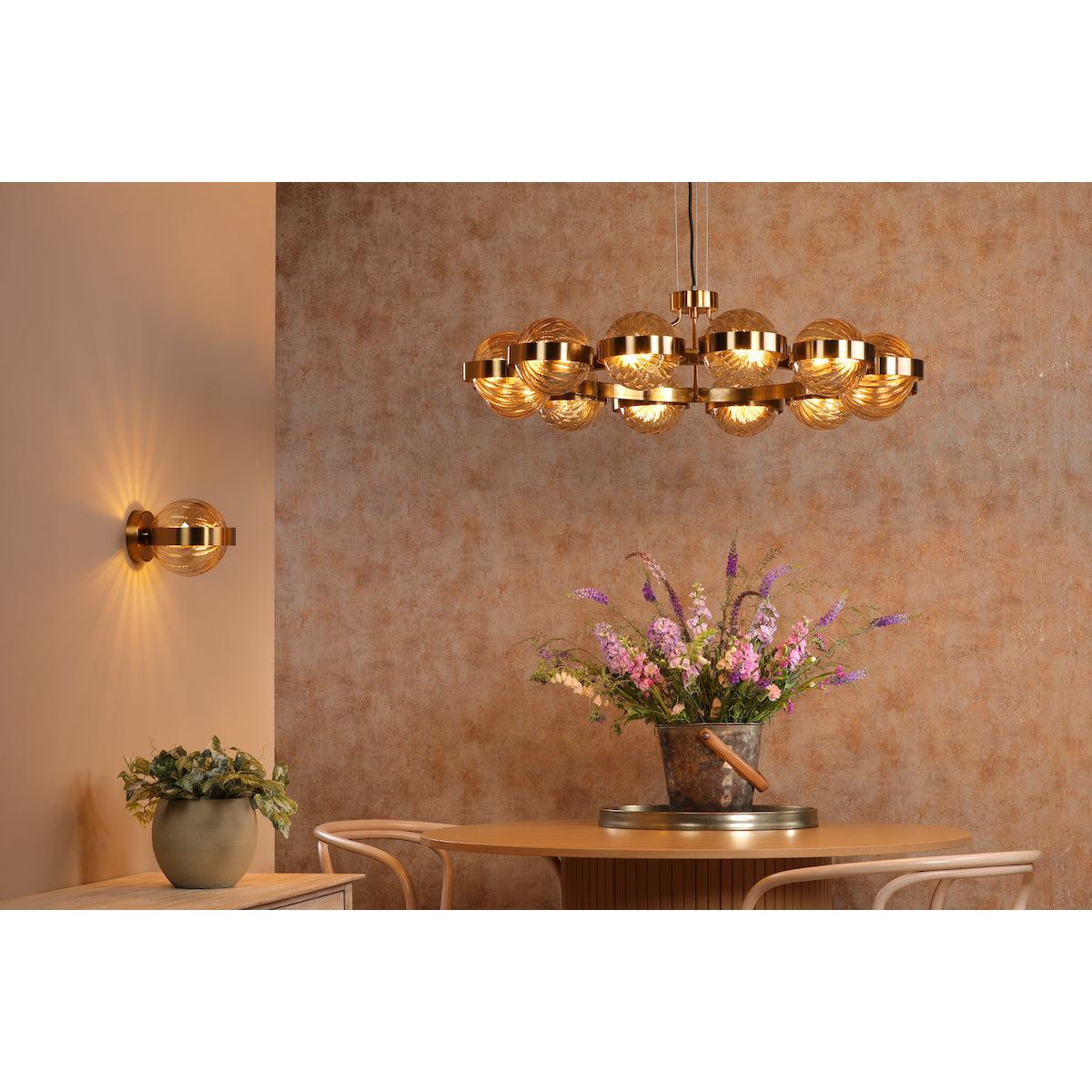 The Ophira 12-Light Antique Gold Pendant is a grand chandelier finished in antique gold, featuring twelve amber ripple glass shades that soften and scatter the light with elegance. The perfectly symmetrical arms create balance and refinement, while the scale makes it ideal for large stairwells, open-plan rooms or impressive entrances. Combining aged metallic tones with delicately crafted glass, the Ophira offers both timeless style and modern sophistication. A striking centrepiece, it brings architectural presence and quiet luxury to discerning interiors. Product dimensions: H26.5xDia9. 4 cm Adjustable drop at the time of installation - 250 to 33 cm (including the shade height) Dimmable Requires 12x G9 bulbs