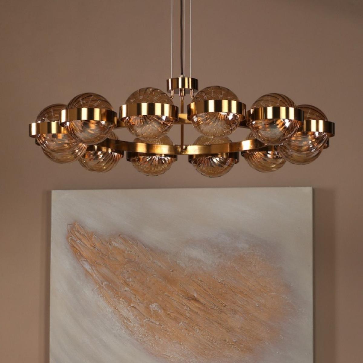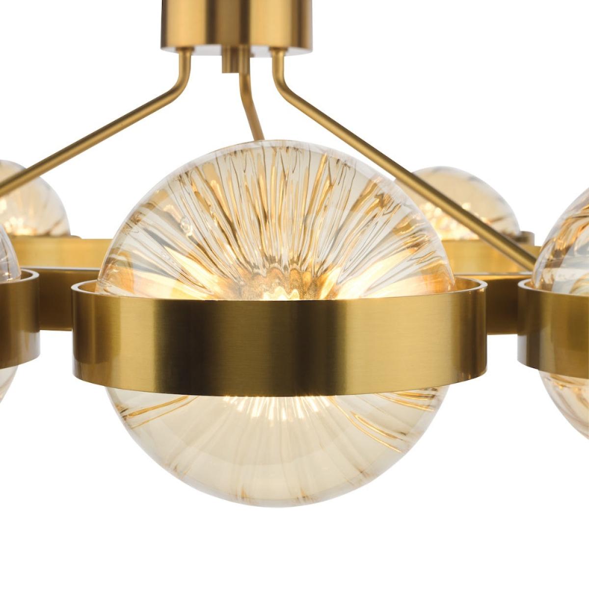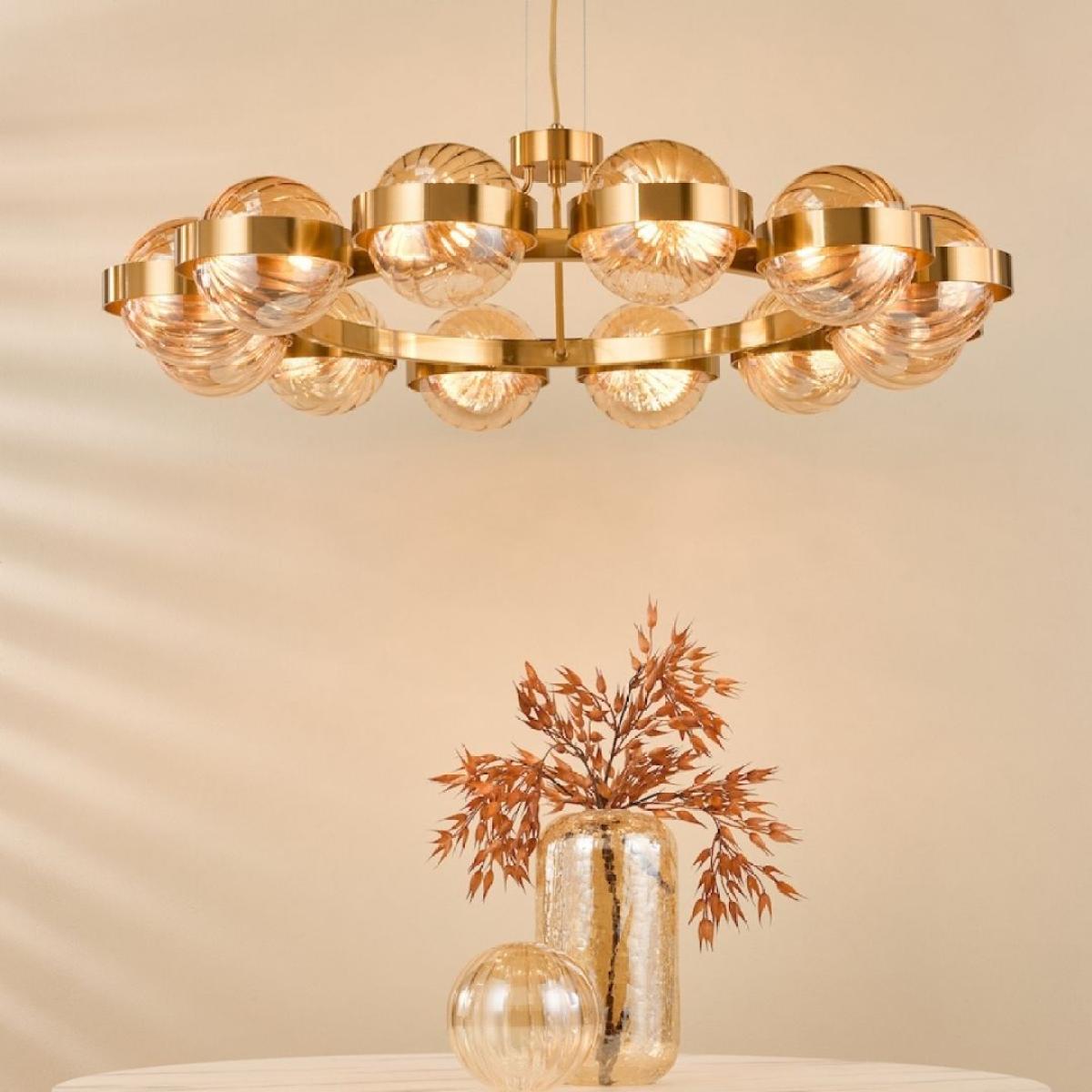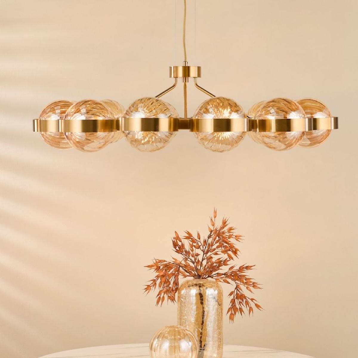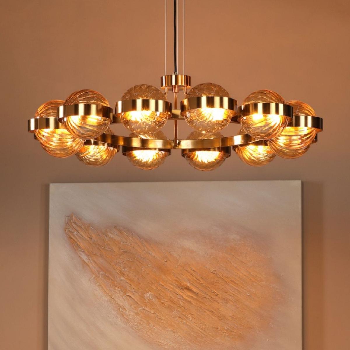 The Ophira 12-Light Antique Gold Pendant is a grand chandelier finished in antique gold, featuring twelve amber ripple glass shades that soften and scatter the light with elegance. The perfectly symmetrical arms create balance and refinement, while the scale makes it ideal for large stairwells, open-plan rooms or impressive entrances. Combining aged metallic tones with delicately crafted glass, the Ophira offers both timeless style and modern sophistication. A striking centrepiece, it brings architectural presence and quiet luxury to discerning interiors. Product dimensions: H26.5xDia9. 4 cm Adjustable drop at the time of installation - 250 to 33 cm (including the shade height) Dimmable Requires 12x G9 bulbs