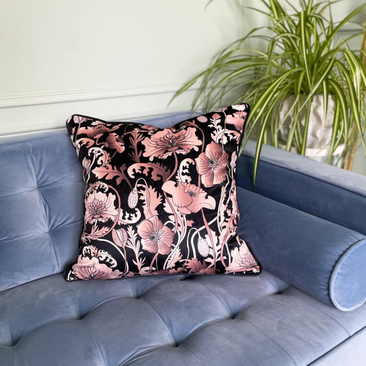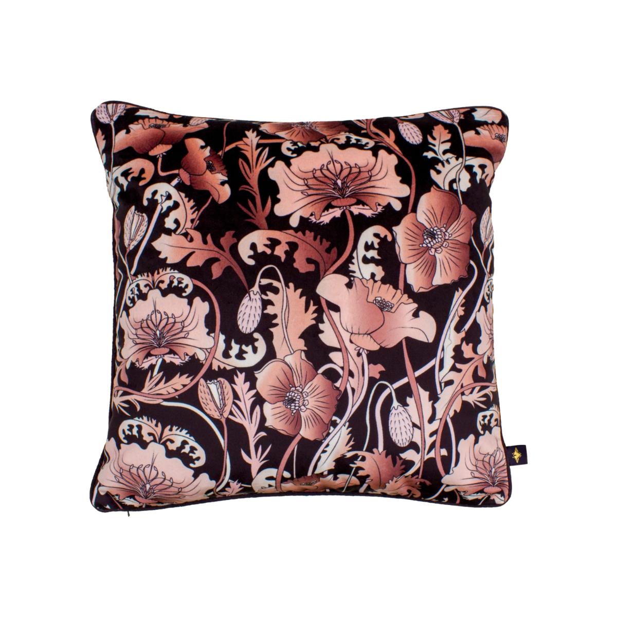 Introducing ‘Opium Blush’, an entangled spectacle of Papaver somniferum, or opium poppy as it’s more commonly known, in contrasting shades of delicate and dark pink. Curiously converging the “sleep bringing” origins of the poppy with the aesthetics of the decadent Art Nouveau period, this British made soft velvet cushion demands to be luxuriated on. Our luxurious and shimmering velvet cushions are handmade in the UK, featuring our dazzling pattern on both sides, accentuated with black velvet piping detail, and finished off with a hidden zipper.