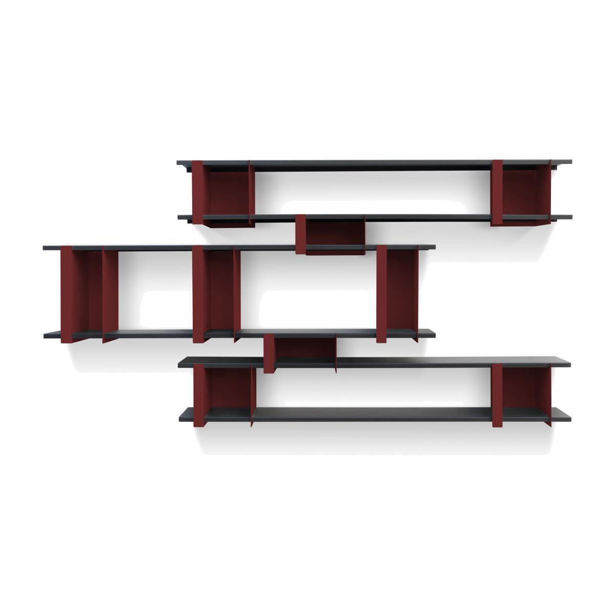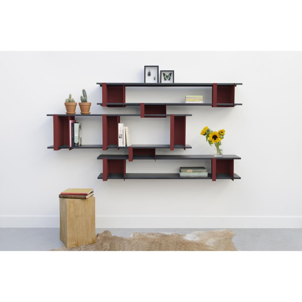 An industrial, graphic look for these steel shelves. Highly modular, Opli shelves let you create beautiful wall scenographies. This system consists of shelves (L 149 cm) on which module-dividers fit together to punctuate the space and act as bookends. These colourful boxes also serve as a frame for displaying your favourite objects and books. Installing the modules on the shelves is easy, requiring no tools or glue. You can choose your own arrangement for the modules to obtain a unique wall composition. This leaves you free to create your own unique forms: unstructured or aligned composition. Opli shelves are based on a subtle play that mixes fantasy and sobriety. They’re perfect for storing, holding, displaying. They fit in anywhere: kitchen, bathroom, living room, bedroom or entrance. The Opli 3 shelf is made in France. This set includes: - 6 shelves (L 149 cm) - 9 separator-modules: - 3 x large modules: L 16 x Depth 24. 5 cm x H 37 cm - 4 x medium modules: L 22 x Depth 24. 5 cm x H 24 cm - 2 x small modules: L 27 x Depth 24. 5 cm x H 15 cm.