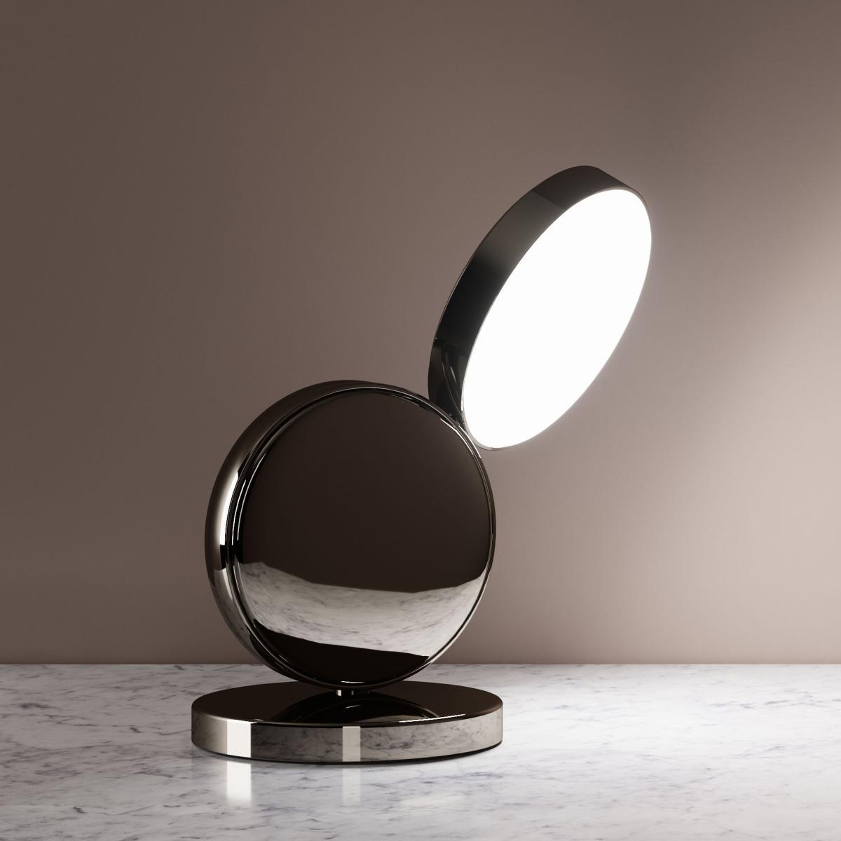 The round, graphic Optunia silhouette is evocative of a Barbary fig. It is a table lamp created from two fully mobile discs. Each disc offers one luminous glass surface and another opaque metal surface. The Optunia owes its functionality to its discs which have 360 degrees of movement, allowing you to create a number of extraordinary lighting effects. The bottom disc turns on one axis while the upper disc turns on a second axis perpendicular to the first. This dual movement allows the Optunia to direct its light where you want it. You can choose between direct or indirect lighting.