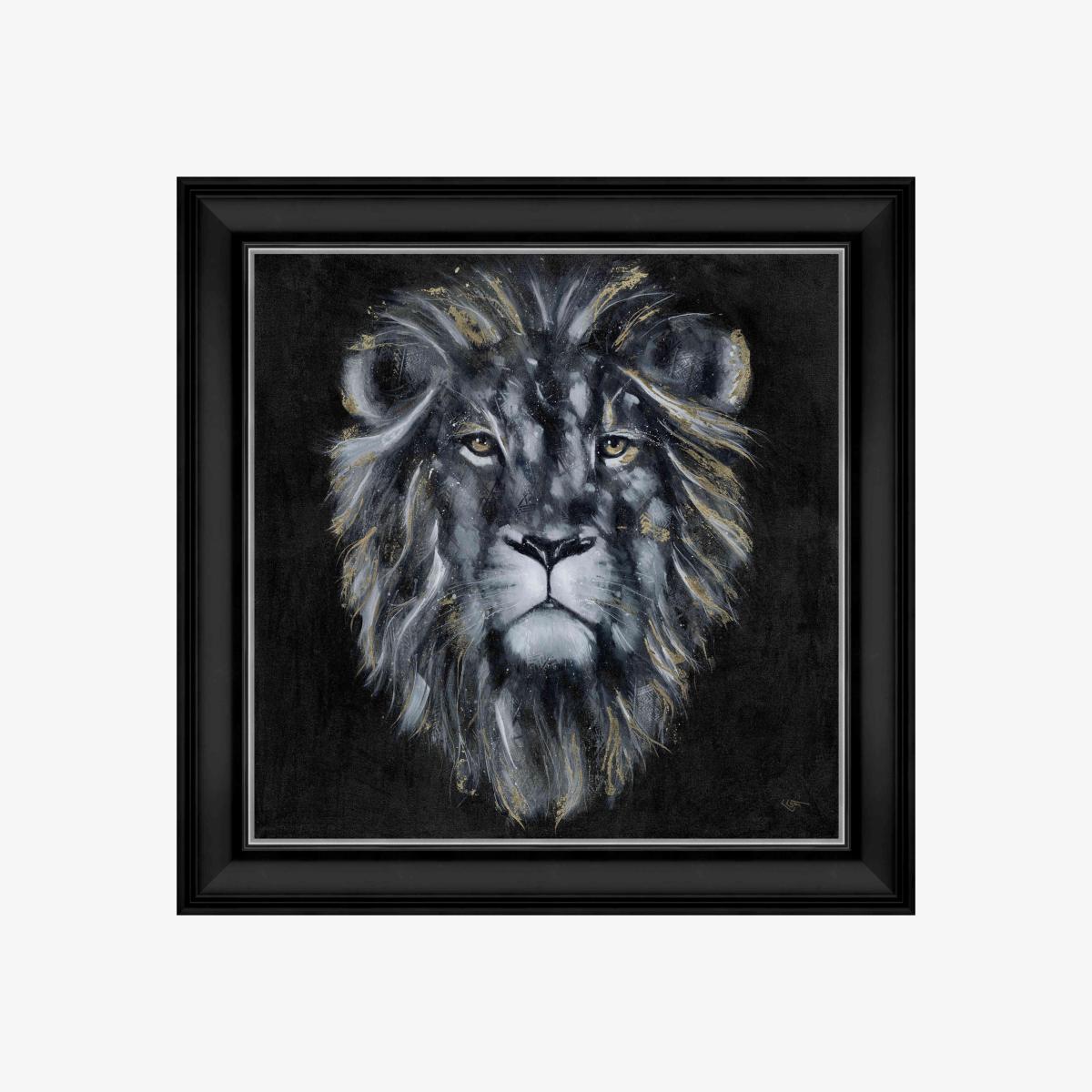 A striking monotone artwork depicting a handsome lion that’s perfect for a feature wall or hallway. Why you'll love it A bold and visually arresting modern artwork. Monotone black, white and grey with metallic gold highlights. Reproduced from original artwork by Louise Luton. Hand-finished with acrylic paint for a dynamic textured look. Ornate premium black frame with inner silver-toned frame accent border. Made in the UK. This framed picture is part of the Furniture Village home accessories collection. What you need to know Supplied with a metal hanging fitting and nylon cord. Indoor use only. Dimensions Height: 96 cm (38 in). Depth: 5 cm (2 in). Width: 96 cm (38 in).
