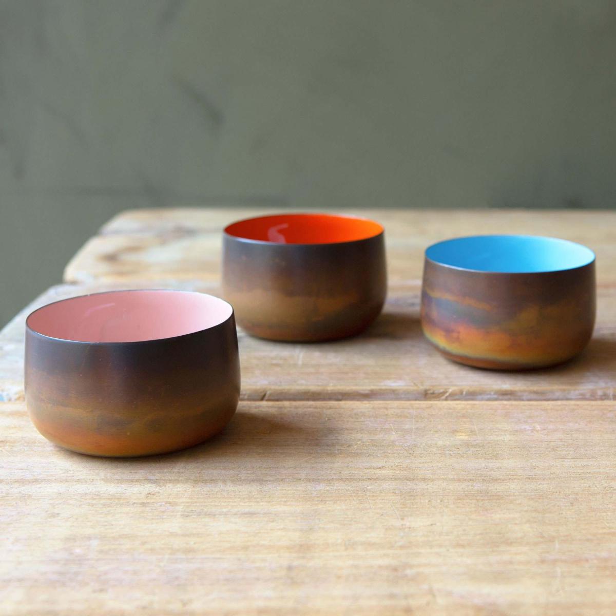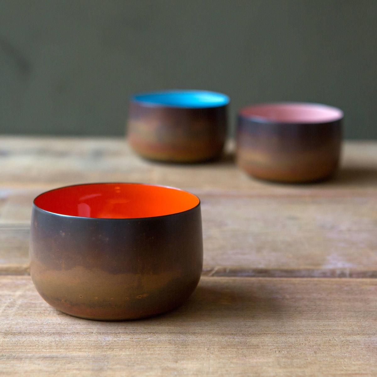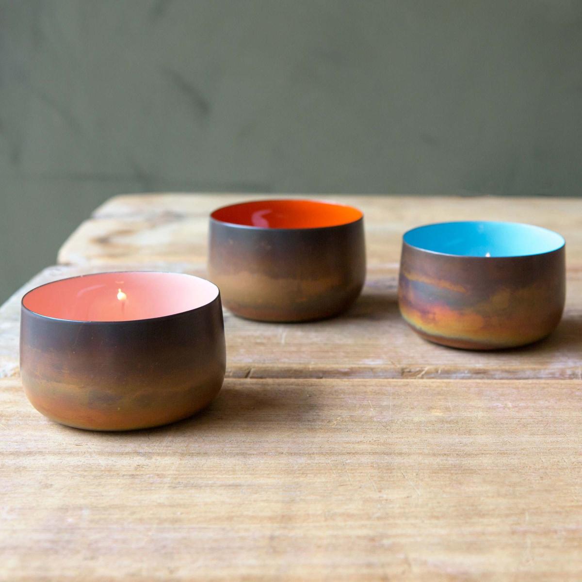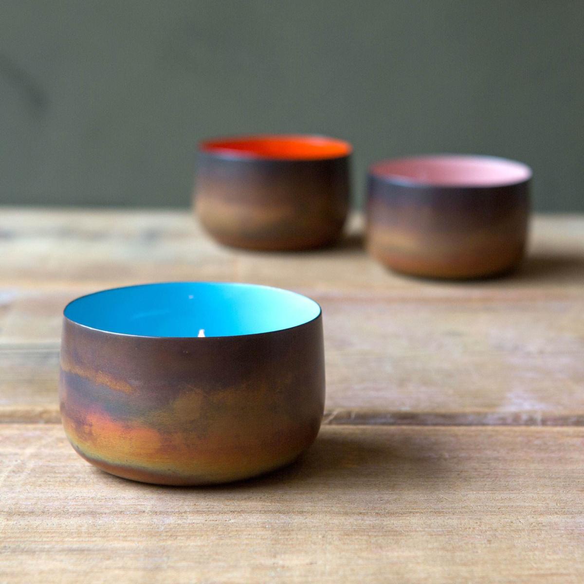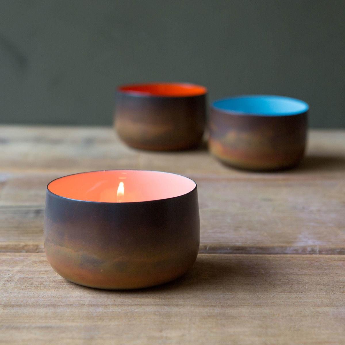 Traditional copper tea light holders with a twist! Small shallow holders with a burnt copper exterior and a brightly coloured interior, with a pop of either orange, blue or red enamel.