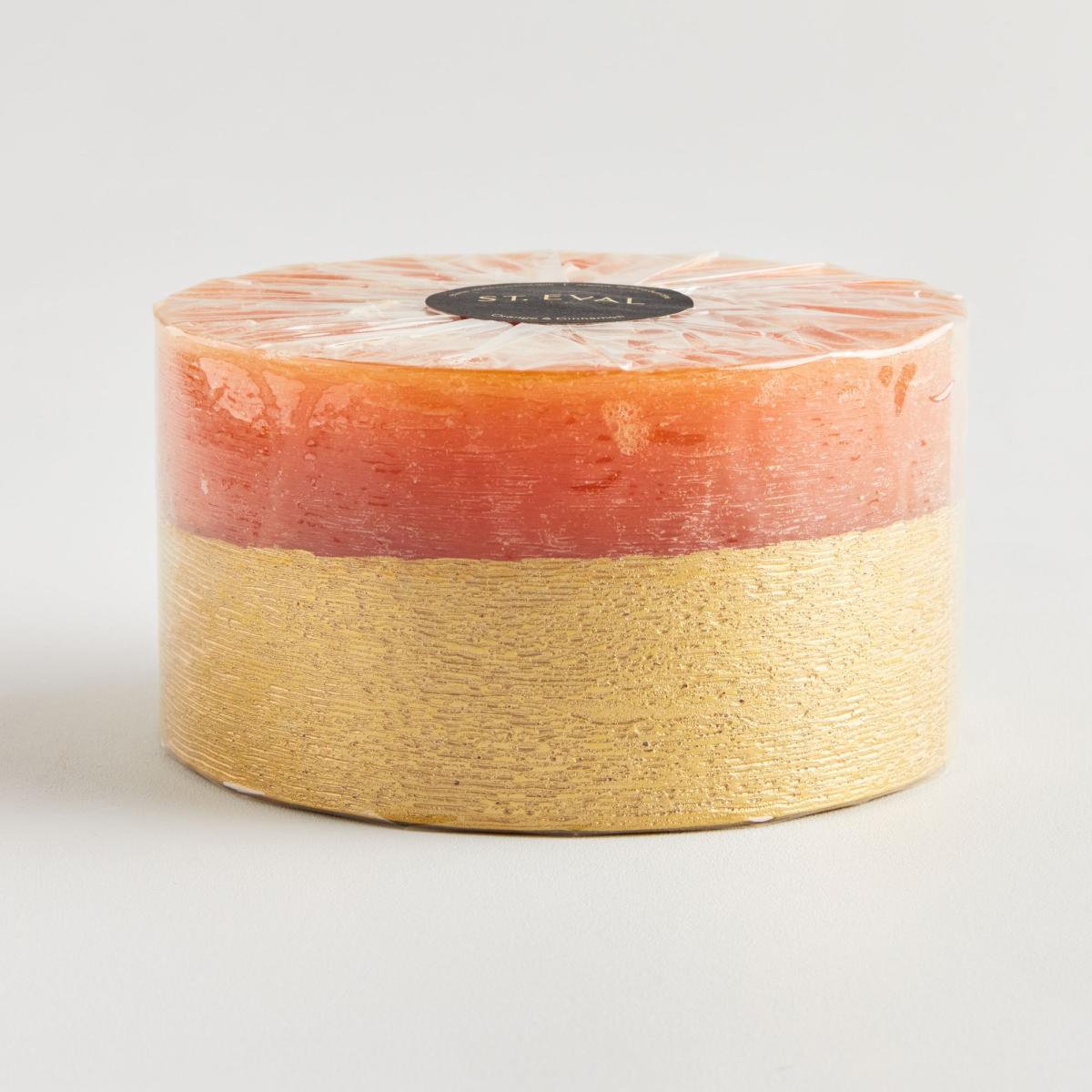 A vibrant orange three wick candle dipped in decadent gold and scented with the spiced citrus scent of orange and cinnamon. A beautiful decorative addition to your candle collection.
