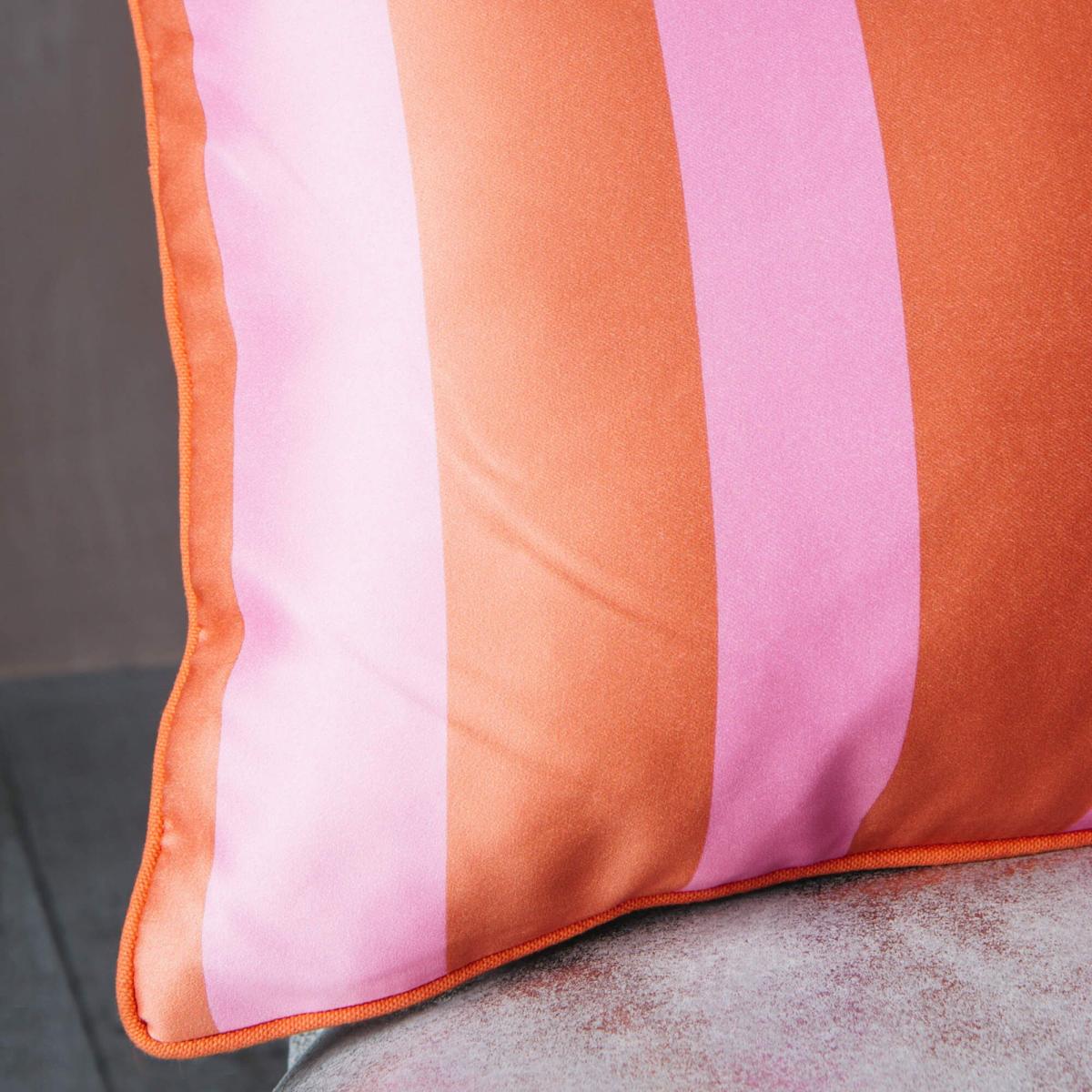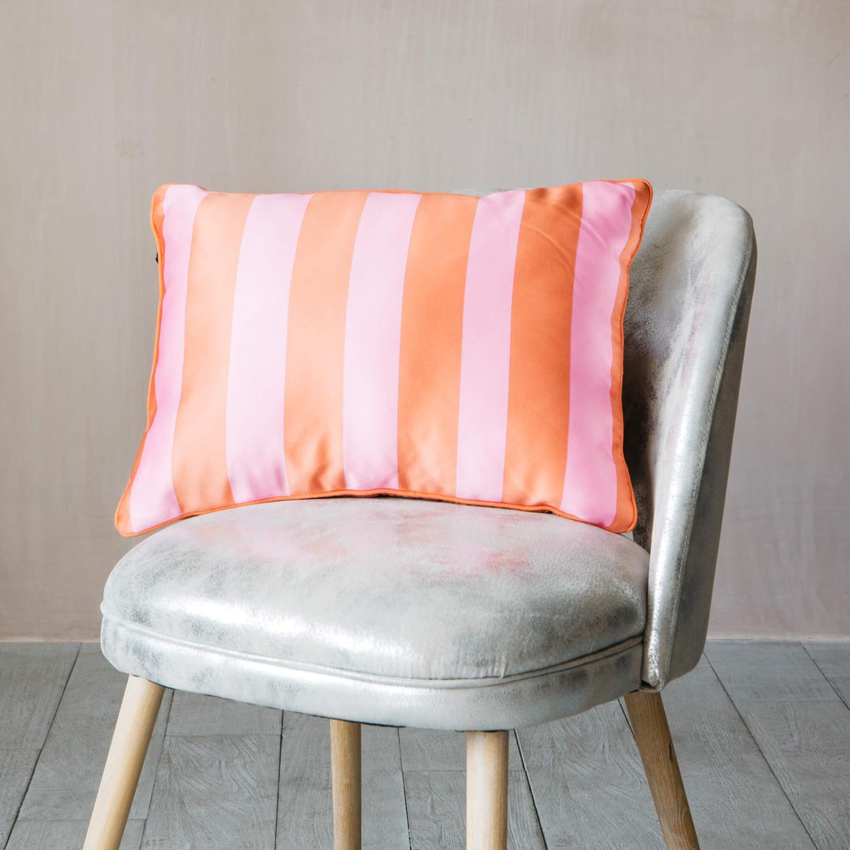 For Big Top circus style, these orange and raspberry pink candy striped cushions in a luxurious satin blend with a velvet backing are a playful addition to brightly coloured homes. H35 x W50cm. Made of polyester satin with a 100% cotton velvet backing and cotton canvas piping. Dry clean only. The shade of the velvet may vary dependant on lighting.