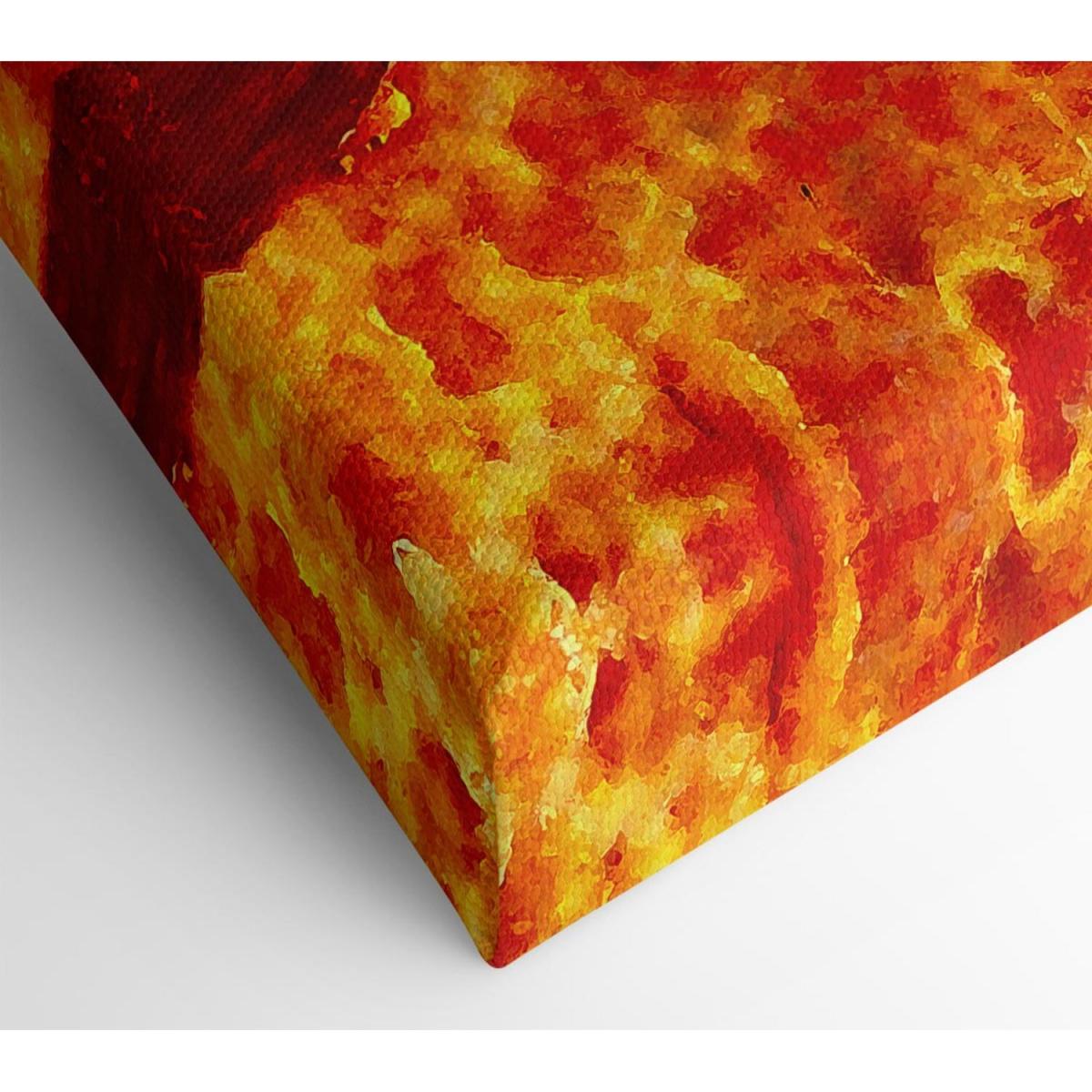 This wall art is a bold statement piece, perfect for adding a pop of colour and a touch of spirituality to a contemporary or eclectic interior. I love how the vibrant yellow and fiery tones can energise a neutral space or complement warm colour palettes. For practical styling, consider pairing it with minimalist furnishings to let the artwork stand centre stage, or hang it above a mantle or console table to create a focal point. It's particularly effective in spaces like living rooms or bedrooms where you want to introduce a sense of warmth and positivity. Just ensure it’s hung at eye level and in a well-lit spot to really showcase the vivid colours and details.