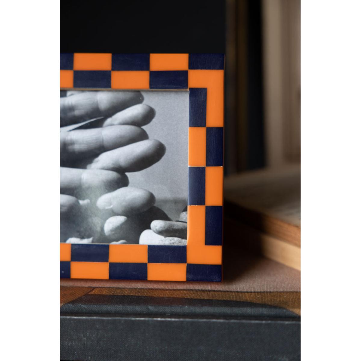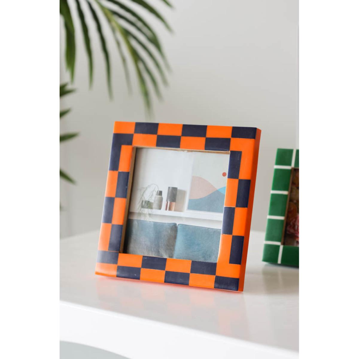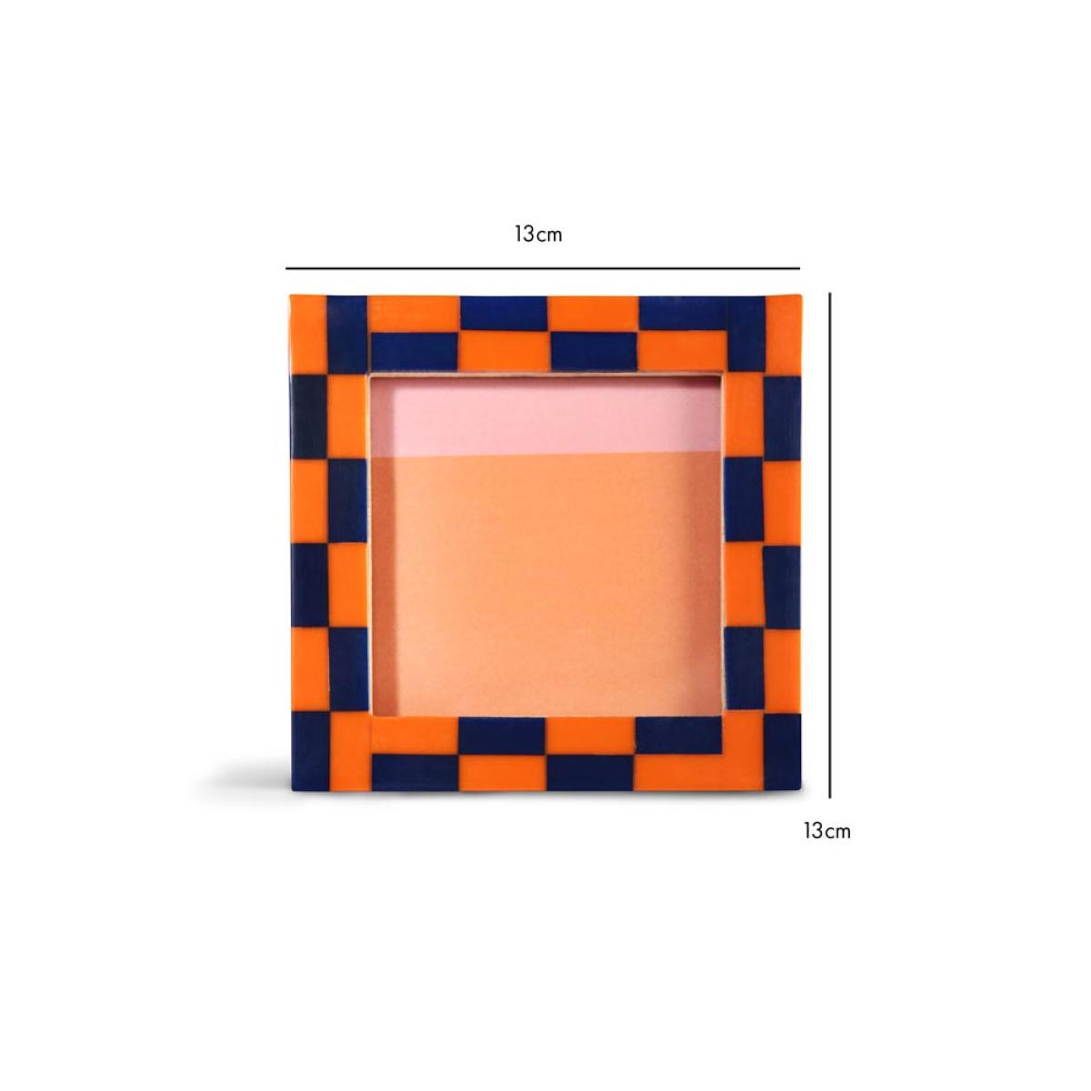 About The Orange Checkered Photo FrameThe Orange Checkered Photo Frame adds a touch of playful pattern to your most treasured photos. Made from polyresin, the frame features a checkerboard pattern in navy blue and orange. Measuring 13 x 13cm, the square photo frame is designed to showcase a 9.3cm x 9.3cm photo in style. Why We Think You’ll Love The Chequered Photo FrameChecks and stripes are one of our favourite trends of the moment and are a fabulous way to experiment with a bolder approach to both colour and interior design. Pairing vibrant orange with timeless navy blue, the chic square photo frame introduces a pop of colour to any shelf or surface. To style this picture frame in your home, simply add your favourite photo and display the memory for all to see!