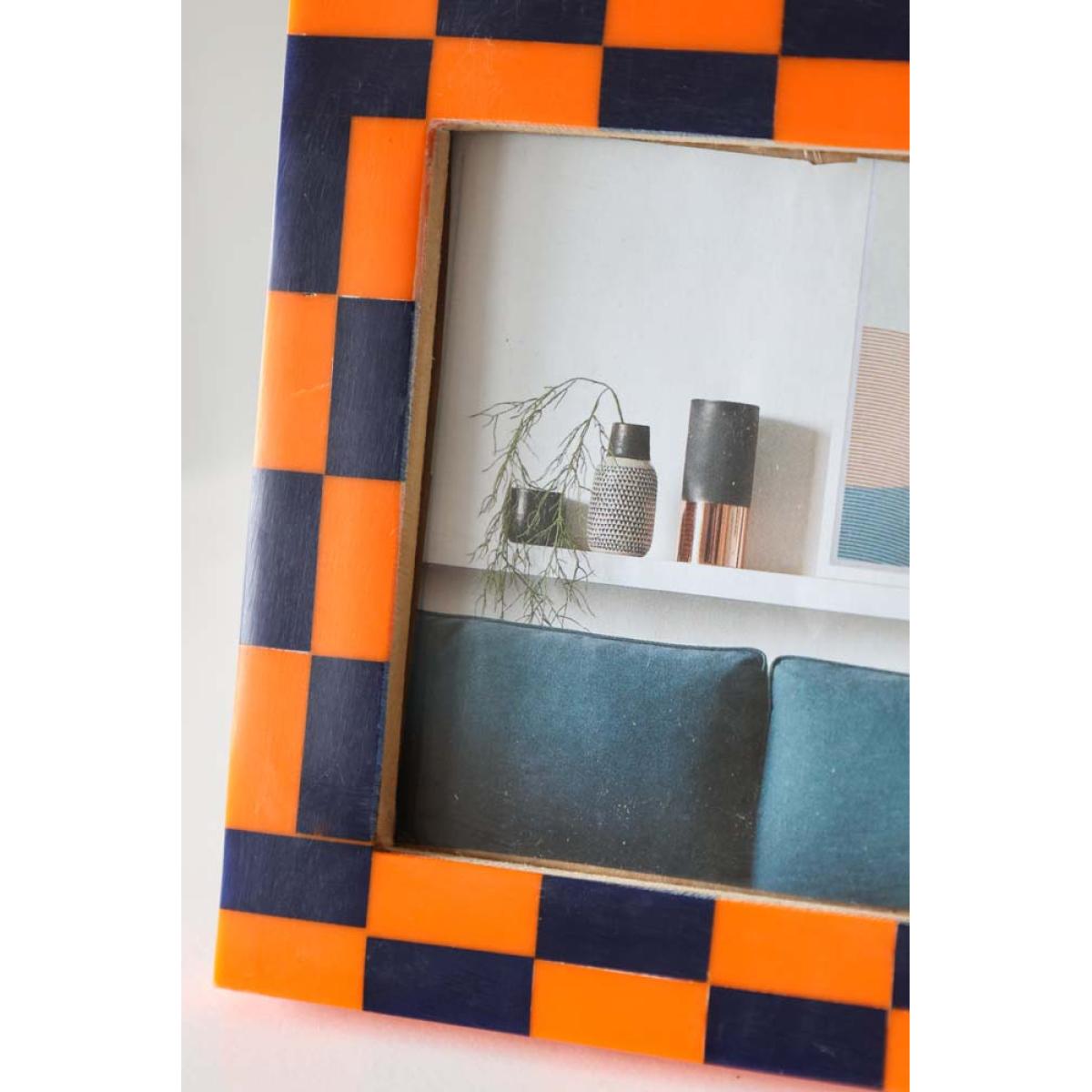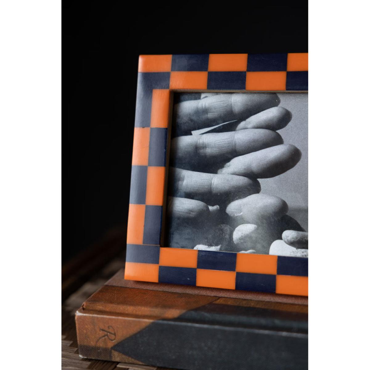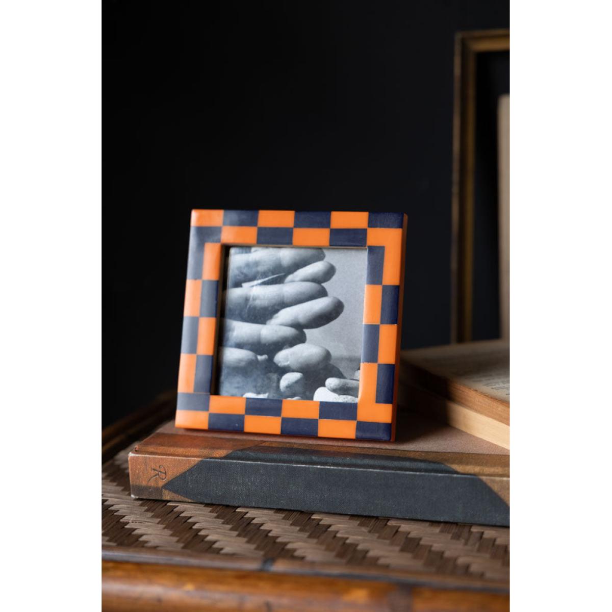About The Orange Checkered Photo FrameThe Orange Checkered Photo Frame adds a touch of playful pattern to your most treasured photos. Made from polyresin, the frame features a checkerboard pattern in navy blue and orange. Measuring 13 x 13cm, the square photo frame is designed to showcase a 9.3cm x 9.3cm photo in style. Why We Think You’ll Love The Chequered Photo FrameChecks and stripes are one of our favourite trends of the moment and are a fabulous way to experiment with a bolder approach to both colour and interior design. Pairing vibrant orange with timeless navy blue, the chic square photo frame introduces a pop of colour to any shelf or surface. To style this picture frame in your home, simply add your favourite photo and display the memory for all to see!
