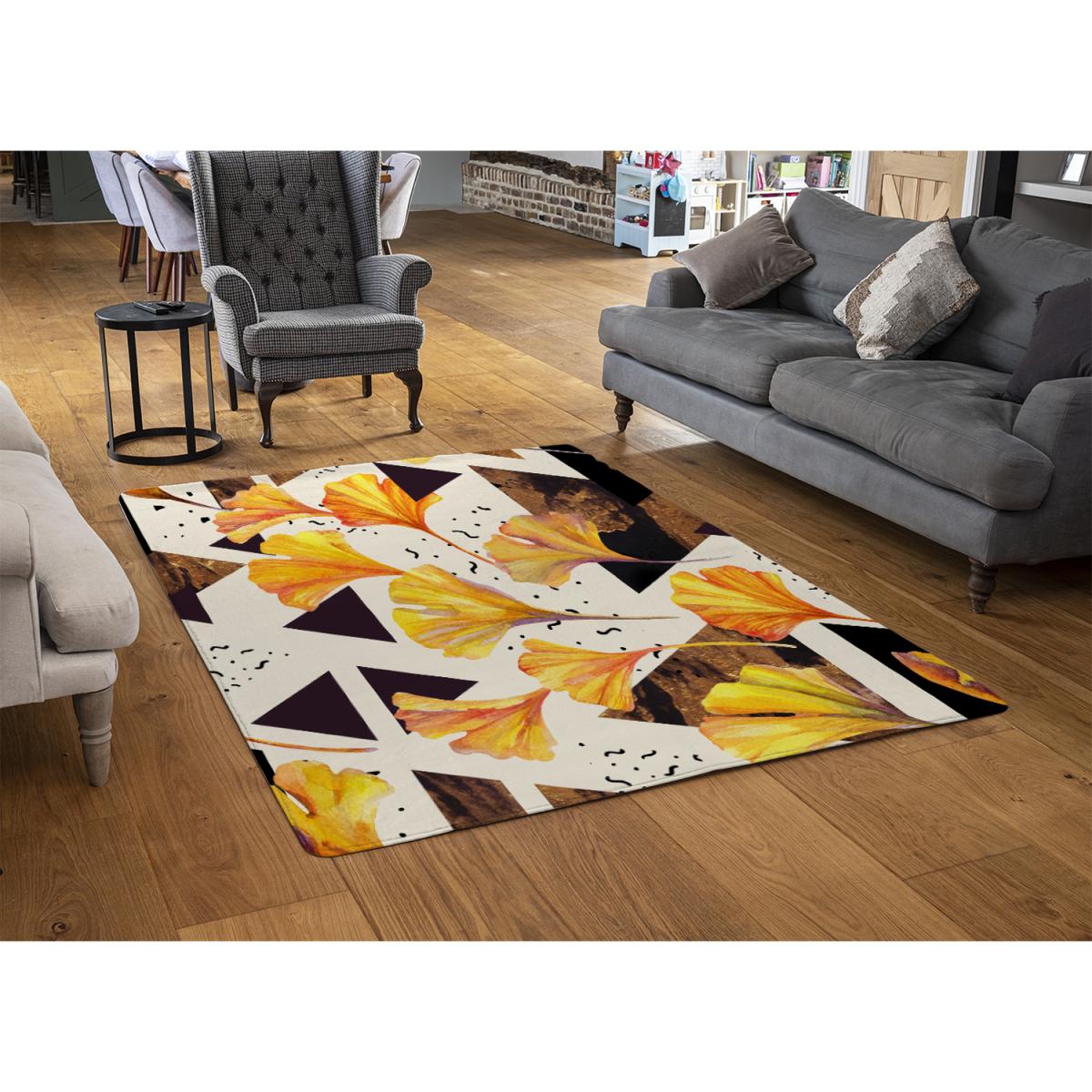 I really like the bright, bold colours of the orange flowers combined with the geometric triangles - it adds a lively, contemporary touch to any space. This rug works especially well in modern interiors, such as minimal living rooms or workspaces, where it can serve as a statement piece. I would suggest layering it over a neutral-toned rug or flooring to really let the colours pop. Practical styling tips include pairing it with simple, solid-colour furniture to avoid overwhelming the space, and it can also be a playful addition to a child's or teen’s room. Its compact 110cm size makes it versatile for smaller areas, entrances, or to create defined zones within an open-plan layout.