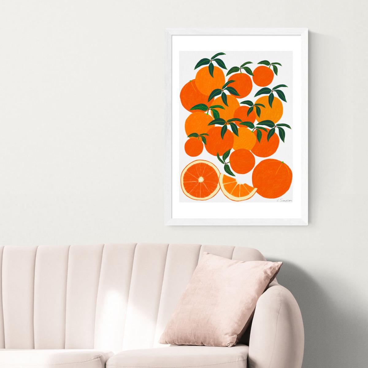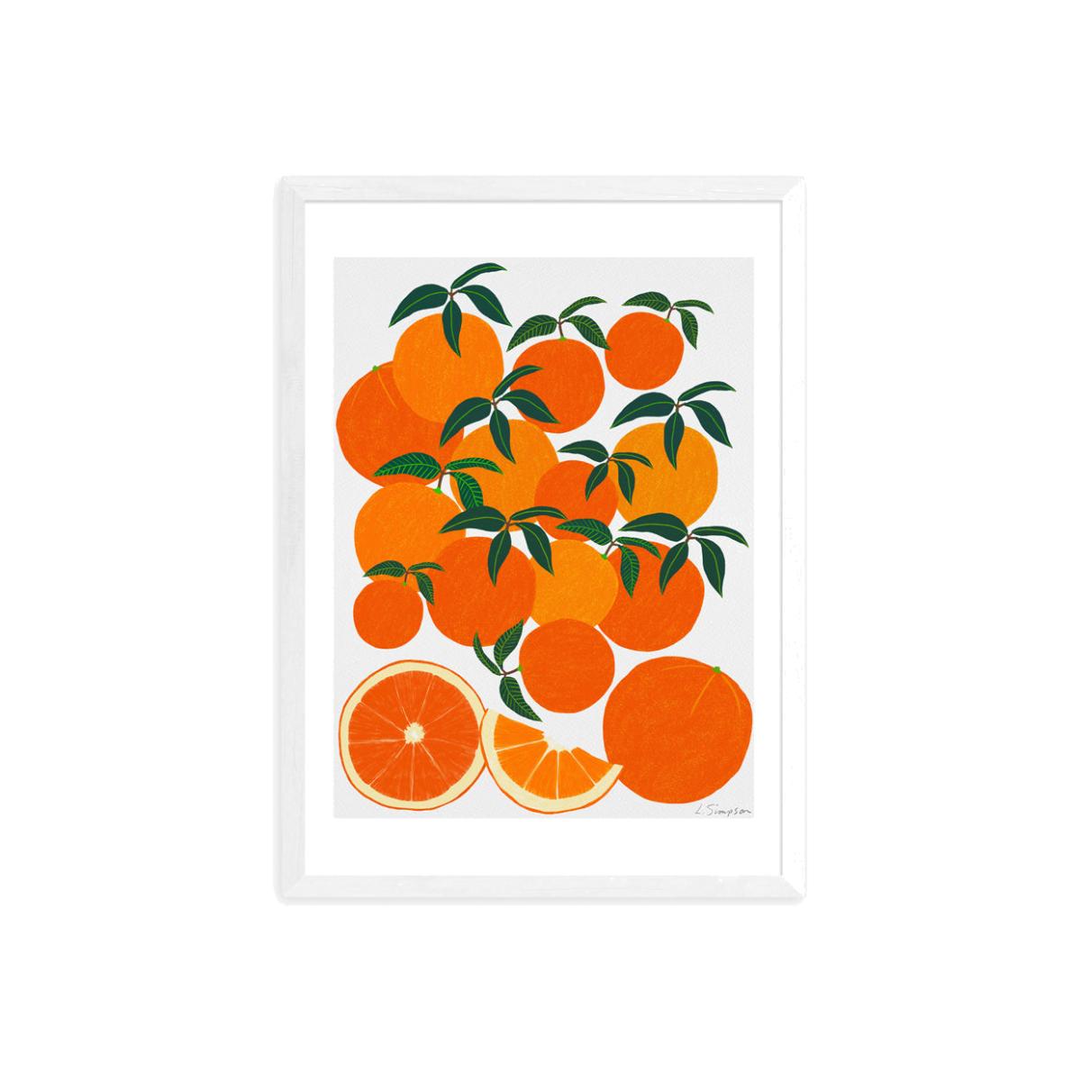 This artwork is hand crafted and made to order for you. Add some zesty tones to you walls with this colourful oranges design by Leanne Simpson. This print would make a perfect addition to your kitch. View More. This artwork is hand crafted and made to order for you. Add some zesty tones to you walls with this colourful oranges design by Leanne Simpson. This print would make a perfect addition to your kitchen or dining room!. Additional Information:. White Obeche Wood Frame. A2 Sized Print. Giclee printing process lasting up to 70 years from fading. 210gsm acid free archival paper with a digital white border. For every print sold a percentage of profit is donated to Cool Earth, a charity combating deforestation in the rainforest.