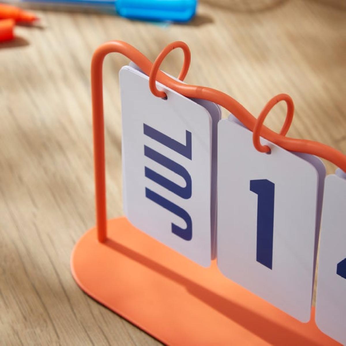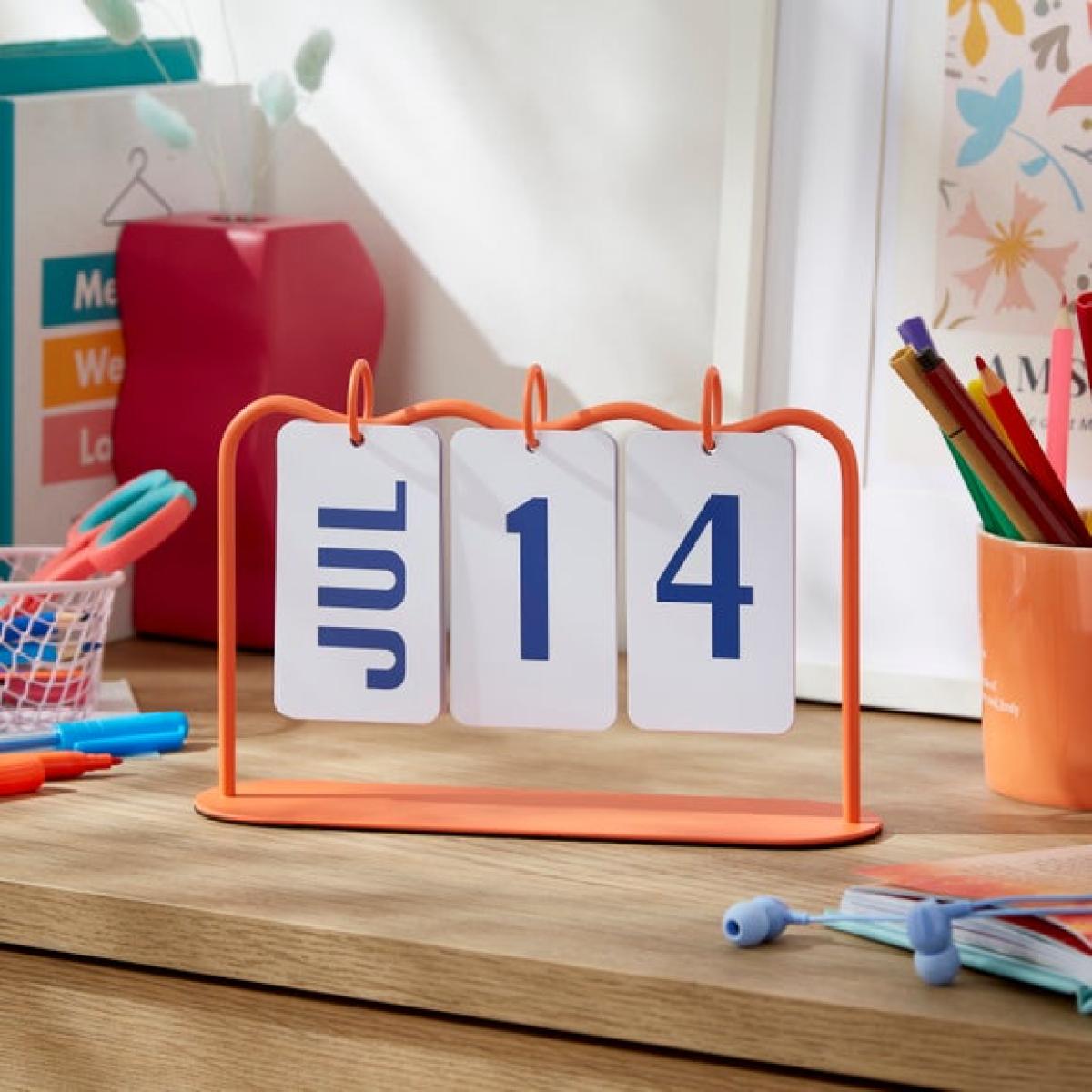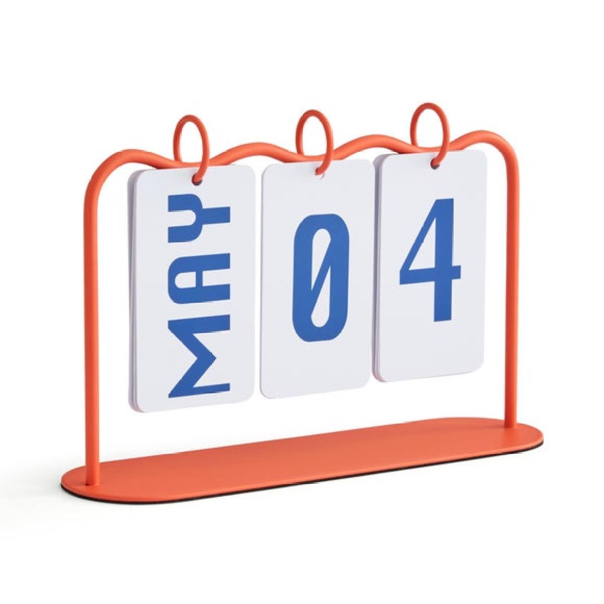 * Orange metal frame * Wavy edge design * Blue text * Perpetual calendar Never be at a loss for the date again with this perpetual calendar. With a wavy metal frame in a bright orange colour, and looped white cards with blue text, simply flip the cards over to keep track of the date and month. This perpetual design means it can be used again and again, year on year, making sure you're on track.