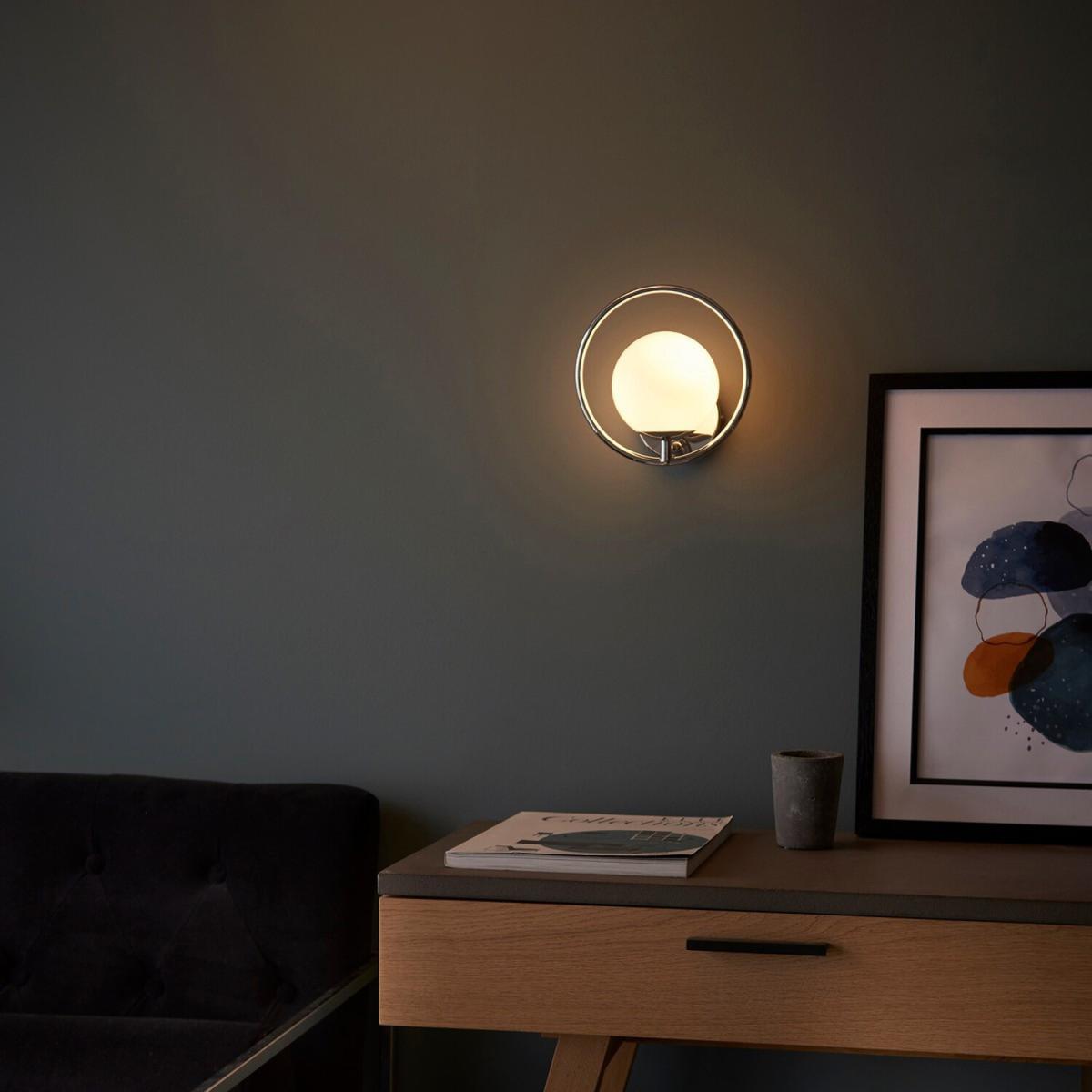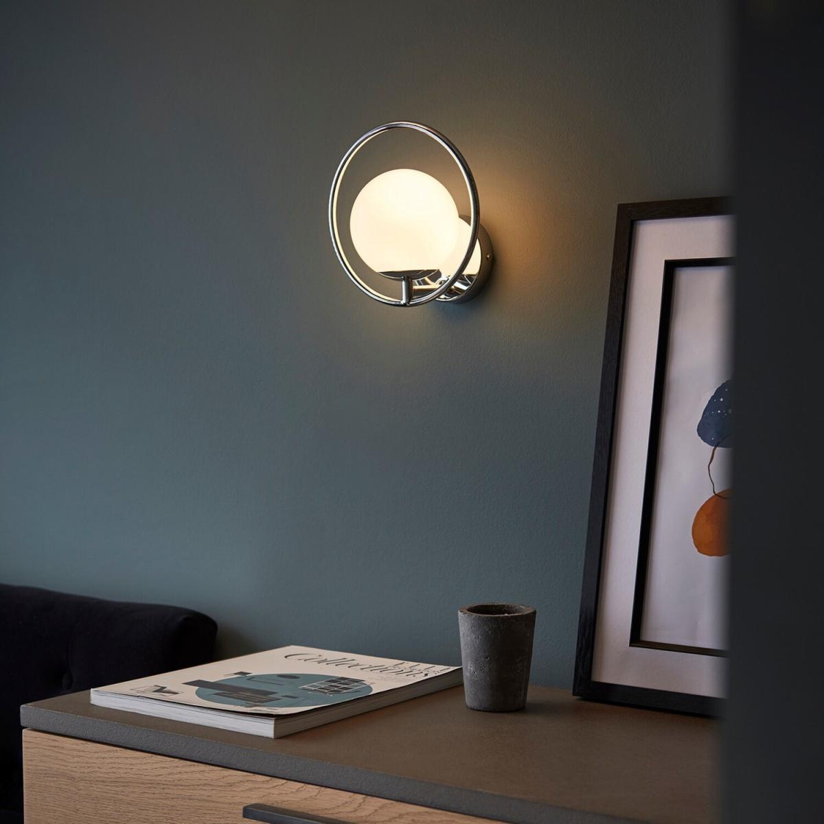 I really like this wall light’s sleek, modern look-its chrome finish and opal glass give it a clean, contemporary vibe that works well in minimalist or transitional interiors. It’s especially effective in bedrooms, hallways, or living spaces where you want a soft, diffused glow without harsh glare. When styling, consider pairing it with other chrome or metallic accents for a cohesive look, and position it beside mirrors or artwork to highlight its reflective qualities. Practical tips include installing it at eye level in bedrooms or near seating areas for functional lighting that also adds a touch of sophistication. Its versatile design means it can fit effortlessly into both understated schemes and more glamorous interiors.