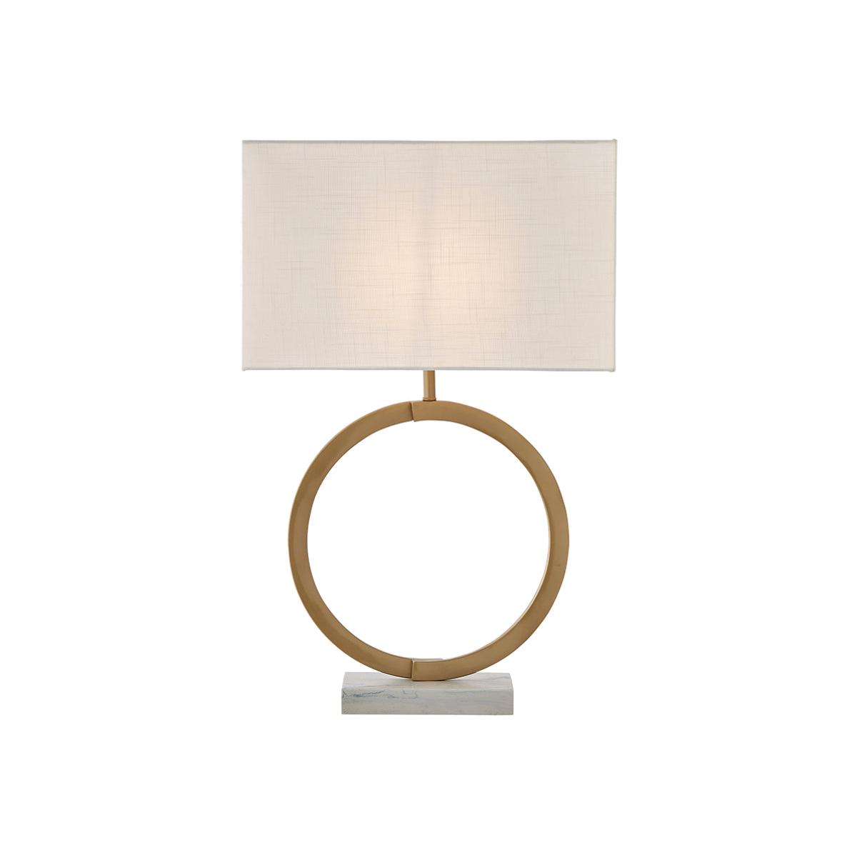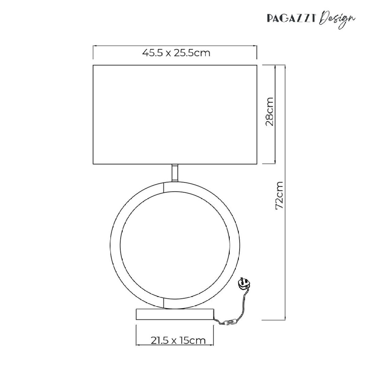 Introduce effortless elegance into your home with the Orbis Ring Metallic Gold Table Lamp, a refined Pagazzi Design exclusive that blends modern simplicity with soft, luxurious finishes. At the heart of this beautifully modest lamp sits a painted soft-gold metal hoop, forming a smooth circular silhouette that is both stylish and understated. The hoop is mounted on a white resin plinth with a subtle marble-effect finish, adding a fresh contemporary touch while ensuring stability. A champagne-coloured woven fabric flex enhances the premium feel, coordinating perfectly with the lamp’s warm metallic tones. Product dimensions: H72xW45.5xD25.. 5 cm Requires 1x ES27 light bulb In-line switch The design is completed with a rectangular textured white cotton shade, chosen to complement the clean geometry of the base. Its slim profile makes the lamp ideal for positioning on narrow shelves, compact tables, windowsills, or bedside units, offering both beauty and practicality. Minimalist, fresh, and effortlessly versatile, the Orbis Ring lamp brings a calming glow and a touch of modern sophistication to any living space.