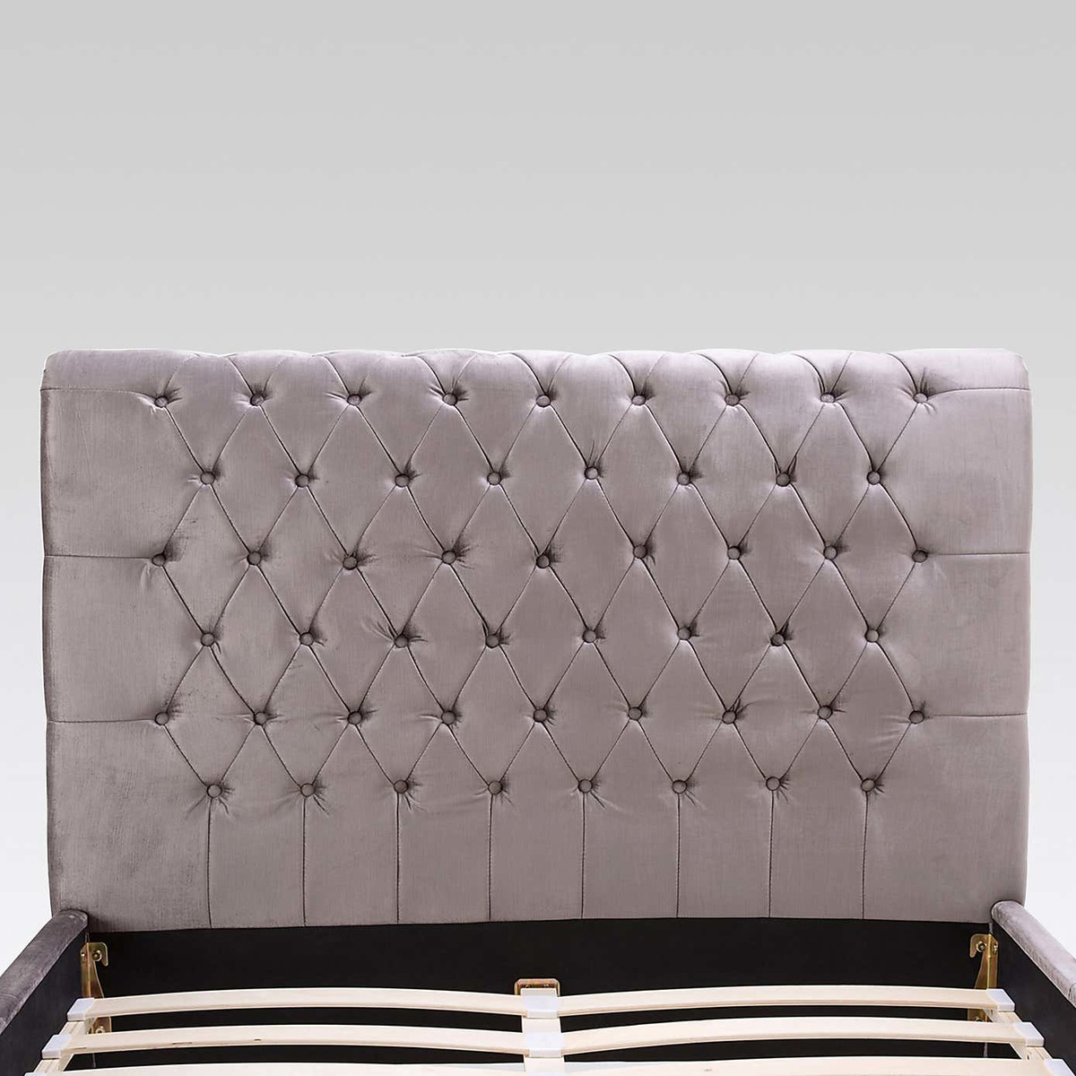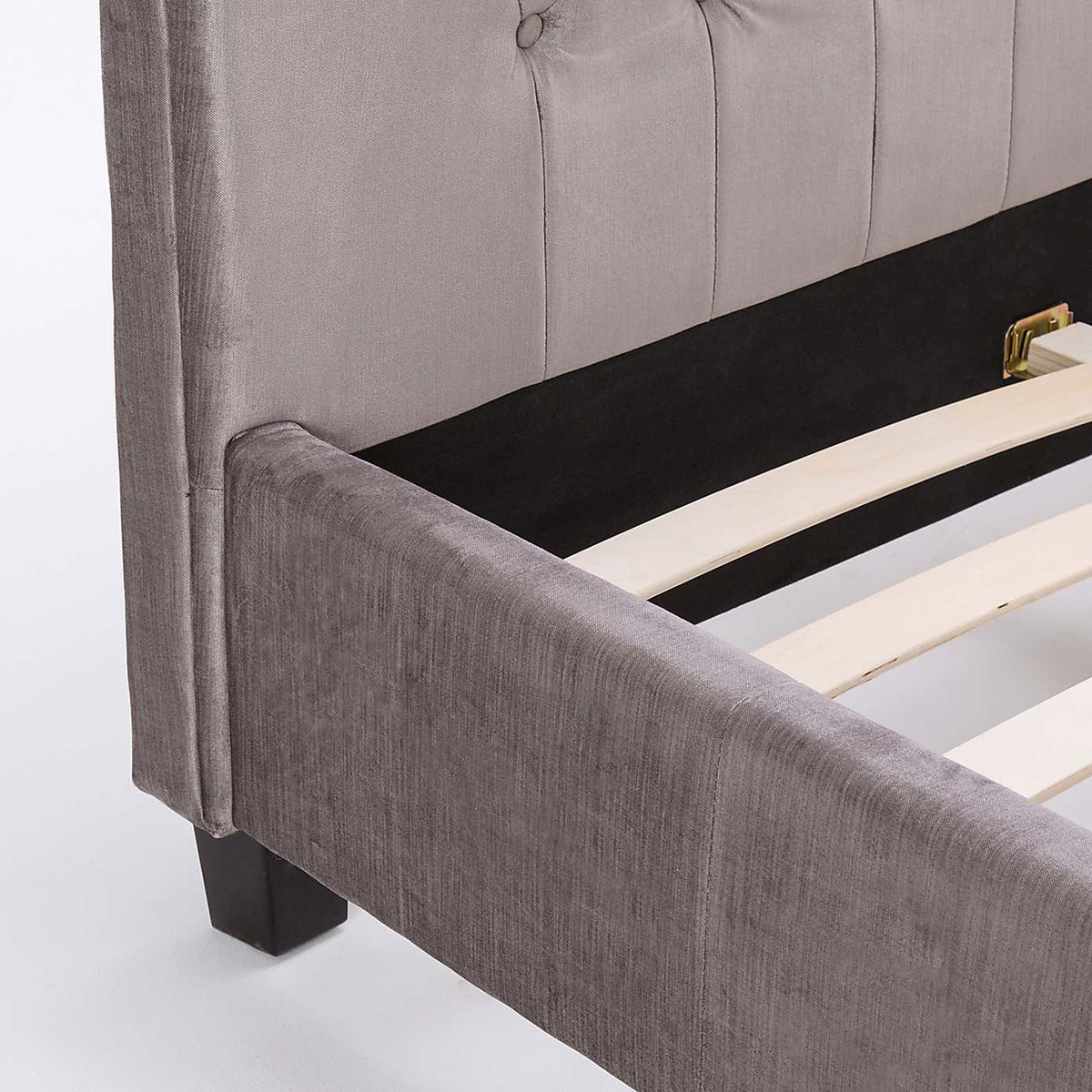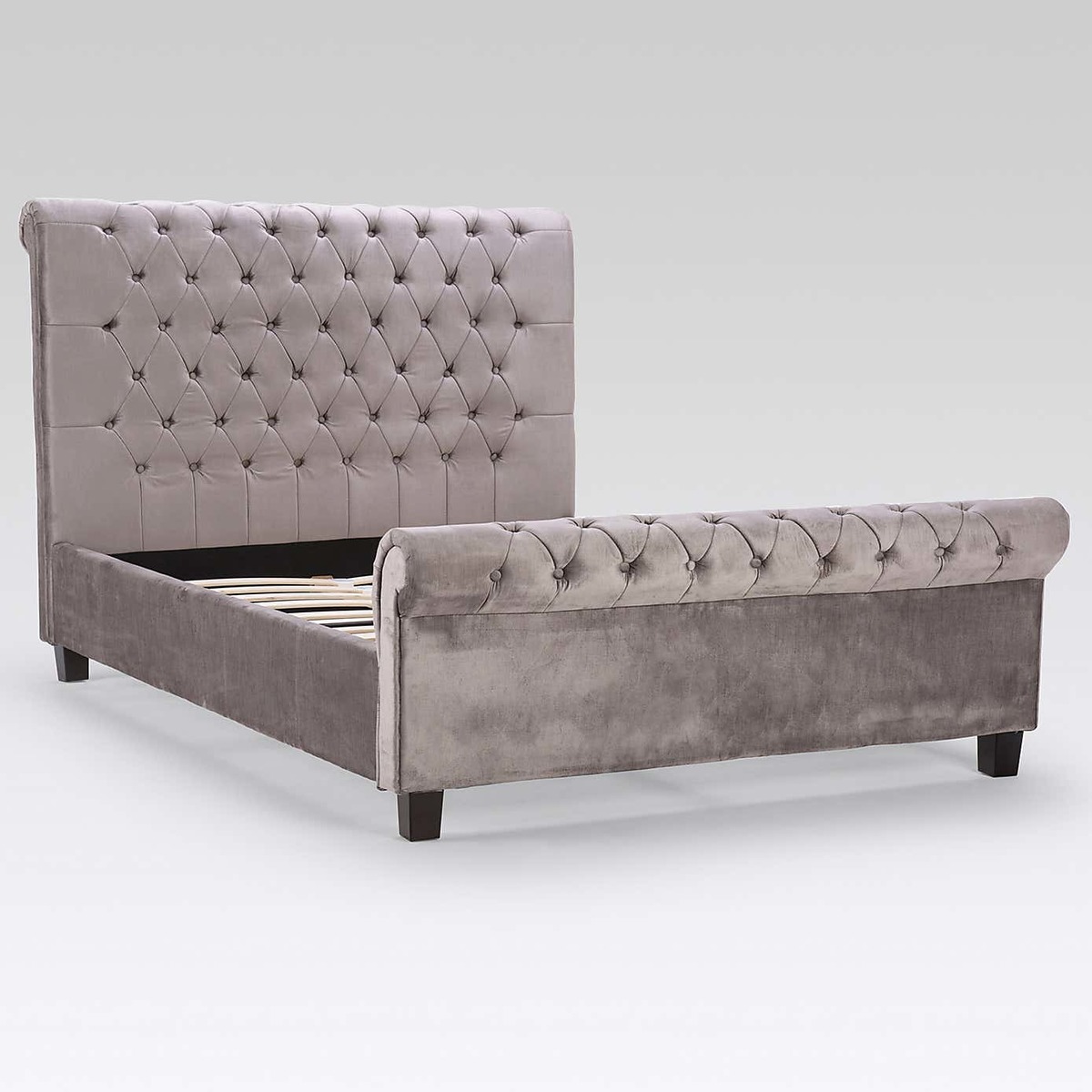 Designed with an elegant scroll-style, this glamorous bedstead will add a focal point to any room. Crafted with a large, classically tufted headboard, this self-assembly bedstead features a cushioned headboard for premium comfort. Upholstered in a gorgeous, silver velvet, this luxurious bedstead is finished with a sprung slatted base designed to give natural, sleep-enhancing support. Please note, unfortunately we cannot deliver this item to the Channel Islands.