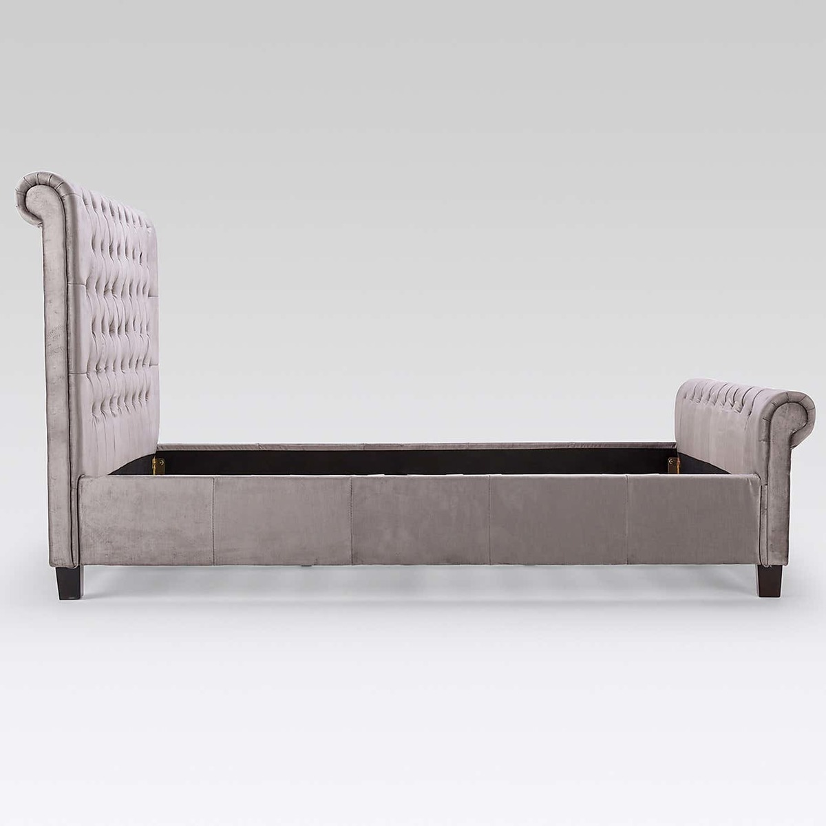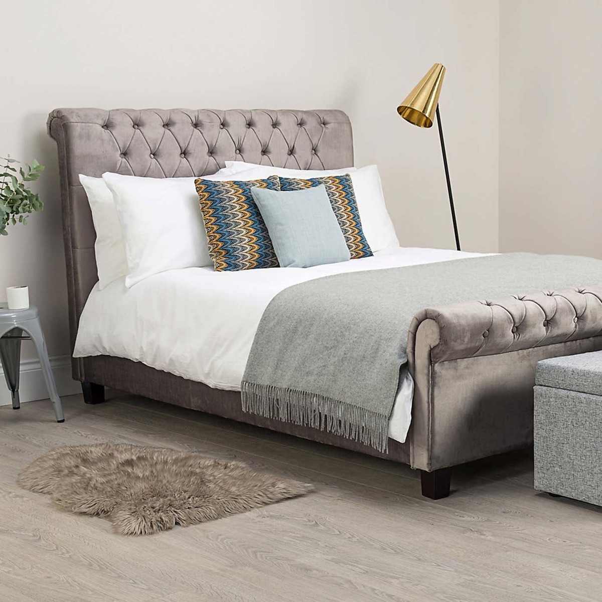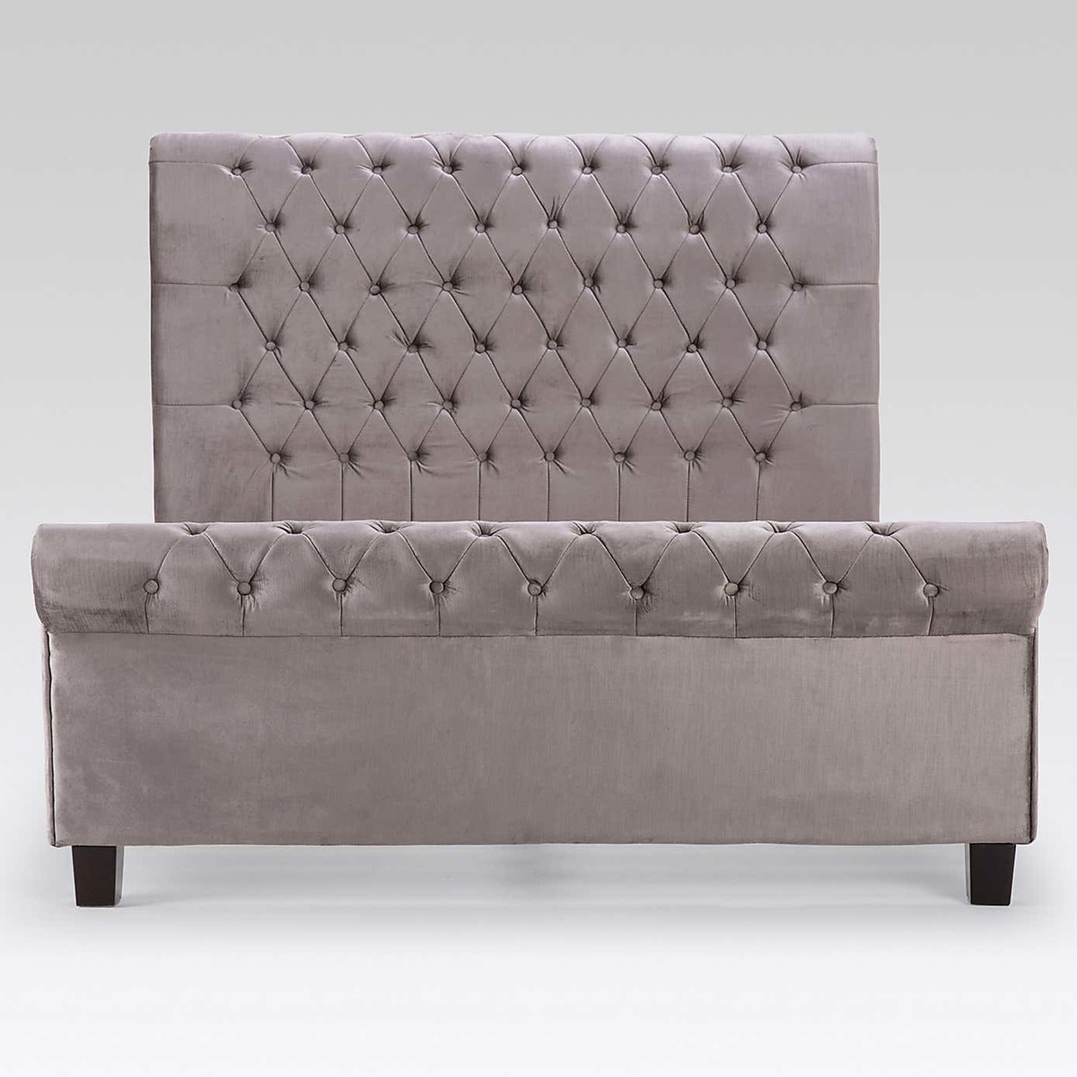 Designed with an elegant scroll-style, this glamorous bedstead will add a focal point to any room. Crafted with a large, classically tufted headboard, this self-assembly bedstead features a cushioned headboard for premium comfort. Upholstered in a gorgeous, silver velvet, this luxurious bedstead is finished with a sprung slatted base designed to give natural, sleep-enhancing support. Please note, unfortunately we cannot deliver this item to the Channel Islands.