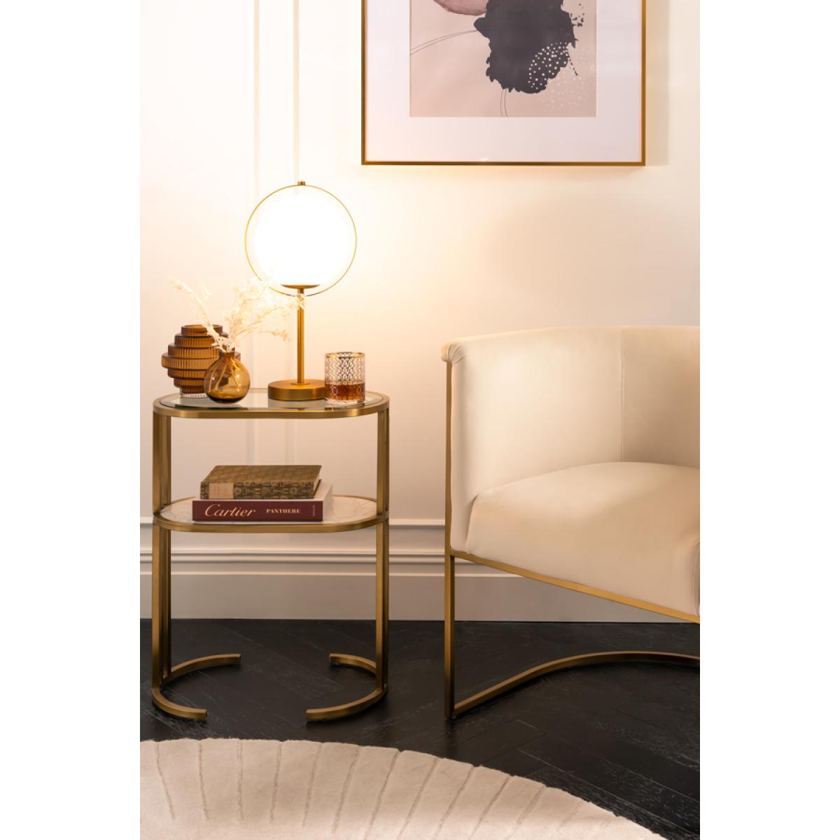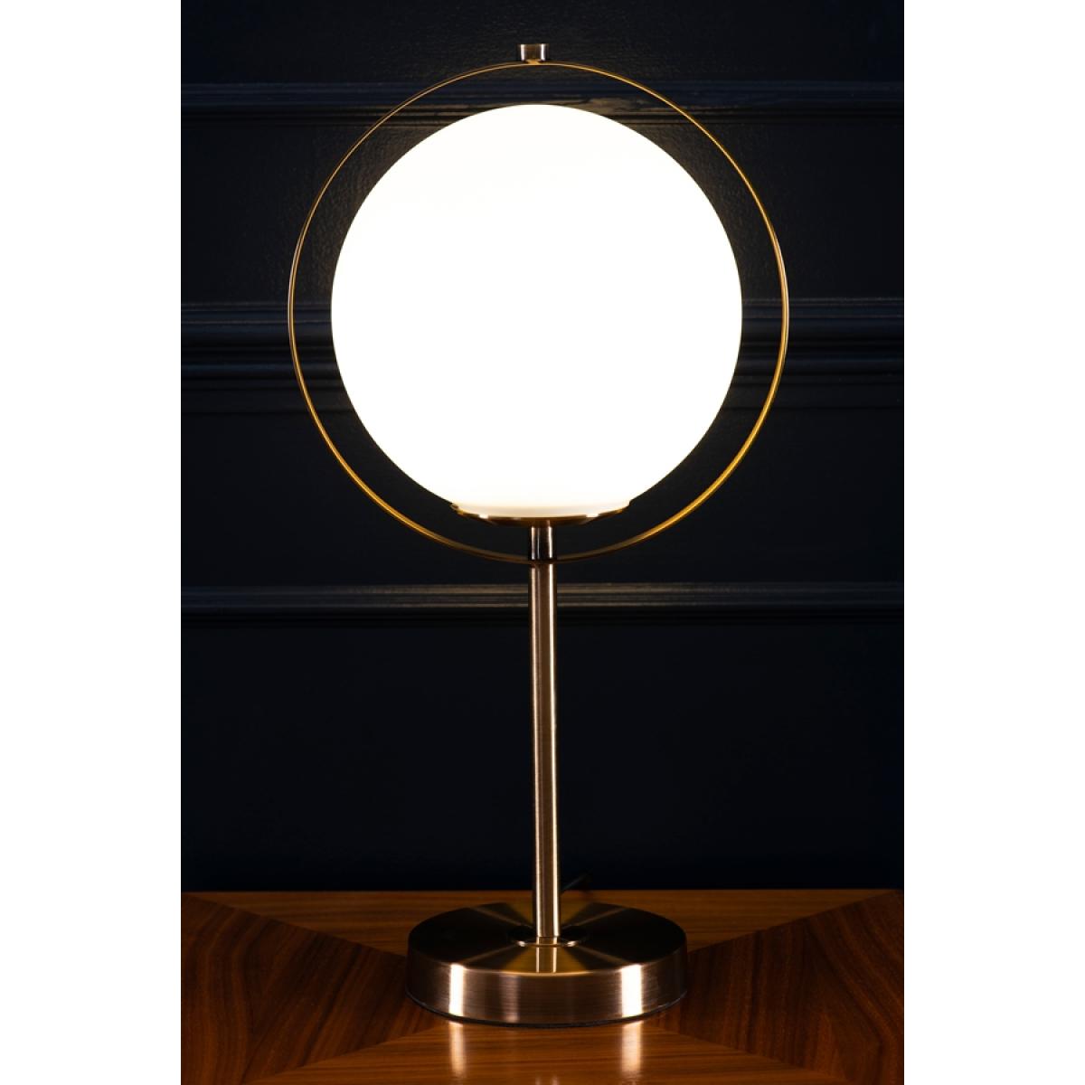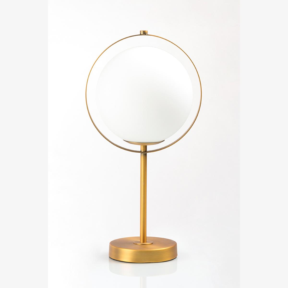 Modernist table light with a bold geometric form. Steel with brushed brass finish. Frosted glass sphere creates a diffused yet practical light source. 20W G9-LED Bulb included. Supplied fully assembled.