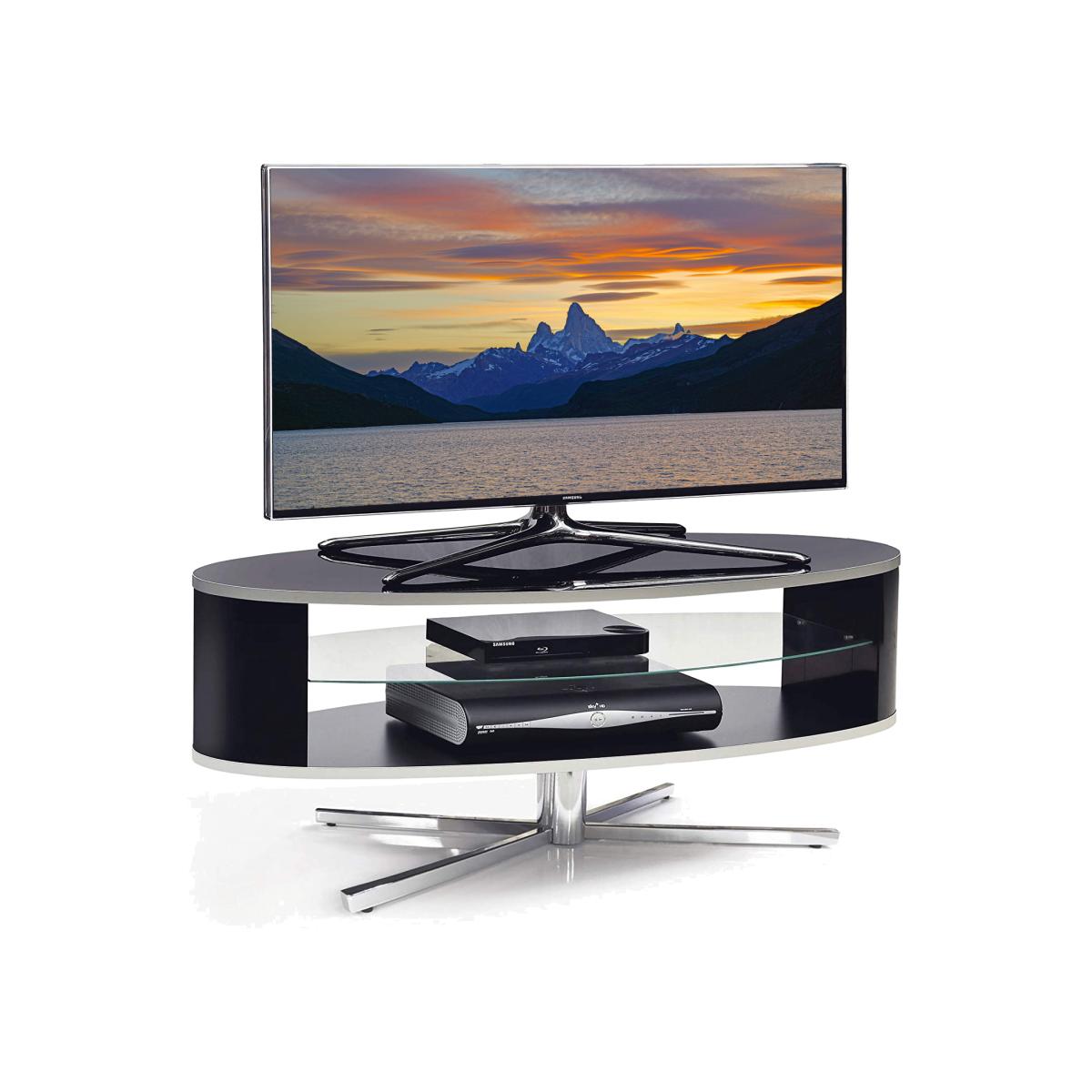 The Orbit TV cabinet is a new concept in uniquely profiled furniture to compliment the very latest home entertainment systems. The elliptical body of the Orbit TV stand offers both a contemporary style and the practicality to position it anywhere in your living space. Accommodating TV screens of up to 55", the Orbit TV unit come with two shelves to accommodate slim A/V accessories and sound bars. The Orbit entertainment unit comes complete with Cable Management to hide unsightly wires at the rear and clear and concise manual for easy self-assembly. Dimensions: Width: 110cm X Depth: 38cm X Height: 41cm. / Maximum Top Load Weight: 40kg / Maximum Glass Shelf Load Weight: 15kg / Shelf Spacing: Upper 11.5cm - Lower: 10cm