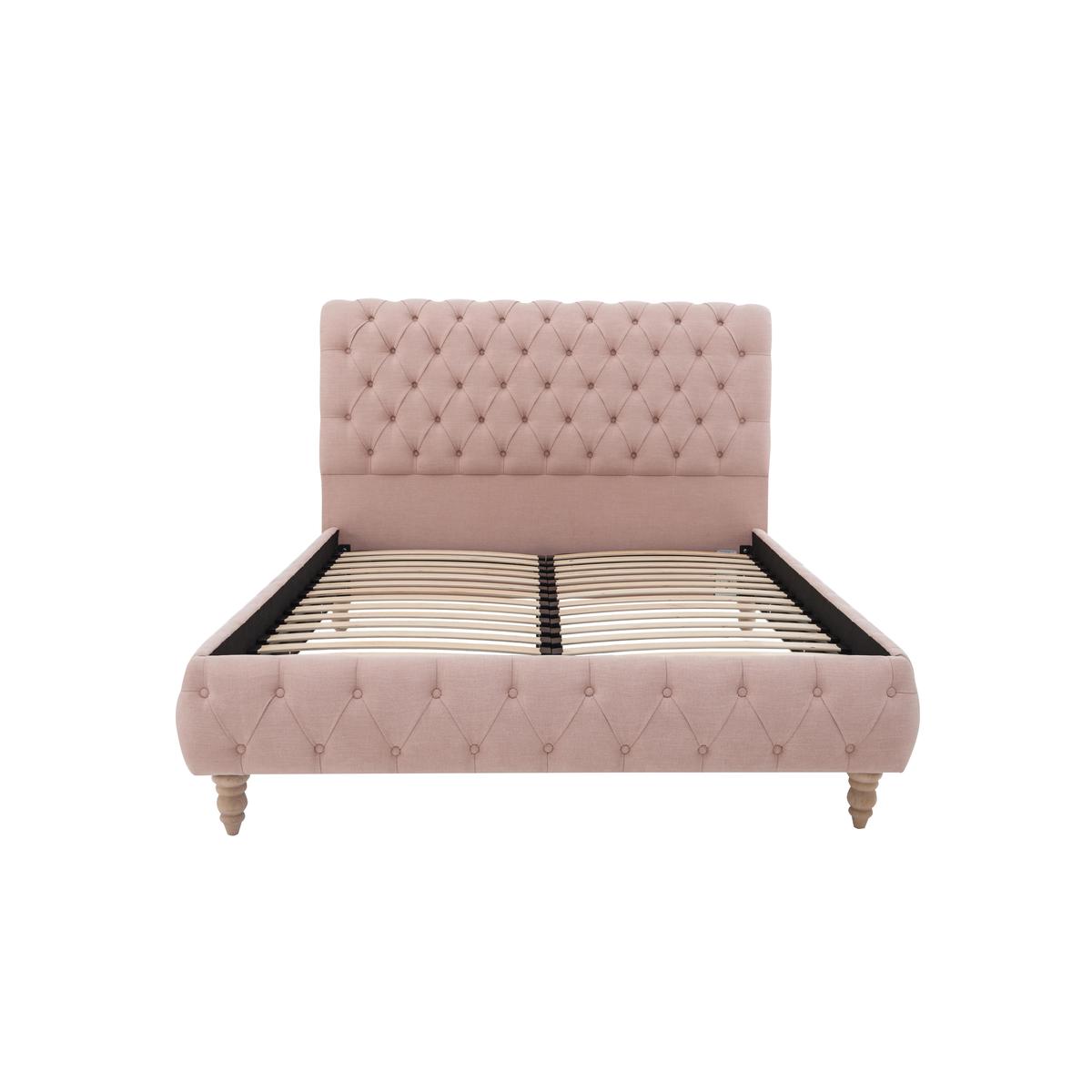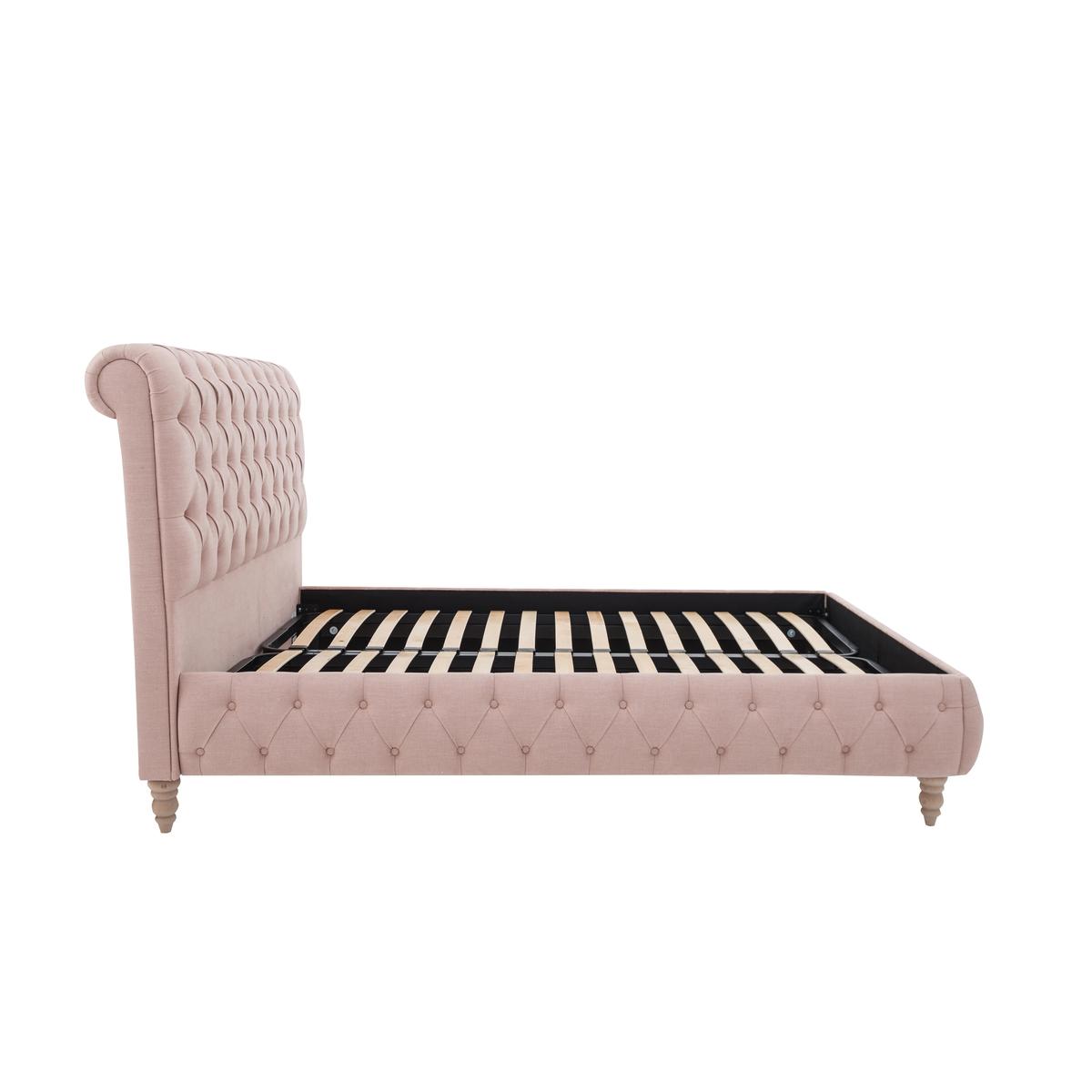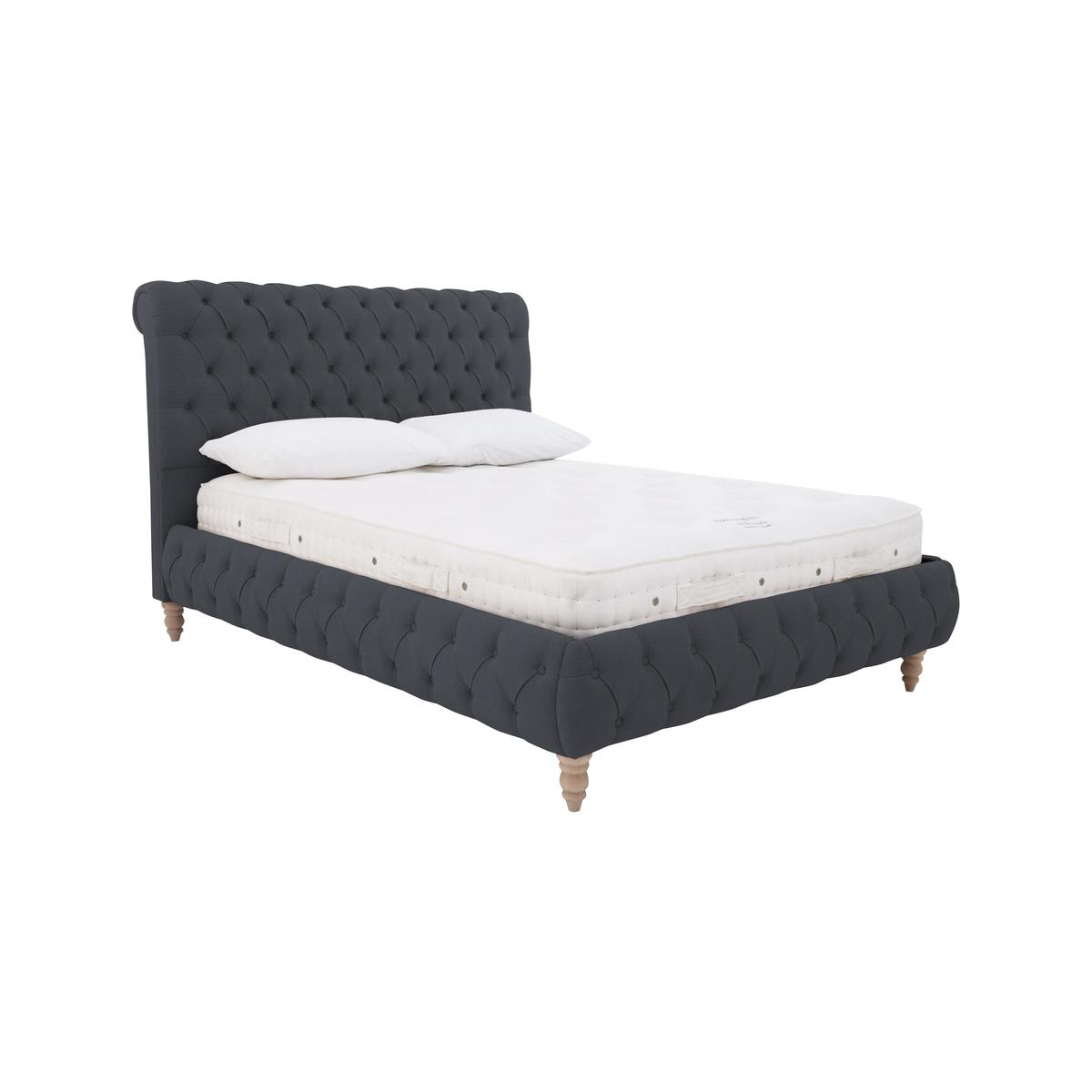 Sumptuous buttoned bed frame. In a wide choice of beautiful fabrics. Handmade to order in Britain. Everything about the beautiful Orchard bed frame says high-end luxury. And yet, despite its beautiful upholstery, sumptuous cushioning and lavish buttoning, this bed frame is surprisingly affordable. Guaranteed to take centre stage in any bedroom, this fully upholstered bed frame features thick padding and is buttoned from the foot of the bed base to the very top of the imposing scrolled headboard. It’s also entirely handcrafted – each one is individually made to order in Britain. Sturdily crafted with turned wood legs, and featuring a sprung slatted base that’s designed to support any type of standard mattress, this stunning bedstead is available in an extensive choice of luxury fabrics and in a whole spectrum of beautiful colours. Please call us on 0800 804 8879 and we’ll be happy to tell you about all upholstery options. The sumptuous Orchard bedframe is available in a wide range of bed sizes – single, small double, double, king and super king – and is only available at Furniture Village.