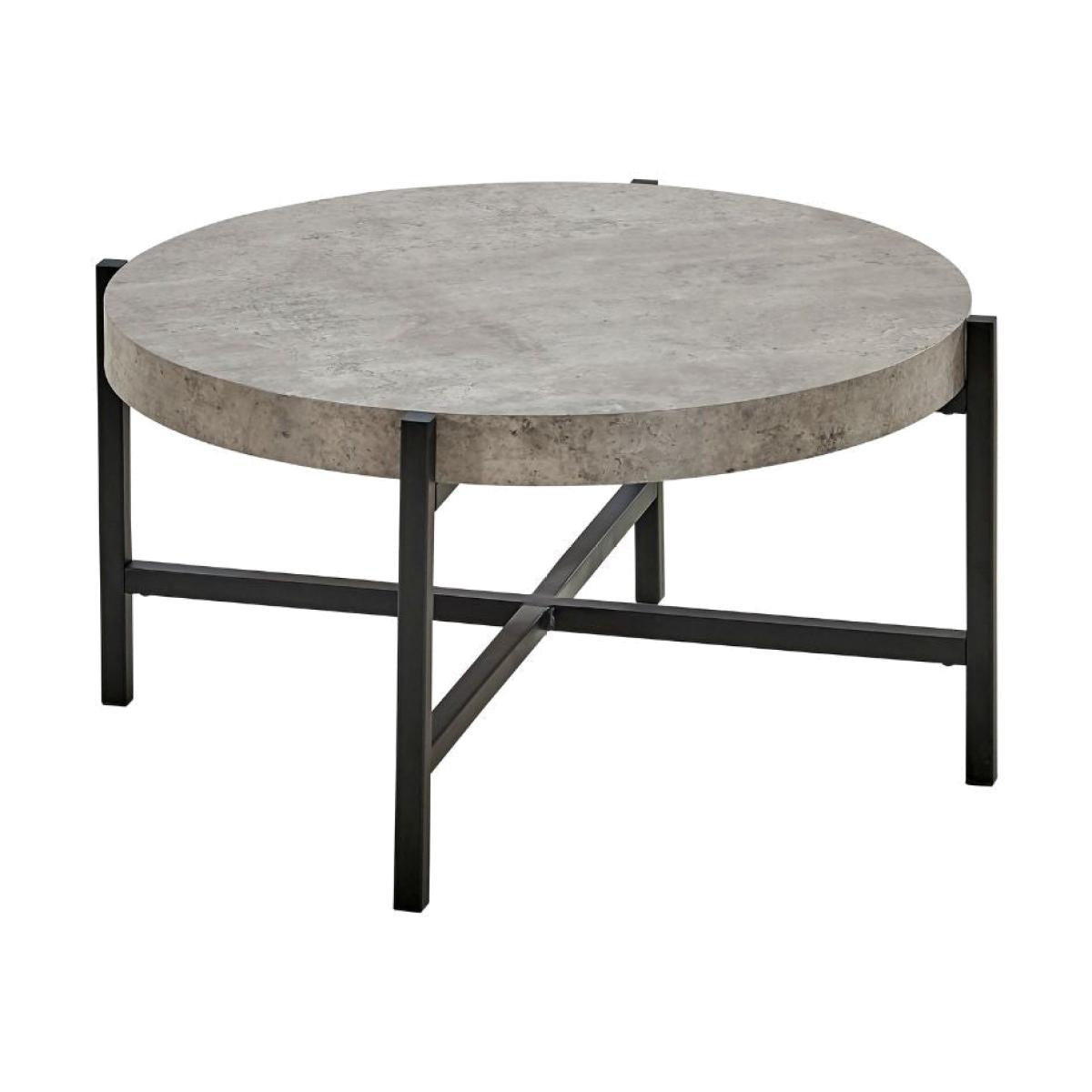 Orden round coffee table, featuring a concrete-effect paper finished tabletop with black metal legs. Introduce a touch of industrial-inspired style to your living space with the Orden coffee table. This contemporary piece features a concrete-effect tabletop, combining the chic look of concrete with a lightweight, easy-to-maintain design. The sleek black metal legs add stability and a bold contrast, completing the modern aesthetic. Perfect for anchoring your living room, the Orden coffee table provides ample space for magazines, drinks or decorative accents. Its minimalist design and neutral tones make it a versatile addition to any interior, seamlessly blending with both modern and transitional decor styles. Orden round coffee table, featuring a concrete-effect paper finished tabletop with black metal legs. Introduce a touch of industrial-inspired style to your living space with the Orden coffee table. This contemporary piece features a concrete-effect tabletop, combining the chic look of concrete with a lightweight, easy-to-maintain design. The sleek black metal legs add stability and a bold contrast, completing the modern aesthetic. Perfect for anchoring your living room, the Orden coffee table provides ample space for magazines, drinks or decorative accents. Its minimalist design and neutral tones make it a versatile addition to any interior, seamlessly blending with both modern and transitional decor styles.