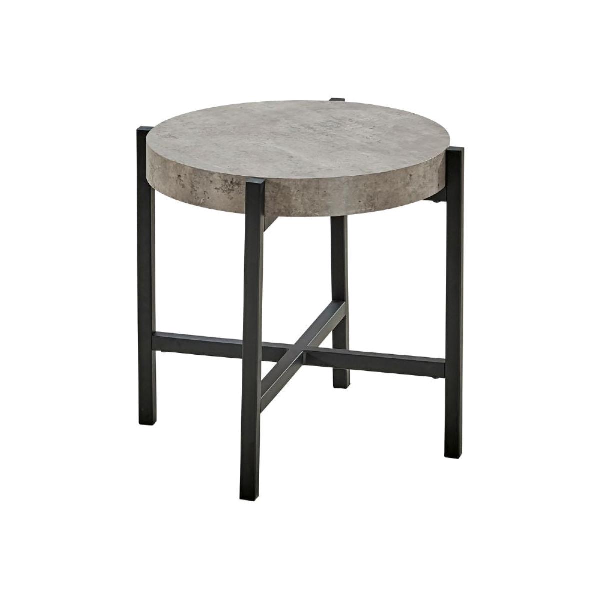 Orden round side table, featuring a concrete-effect paper finished tabletop with black metal legs. Height: 55cm Diameter: 50cm Add modern industrial charm to your home with the Orden ede table, a sleek and stylish addition to any room. This table features a concrete-effect tabletop, offering the rugged appeal of concrete with a lightweight and practical design. The black metal legs provide a sturdy base and a bold contrast, enhancing the table's contemporary aesthetic. Perfect as a standalone accent piece or paired with other furniture, the Orden end table is ideal for holding drinks, books or decorative items. Its minimalist design and neutral tones make it a versatile choice for both modern and transitional interiors.