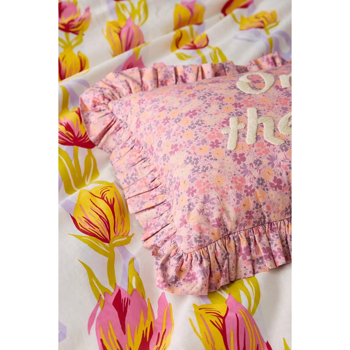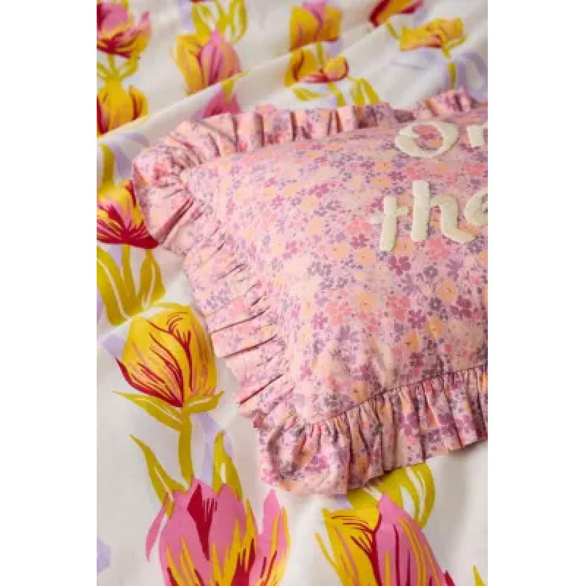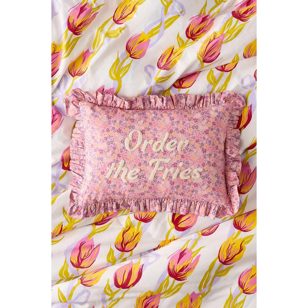Your reminder to order the fries! Cutesy floral cushion in a rectangle shape with a soft filling, topped with an embroidered slogan to front. Finished with pretty ruffled edges. **Content + Care** \- Outer: 100% Cotton \- Filling: 100% Polyester \- Removable Cover - Machine Washable **Size** \- 36cm x 51cm