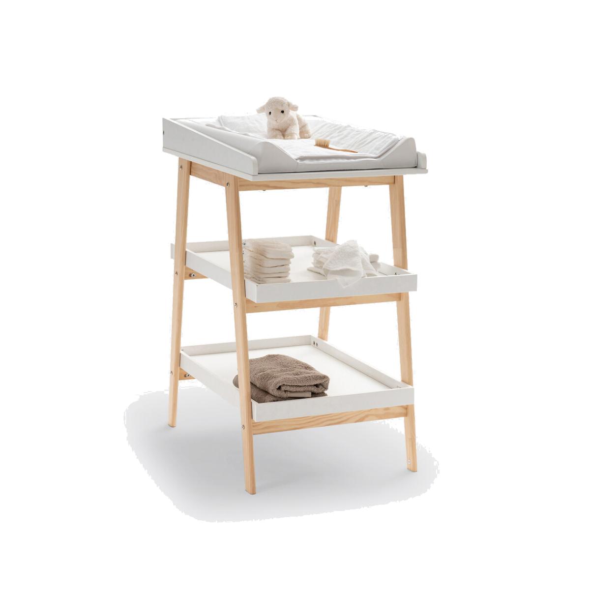 The Oréade changing table. Practical and functional thanks to its changing table and 2 shelves. It is ideal for storing all baby's essentials and keeping them close to hand. Product Details • 1 changing table + 2 shelves • In lacquered MDF with AC finish (solvent-free water-based paint), FSC® certified • Base in solid stained oak • Changing mat not included. Quality Info • Our products conform to current safety standards • WARNING: Do not leave your baby unattended. Our changing stations are not suitable for babies over the age of 12 months and/or weighing over 11kgDimensions Total • Width 53.6cm • Height 98.8cm • Depth 75cm. Changing Table Dimensions • L50 x D72.9 x H9cm Shelf Dimensions (each) • L46.4 x D69.4 x H3.5cm. Delivery: • This product is sold for self-assembly. It will be delivered to your door. Note! Please check that all access points are large enough to accommodate your delivery (doors, stairs, lifts). • WOOD FROM SUSTAINABLY MANAGED FORESTS. FSC® certified wood comes from forests that are environmentally, socially and economically well managed. Dimensions and weight of parcel1 parcel • L101.2 x H59.6 x D7.5cm. Weight 17kg