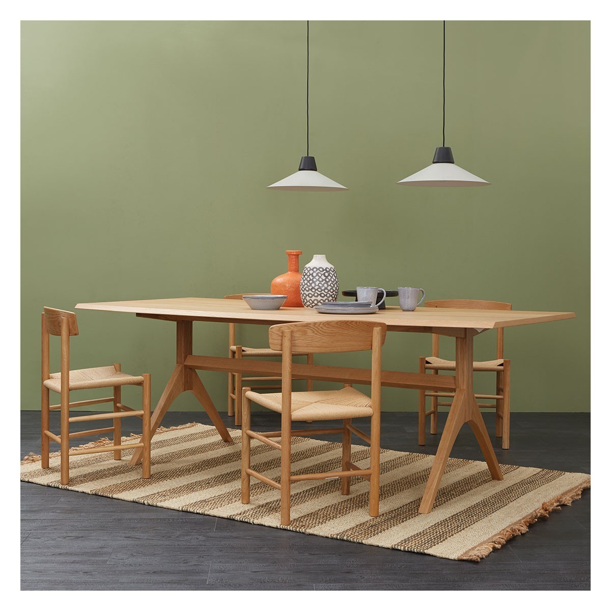 I love this oak chair with its natural cord seat for its simple, timeless design and versatility. It works particularly well in Scandi-inspired interiors or casual, coastal settings, where the light wood and neutral tones help create a fresh, airy feel. Practical styling tips include pairing it with a slimline, modern dining table or mixing it with other natural materials like linen tablecloths or woven placemats to emphasise its organic aesthetic. Its understated elegance also makes it suitable for both contemporary and traditional schemes, effortlessly adding warmth and texture to a dining space.