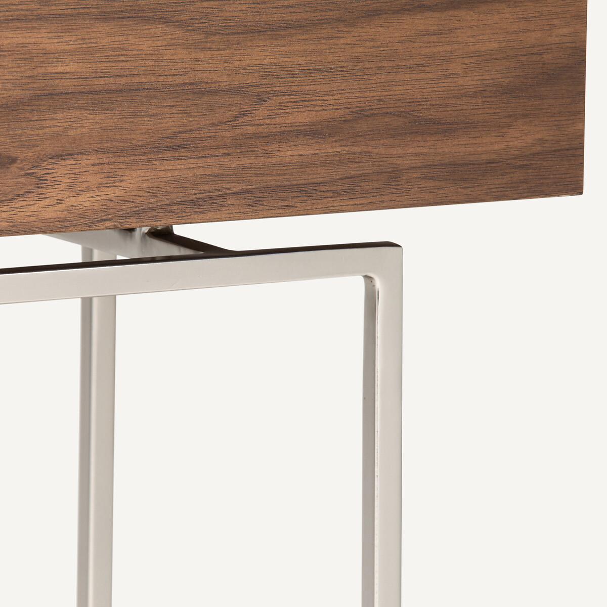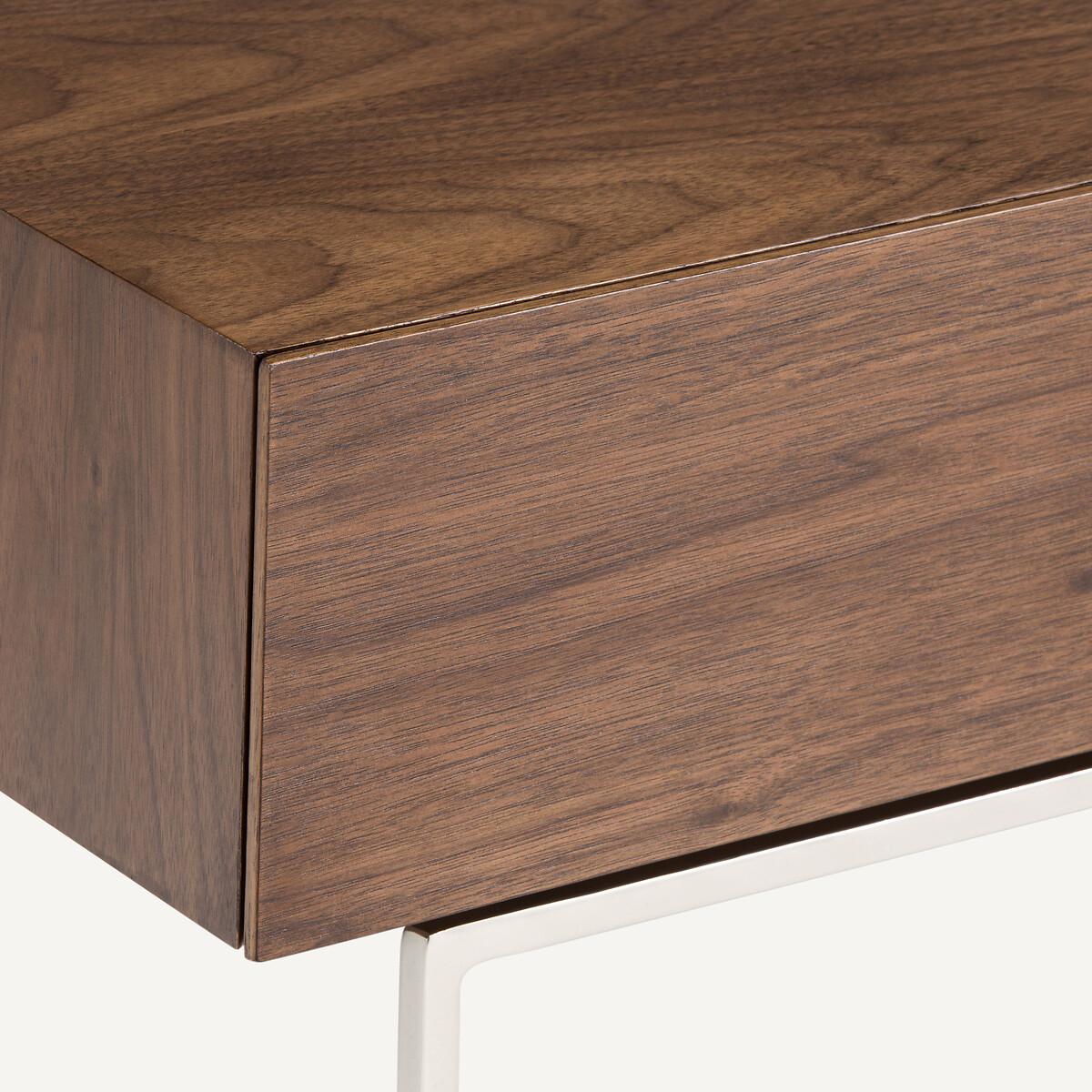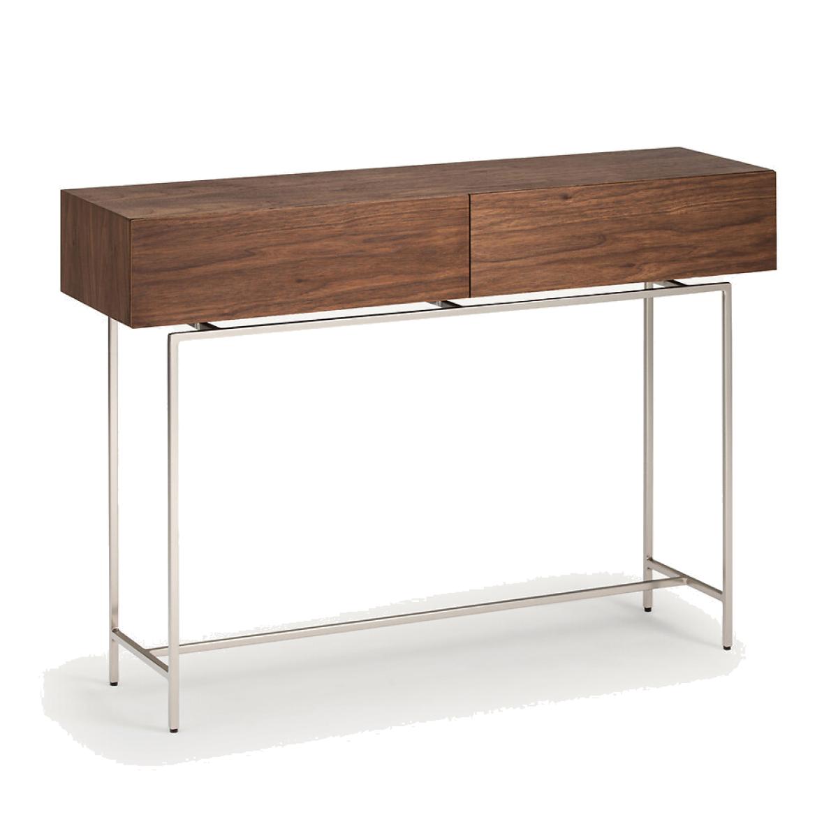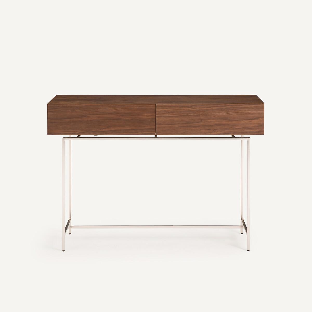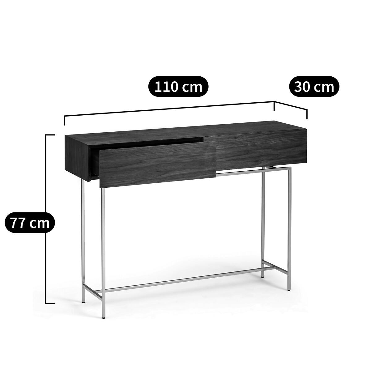 Timeless and light design, walnut veneer, satin nickel finish structure... The Oreko console has a 2-drawer box that seems to float on its metal base. A signature design by AMPM.Product Details • Case and drawers in FSC® walnut veneered MDF with nitrocellulose finish • Steel base with satin nickel finish • 2 drawers with soft closing system. Quality Info • This furniture is equipped with German brand hardware: reliable, discreet and functional. These accessories ensure the longevity of your product. • Soft-closing : soft door closing system, also preventing fingers from getting caught. Dimensions • Width: 110cm • Height: 77cm • Depth: 30cm. Usable dimensions: Drawers : L50 x H7 x D25cmDelivery:. Sold pre-assembled. Available for home delivery. Note! Please check that all access points are large enough to accommodate your delivery (doors, stairs, lifts). • WOOD FROM SUSTAINABLY MANAGED FORESTS. FSC® certified wood comes from forests that are environmentally, socially and economically well managed. Dimensions and weight of parcel../../RTXT_WEB/bull.jpg" />2 parcels • L120 x H25 x D43cm. 23kg • L102.5 x H65 x D33cm. 13kg
