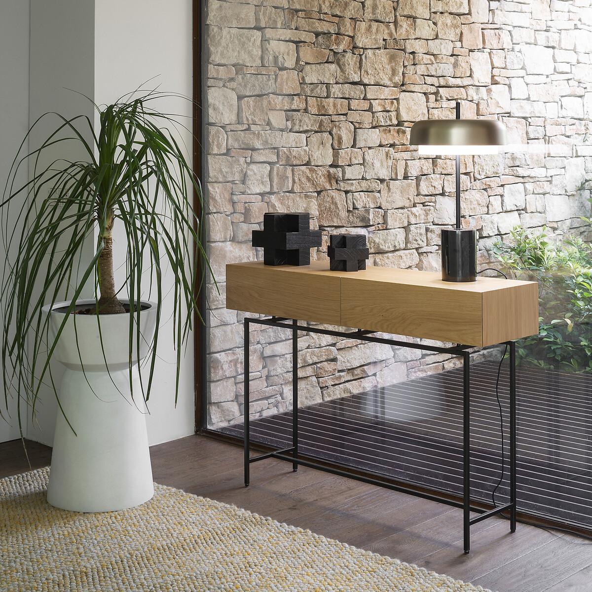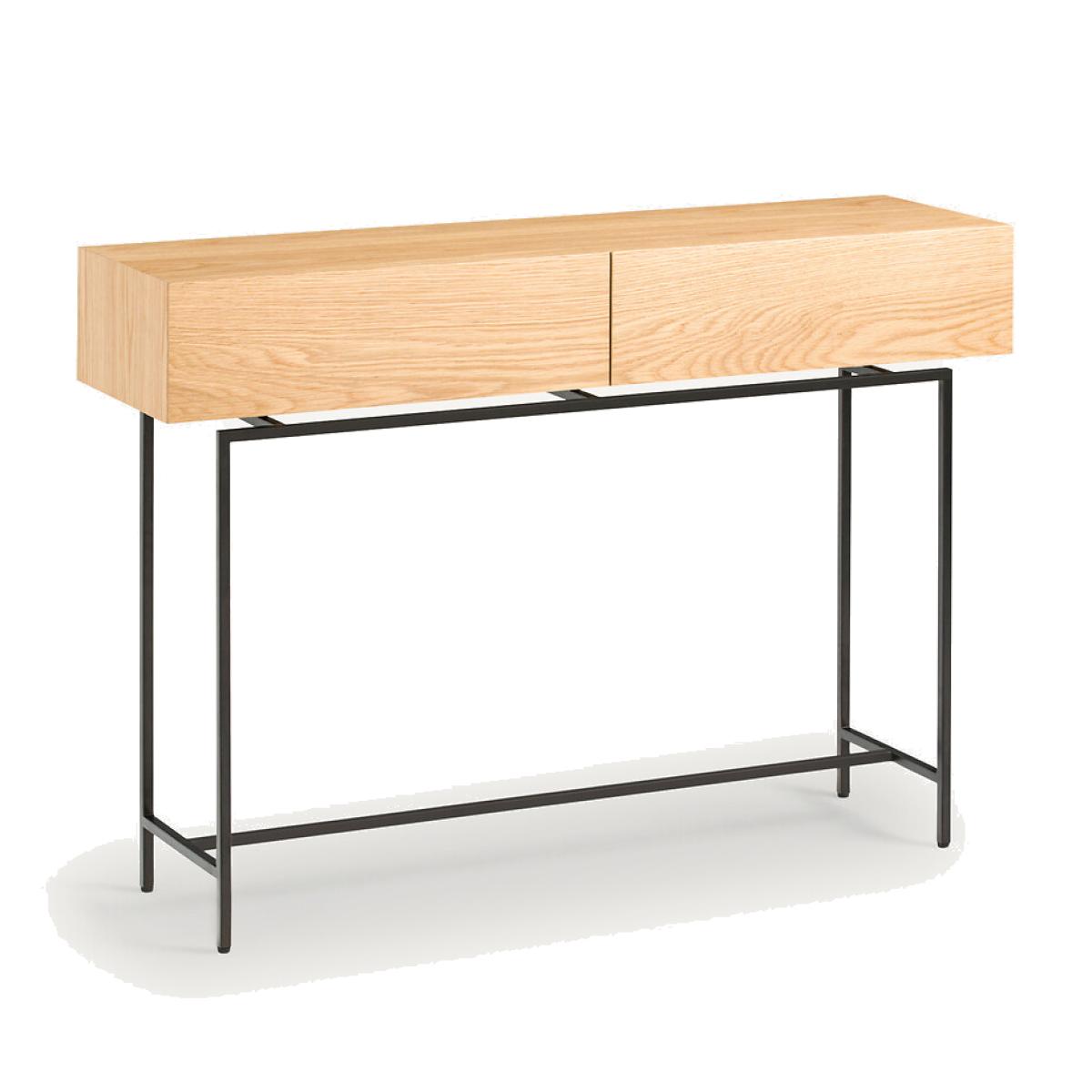 Timeless and airy design... The Oreko console has a 2-drawer unit that seems to float on its metal base. A signature design by AMPM.Product Details • Unit and drawers in FSC® Mixed oak veneered MDF with polyurethane finish • Epoxy finished steel base • 2 drawers with soft closing system. Quality Info • Soft-closing : system for closing doors smoothly, silently, also preventing fingers from getting caught. Dimensions • Width: 110cm • Height: 77cm • Depth: 30.5cmDelivery:. Sold pre-assembled. Available for home delivery. • WOOD FROM MORE SUSTAINABLY MANAGED FORESTS AND CONTROLLED SOURCES. FSC® Mix wood contains at least 70% FSC® certified and/or recycled wood, the remainder being FSC® controlled wood. Dimensions and weight of parcel • 1 parcel • L120 x H71 x D33cm. 29kg