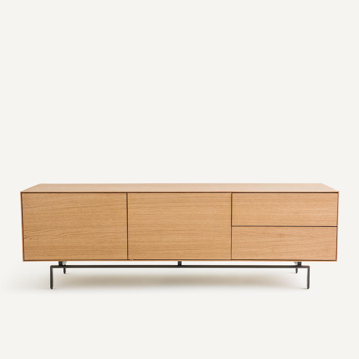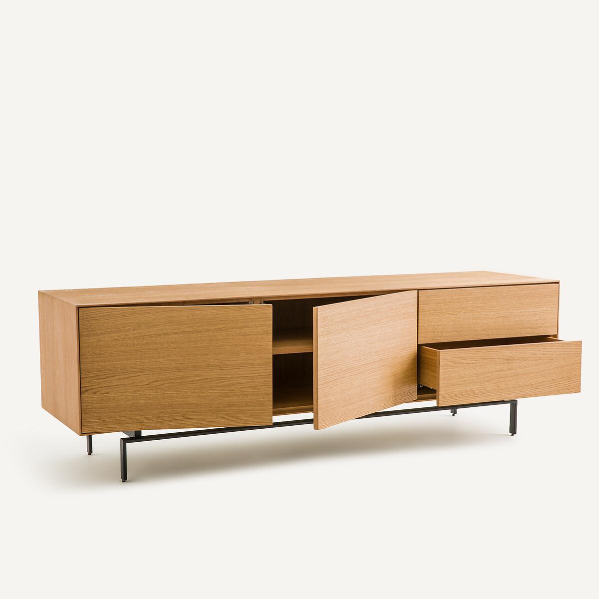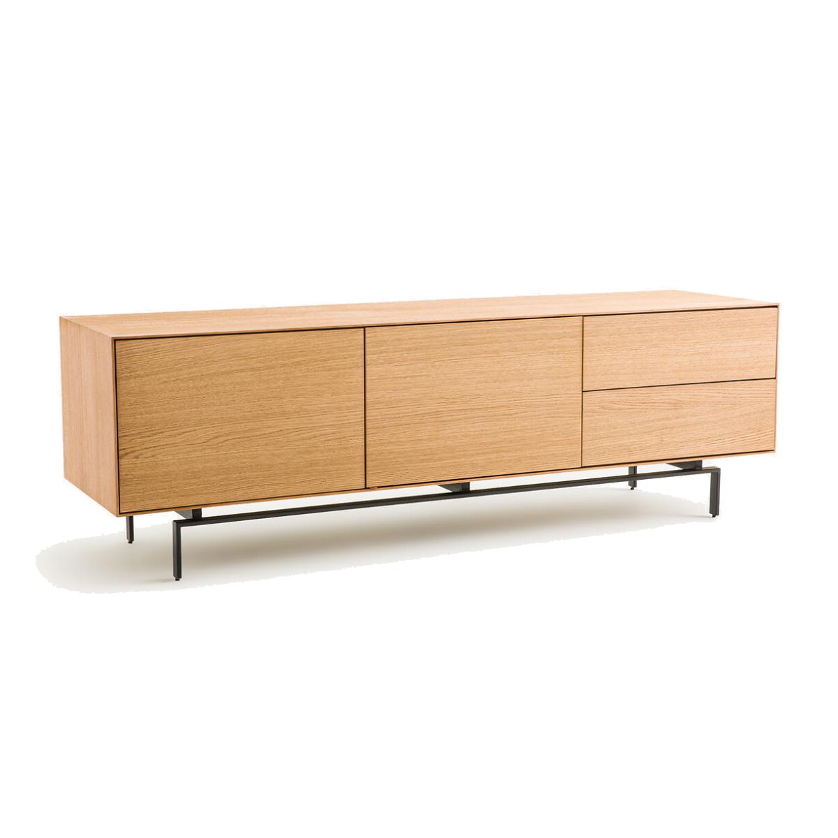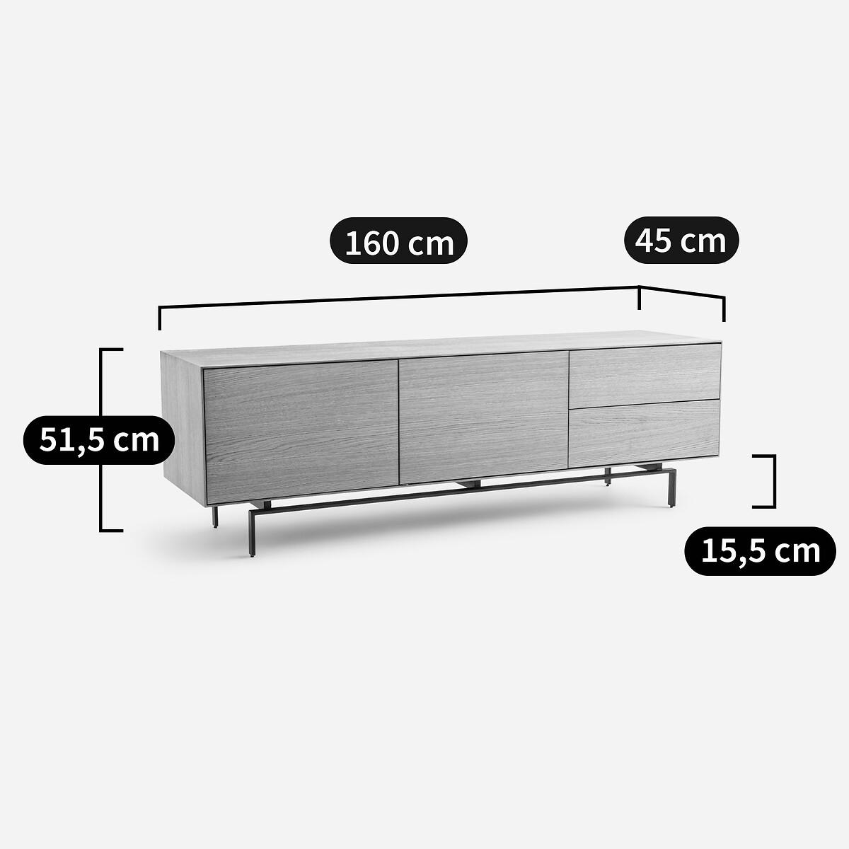 Timeless, airy design, top-of-the-range hardware... The Oreko TV unit features a 2-door, 2-drawer pedestal that appears to float on its metal base. A signature design by AMPM.Product Details • Box, doors and drawers in oak veneered MDF, polyurethane finish • Steel base, epoxy finish • 2 drawers with push/pull closing system • 2 height-adjustable and removable shelves behind the 2 doors • 2 cable entry slots. Quality • Push/pull opening system: light pressure on the door allows it to be opened or closed without a handle. • This furniture is equipped with German brand hardware: reliable, discreet and functional. These accessories ensure the longevity of your product. Dimensions Total • Length: 160cm • Height: 51.5cm • Depth: 45cm • Base height: 15.5cm. Usable dimensions • Drawer:W46.7 x H10.2 x D33.5cm • Niche behind each door (excluding shelves) :W56 x H36 x D40cm • Sold pre- assembled. • WOOD FROM SUSTAINABLY MANAGED FORESTS. FSC® certified wood comes from forests that are environmentally, socially and economically well managed. Dimensions and weight of parcel1 parcel • W70 x H62 x D54cm, 68kg