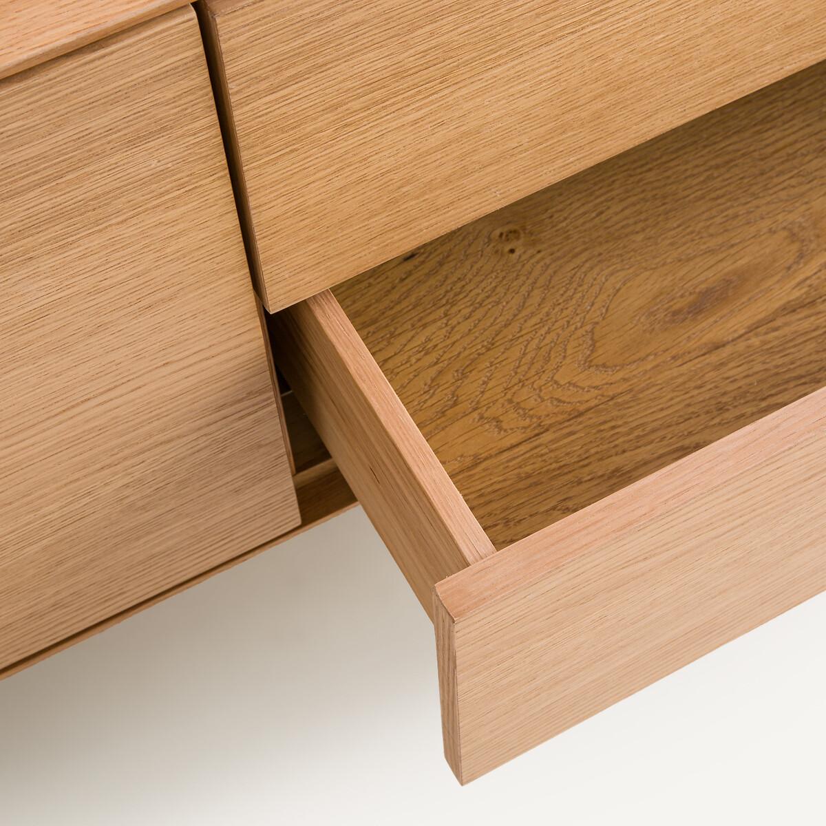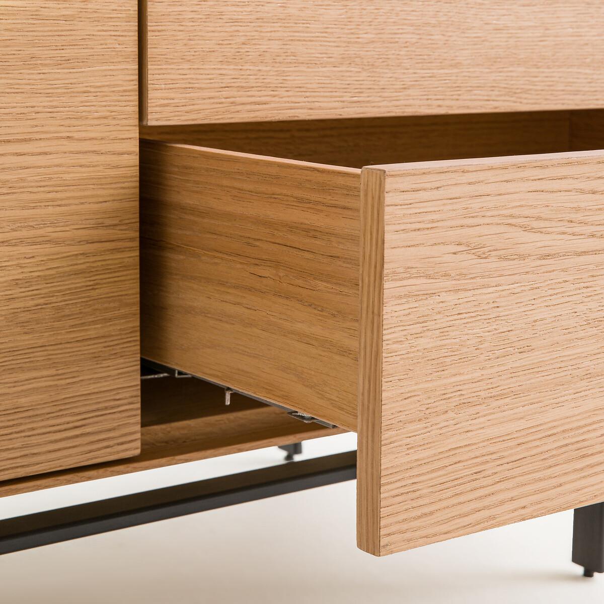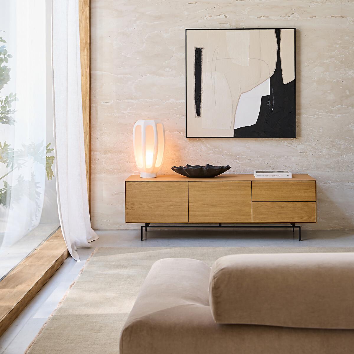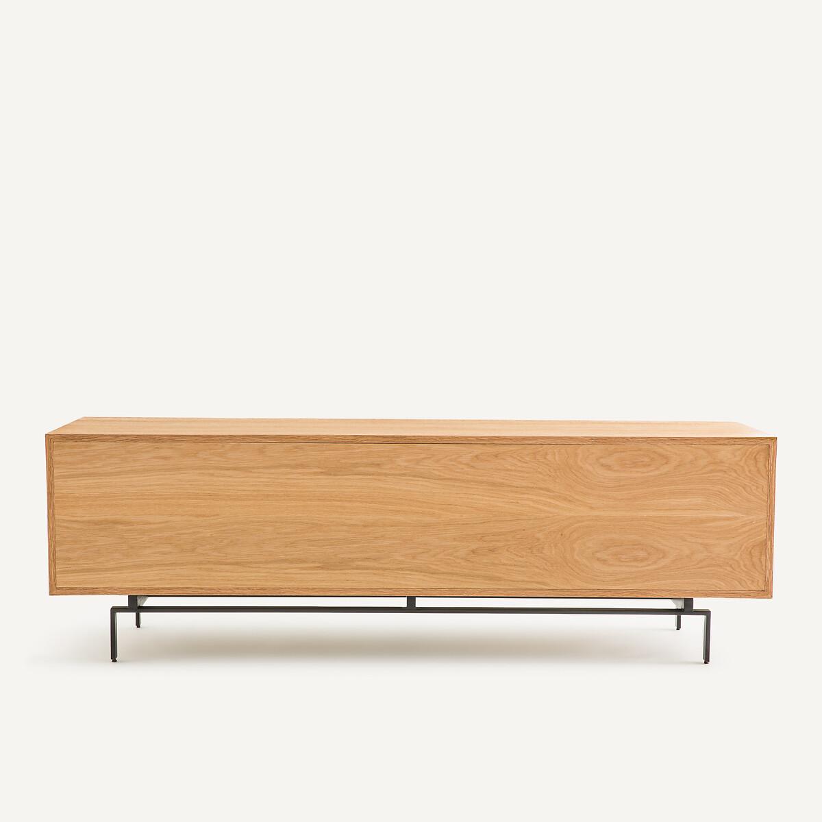 Timeless, airy design, top-of-the-range hardware... The Oreko TV unit features a 2-door, 2-drawer pedestal that appears to float on its metal base. A signature design by AMPM.Product Details • Box, doors and drawers in oak veneered MDF, polyurethane finish • Steel base, epoxy finish • 2 drawers with push/pull closing system • 2 height-adjustable and removable shelves behind the 2 doors • 2 cable entry slots. Quality • Push/pull opening system: light pressure on the door allows it to be opened or closed without a handle. • This furniture is equipped with German brand hardware: reliable, discreet and functional. These accessories ensure the longevity of your product. Dimensions Total • Length: 160cm • Height: 51.5cm • Depth: 45cm • Base height: 15.5cm. Usable dimensions • Drawer:W46.7 x H10.2 x D33.5cm • Niche behind each door (excluding shelves) :W56 x H36 x D40cm • Sold pre- assembled. • WOOD FROM SUSTAINABLY MANAGED FORESTS. FSC® certified wood comes from forests that are environmentally, socially and economically well managed. Dimensions and weight of parcel1 parcel • W70 x H62 x D54cm, 68kg