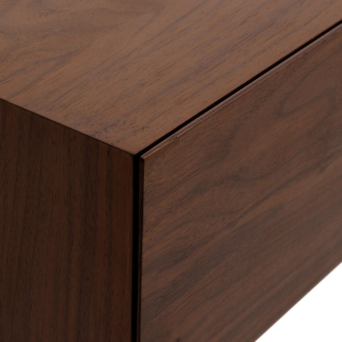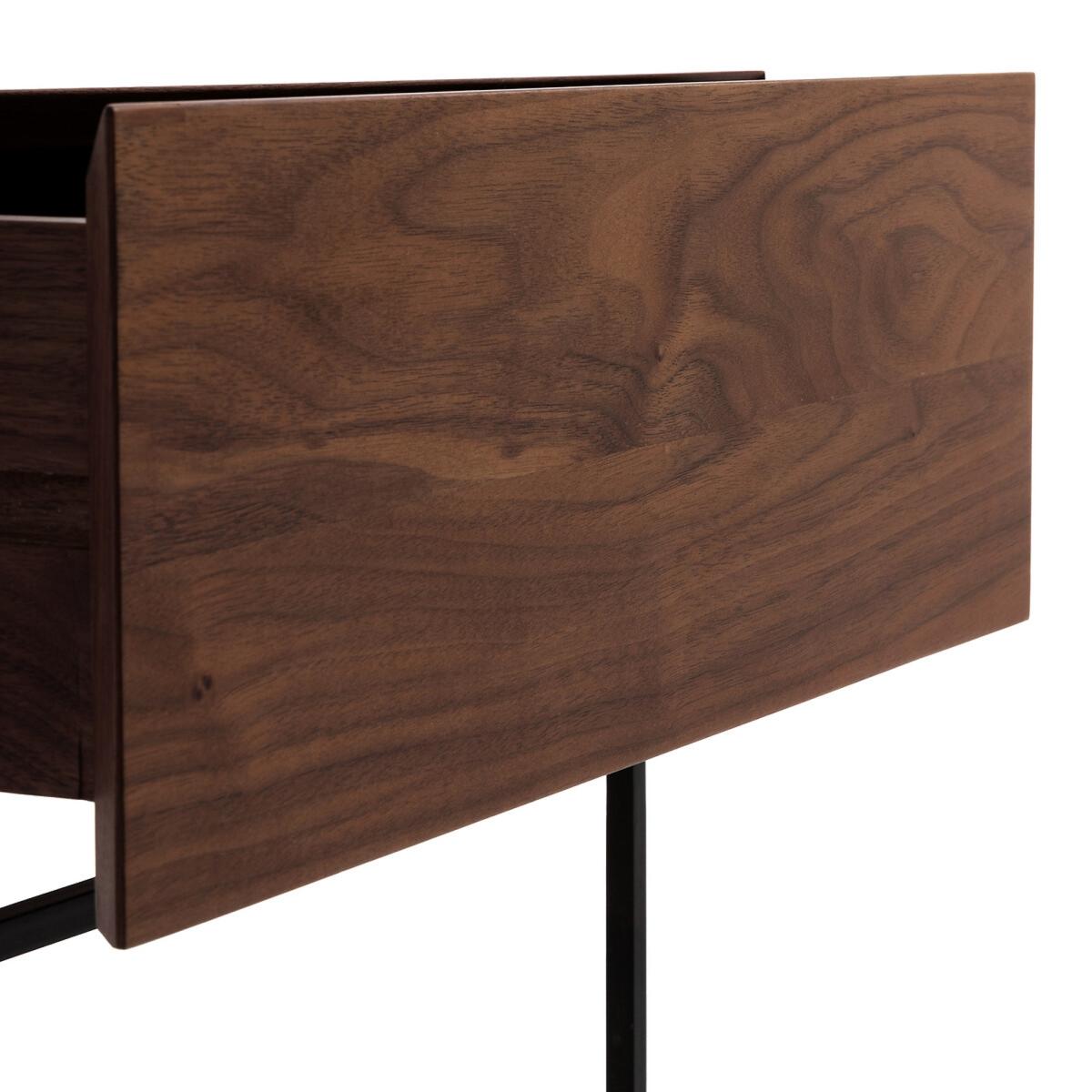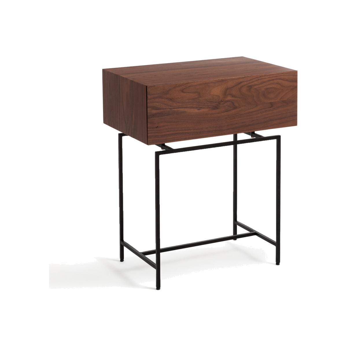 I love this side table for its sleek combination of natural walnut veneer and minimalist black metal base, making it versatile enough for both contemporary and scandinavian interiors. It works well as a bedside table or a spot for displaying a few decorative accents in a living room. When styling, consider pairing it with warm textiles or metallic accessories to highlight the wood’s rich tone, and keep neighbouring surfaces clear to let its simplicity shine. Its compact size makes it practical in smaller spaces, but it can also serve as a statement piece in more open plans when styled thoughtfully.