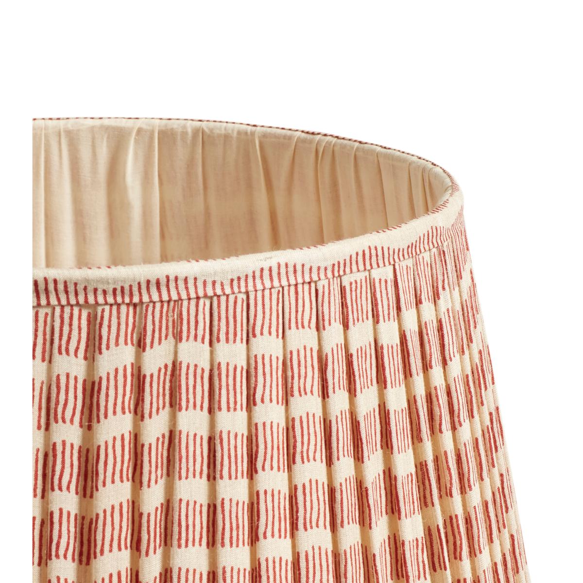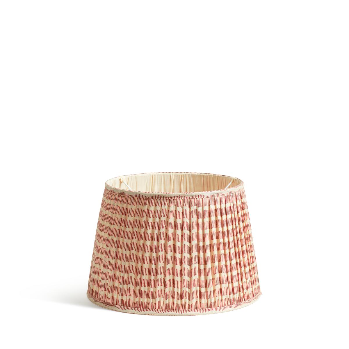 Our handmade Orford Lampshade has a pretty waving stripe pattern running around its handwoven tussar silk base. The contemporary stripe design is hand block printed in a dusky red tone on the natural silk, then pleated around an iron frame for a more classic appearance. It’s lined and finished with a border of the same striped silk. This is the larger of two sizes.