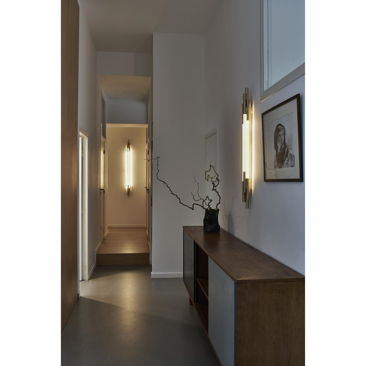 Inspired by science fiction and astronomy, German designer Sebastian Summa created his ORG lamp like a shooting star. This destructured composition of glass and gold metal tubes offers a mix of classic elegance and originality. A true chameleon with a hybrid aesthetic, ORG blends in with all styles of decor, moving with ease from industrial, rough spaces to sophisticated settings. Its large dimensions make it a leading architectural element. A true light rod, the ORG wall lamp provides strong decorative value. Its refined yet quirky look will modernise any interior. Reminiscent of neon tubes, the ORG wall lamp forms an asymmetrical cluster of opaline glass tubes, adorned with gilded metal end caps. The minimalist white tubes are illuminated along their entire length. The light emitted is soft, warm and glare-free. The ORG wall lamp can be positioned vertically or horizontally. Designer Sebastian Summa works in his studio in East Berlin. He’s a hands-on man who started his career as a blacksmith, and served as an apprentice in a metalworking factory before going to university. In his timeless workshop with its basic appearance, this sensitive man creates surprisingly delicate objects.