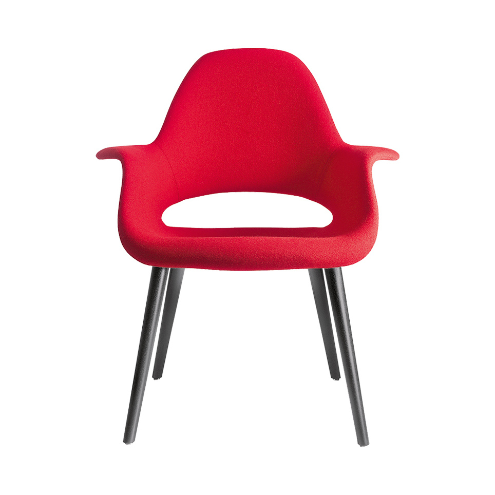 Conceptualised by legendary designers Charles Eames and Eero Saarinen in 1940, the Organic Chair in red boldly experiments with organic shapes and vibrant colour. A cutting-edge design for its time, the chair maintains a contemporary feel, and exemplifies the ethos of the Eames works: incorporating simplicity, comfort and functionality. The hopsack fabric upholstery covers the laminated shell seat, and rests upon sturdy black-stained beech legs. Celebrated for their innovative and cutting-edge designs, Charles Eames and Eero Saarinen first submitted the Organic Chair as a joint entry to MOMA's Organic Design in Home Furnishings competition in New York.