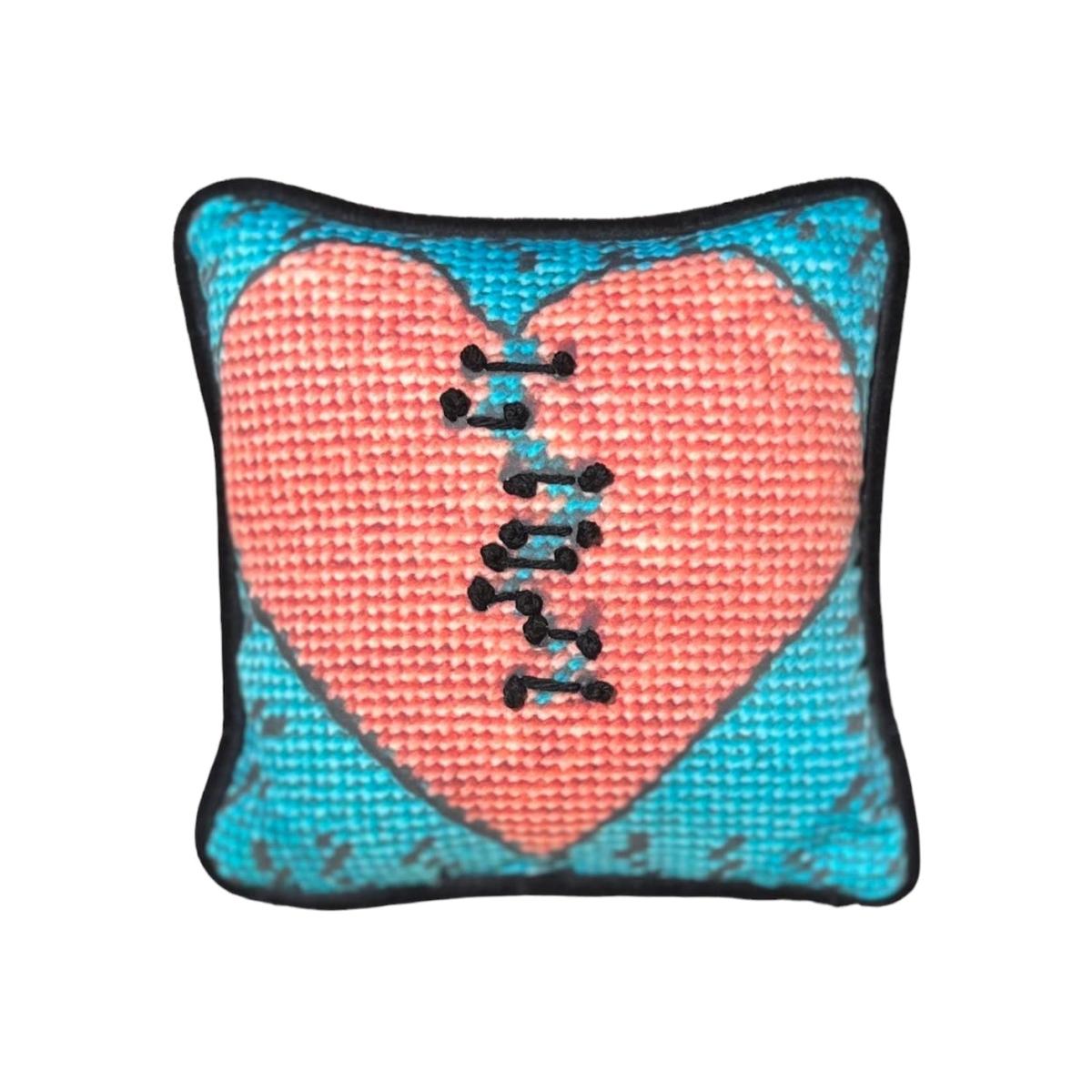 not needlepoint A perfect encouragement pillow for anyone whose little heart has been broken. The happy colors and symbolic design assure that the heart will heal. Pillow face is organic cotton sateen with hand-embroidered French knots connecting and mending the heart. custom made with crazy heart and soul delivered new to you in eco-friendly packaging remove pillow insert dry clean private label organic cotton sateen face digitally printed in the US using eco-friendly water-based inks Persian wool tapestry French knots ink black designer velvet welting and reverse velvet is 100% polyester blended down pillow insert invisible zipper