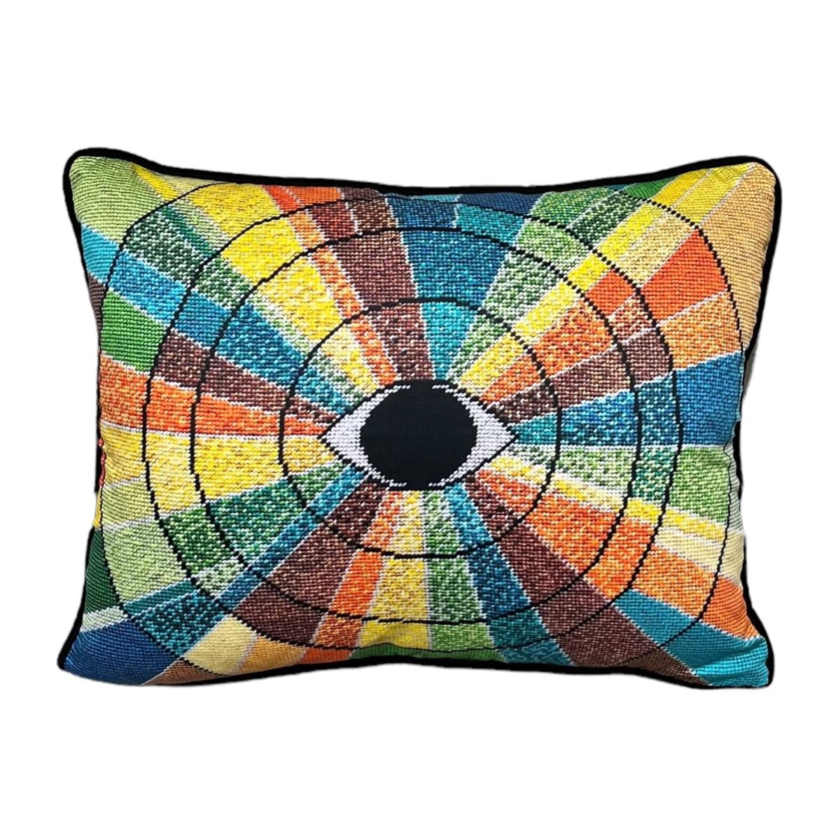 not needlepoint Influenced by the mid-century modernity of Palm Springs! custom made with crazy heart and soul delivered new to you in eco-friendly packaging remove pillow insert dry clean private label organic cotton sateen face digitally printed in the US using eco-friendly water-based inks ink black designer velvet welting and reverse velvet is 100% polyester feather down pillow insert invisible zipper