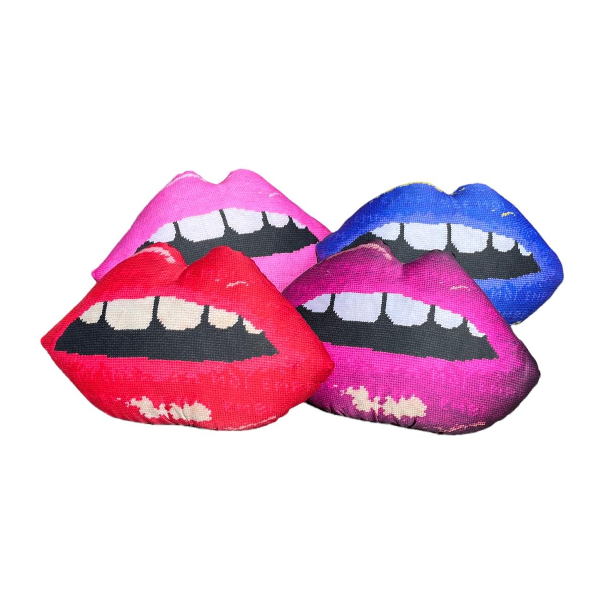 not needlepoint Because, why not? Keep them together or toss them in every room! Set includes four "Embrasse Moi" pillows - red, girly-girl pink, magenta and blue-violet. custom made with crazy heart and soul delivered new to you in eco-friendly packaging dry clean organic cotton sateen, a beautiful fabric reproduction of our original needlepoint art designer velvet reverse, 100% polyester blended down pillow insert, 50% down / 50% poly fiber hand sewn closed at the bottom