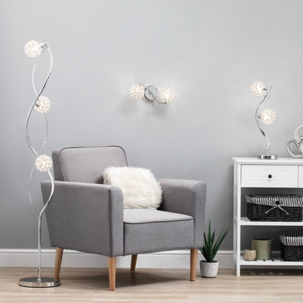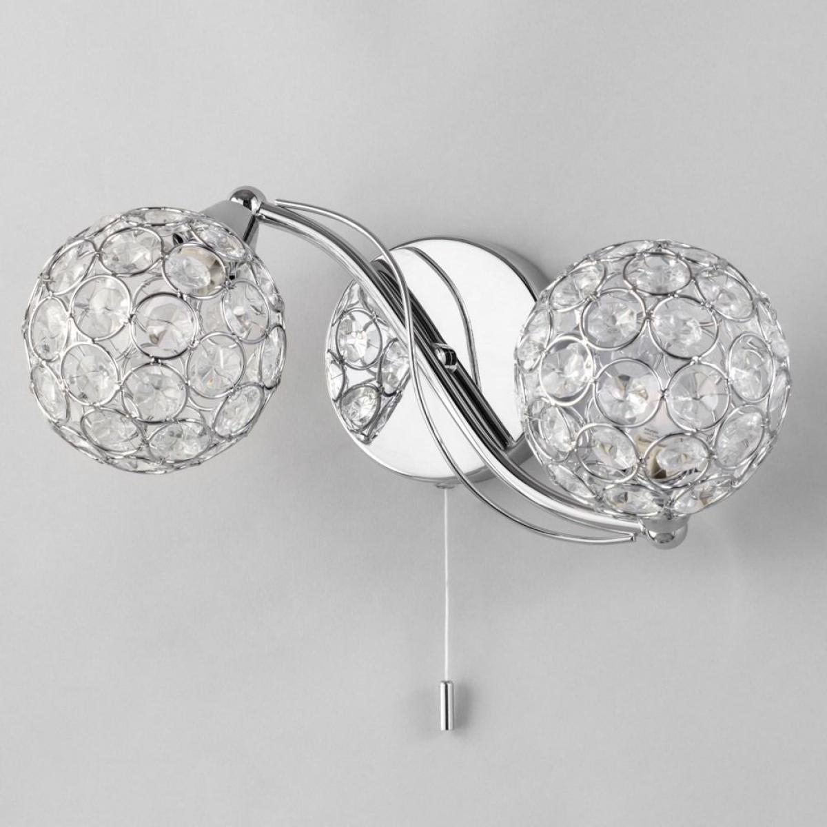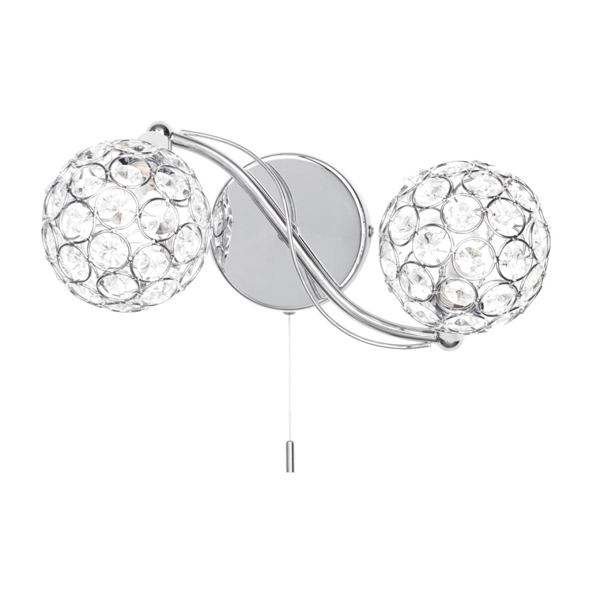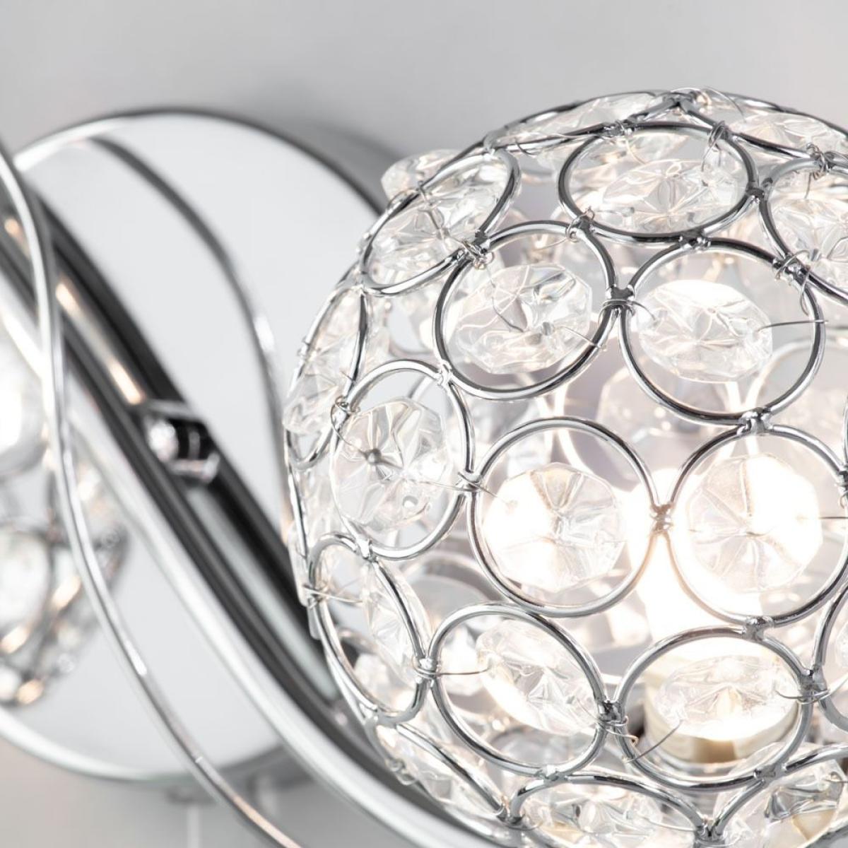 Orianna is an elegant wall fitting for your modern home, giving great light to any room while doubling as a stylish wall decoration. The 2 curling arms in a beautiful chrome finish give the wall light an elegant aesthetic. The arms lead to 2 ball-shaped shades at the end, which surround the light to give a unique sparkle as the light shines out through the crystal decoration.