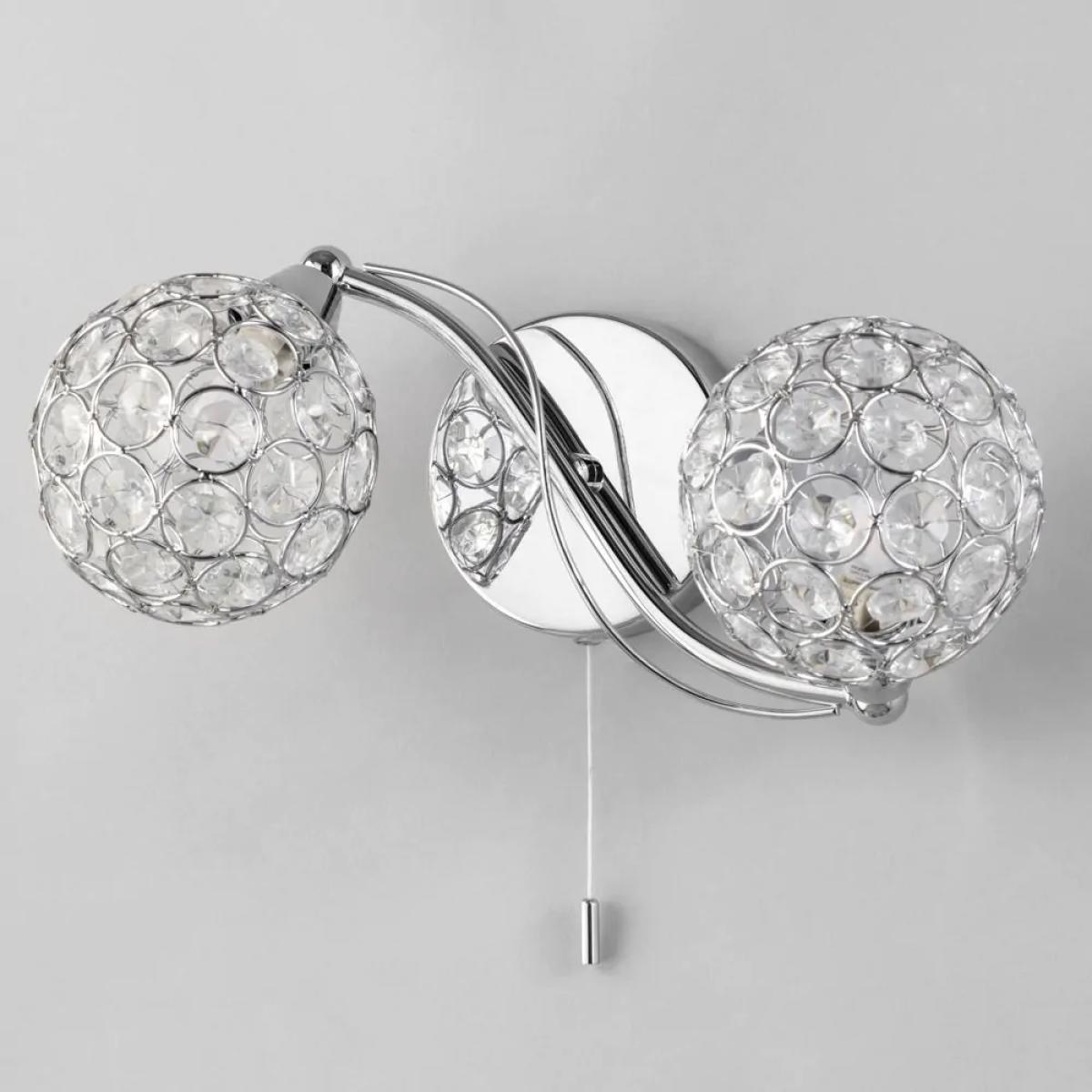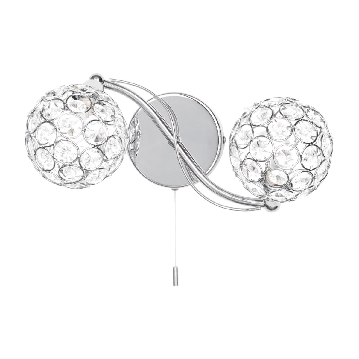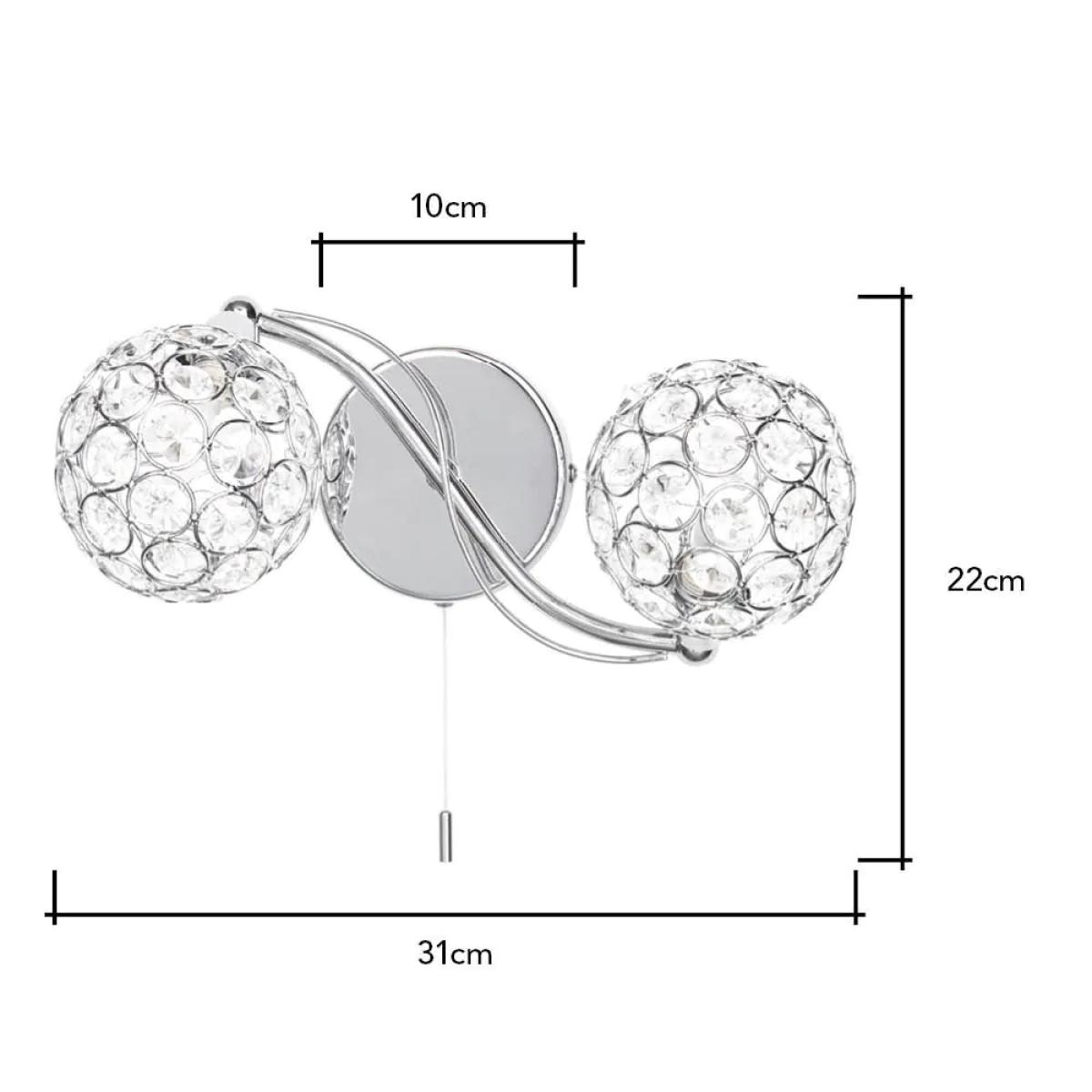 Orianna is an elegant wall fitting for your modern home, giving great light to any room while doubling as a stylish wall decoration. The 2 curling arms in a beautiful chrome finish give the wall light an elegant aesthetic. The arms lead to 2 ball-shaped shades at the end, which surround the light to give a unique sparkle as the light shines out through the crystal decoration.