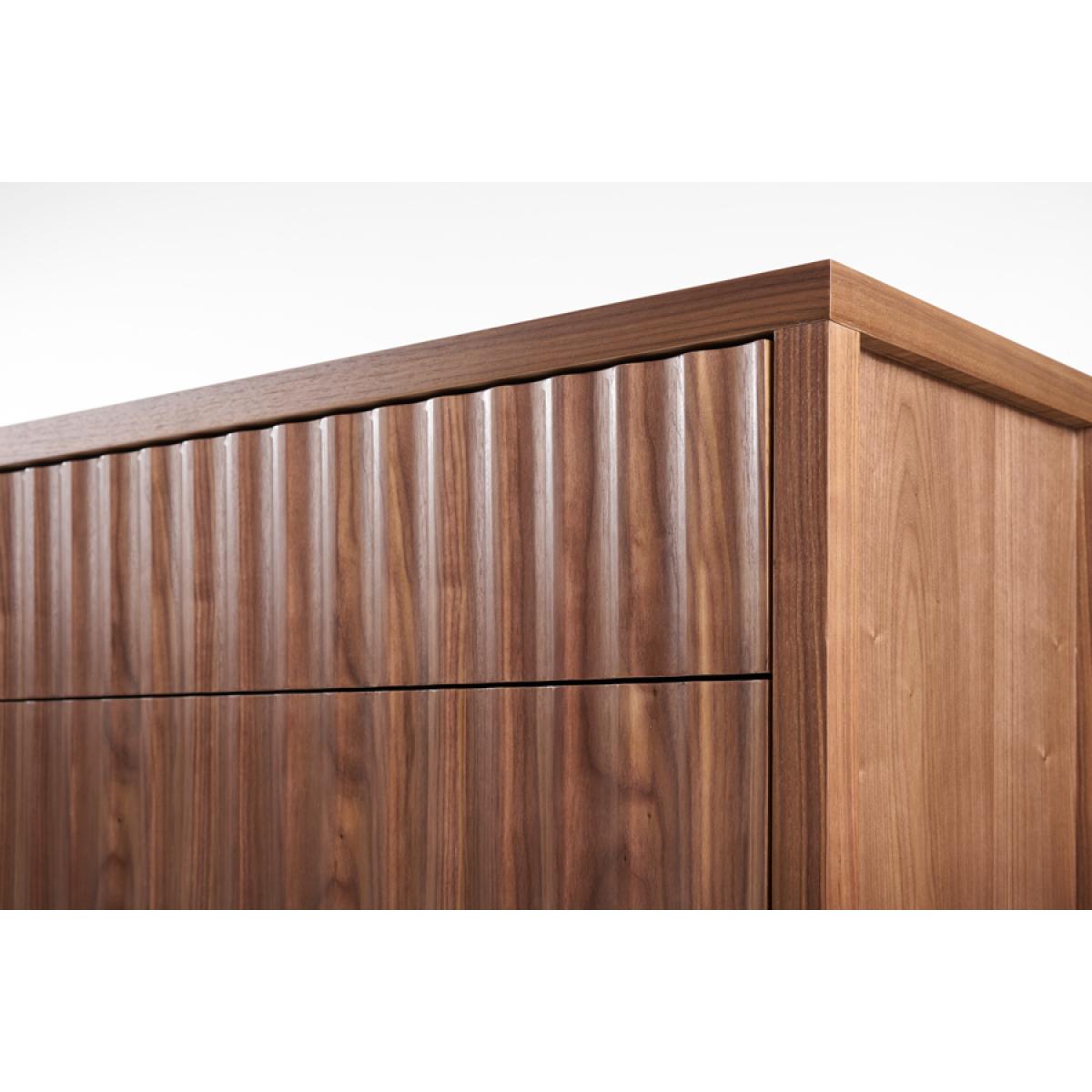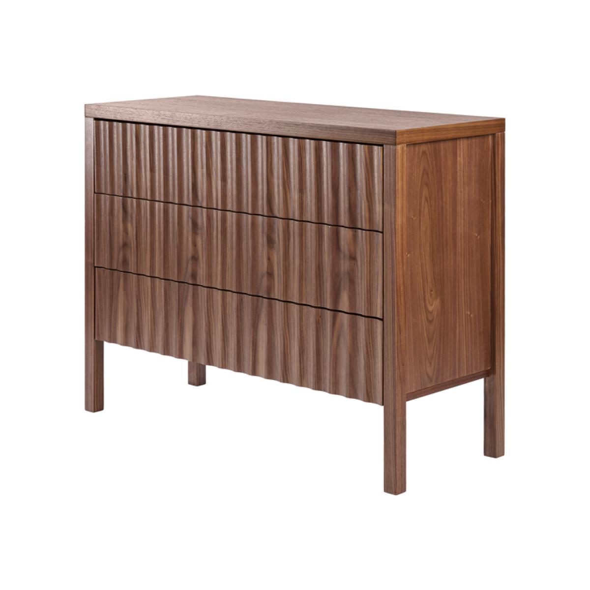 An elegant and striking contemporary chest of drawers. Solid oak construction with walnut veneer finish. Three spacious push-catch drawers with soft-close runners. Sculptural reeded detailing to drawer fronts. Supplied fully assembled.